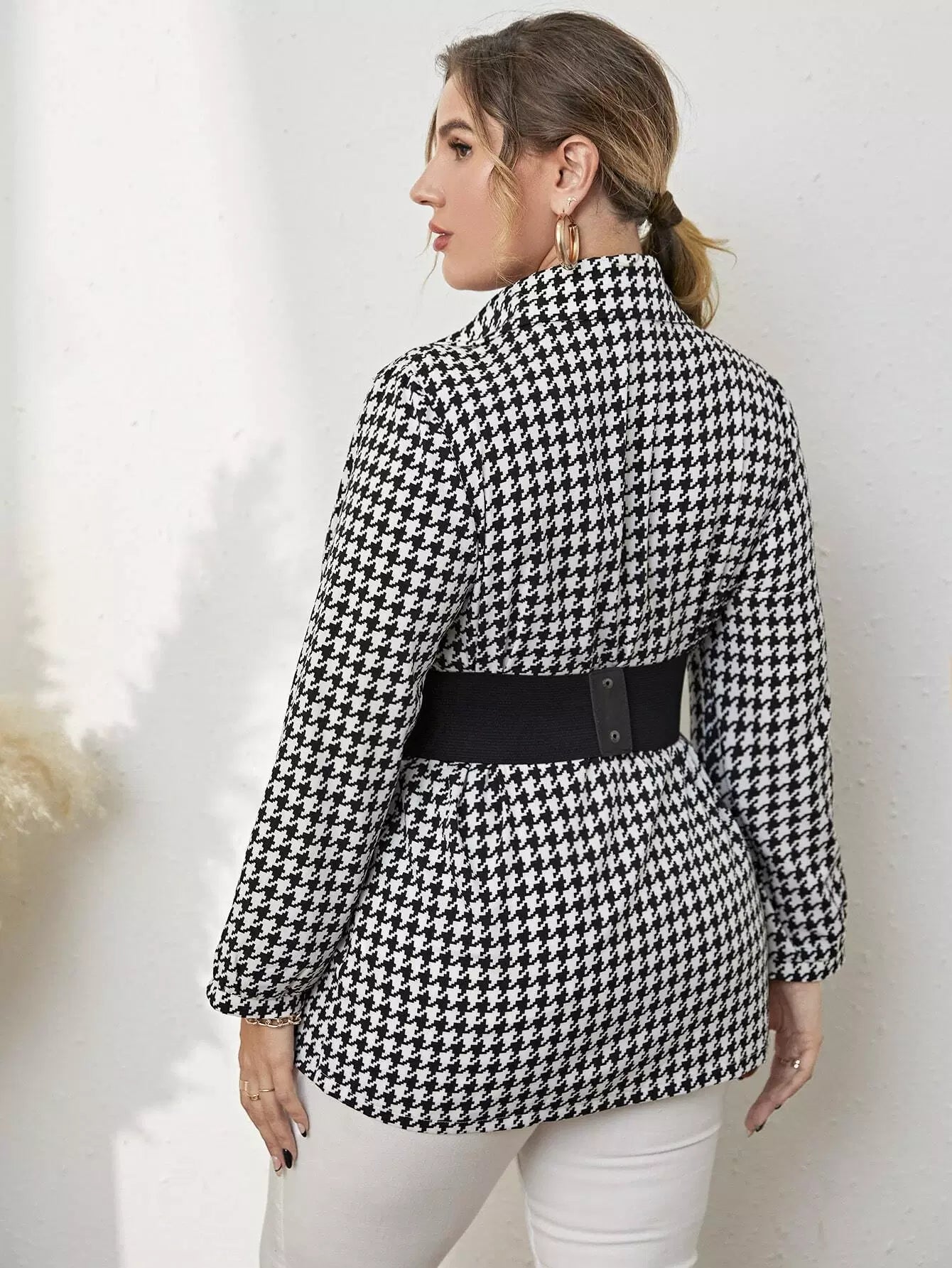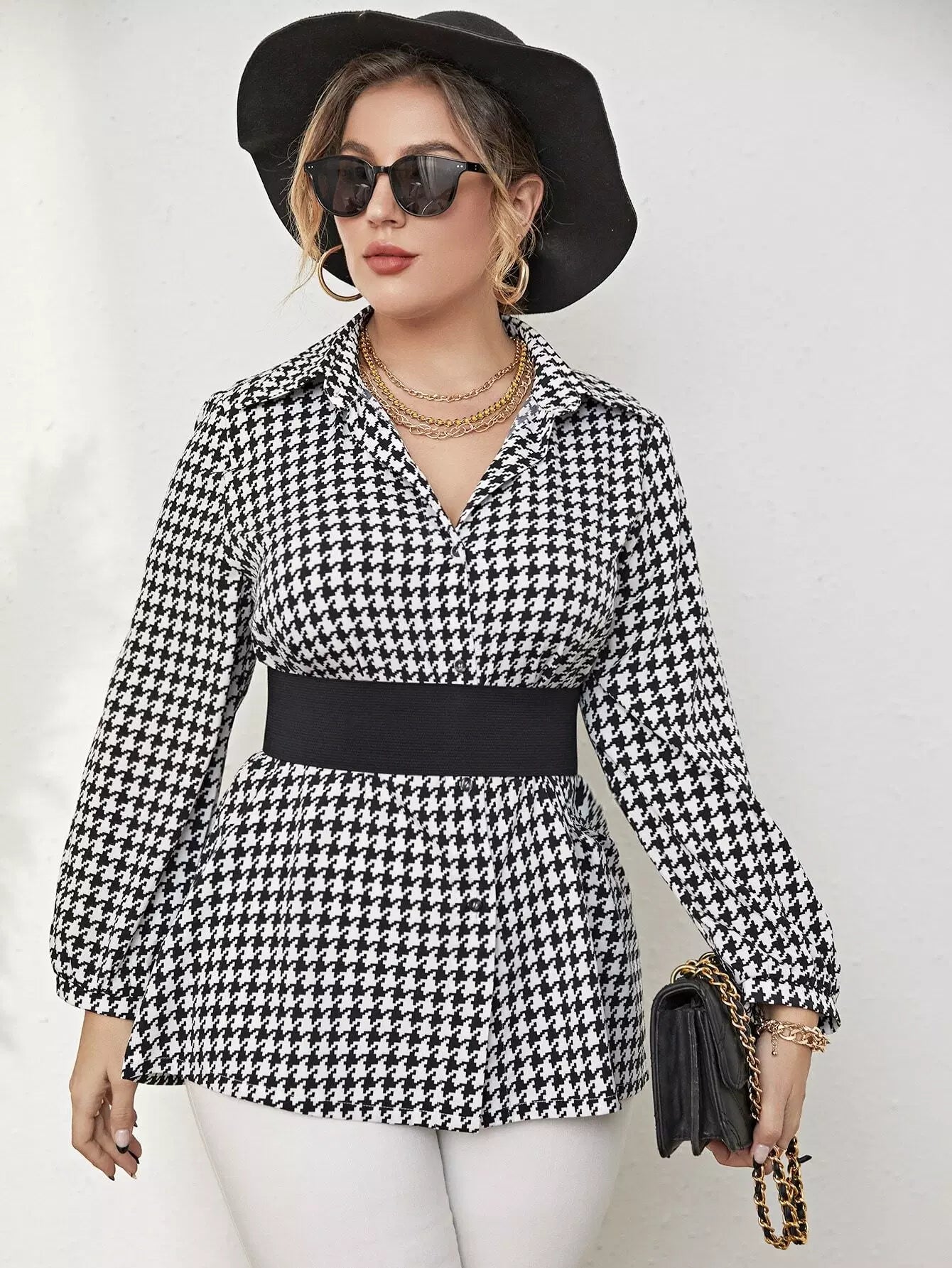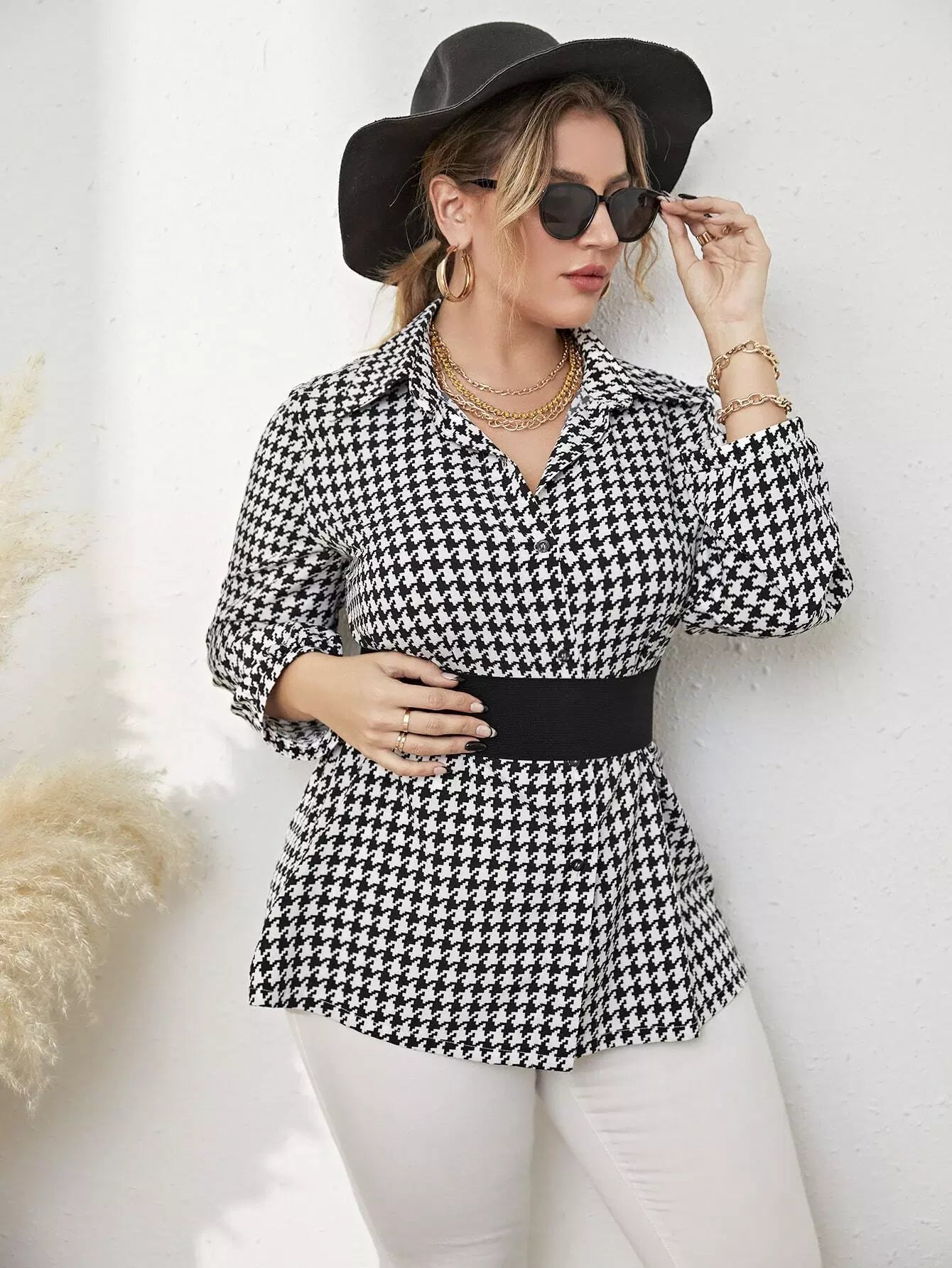 Plus Houndstooth Print Blouse Without Belt
