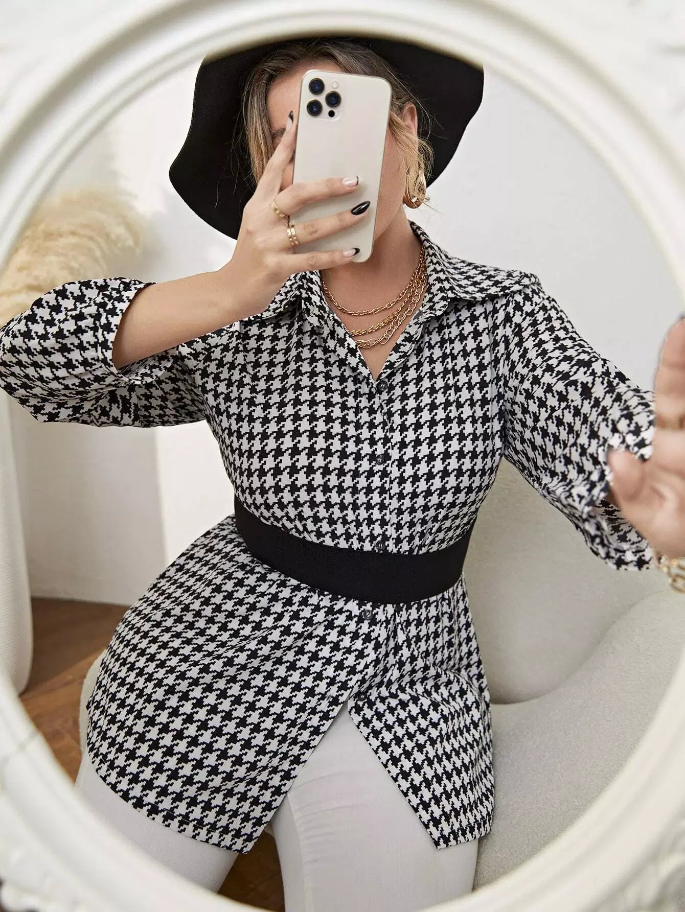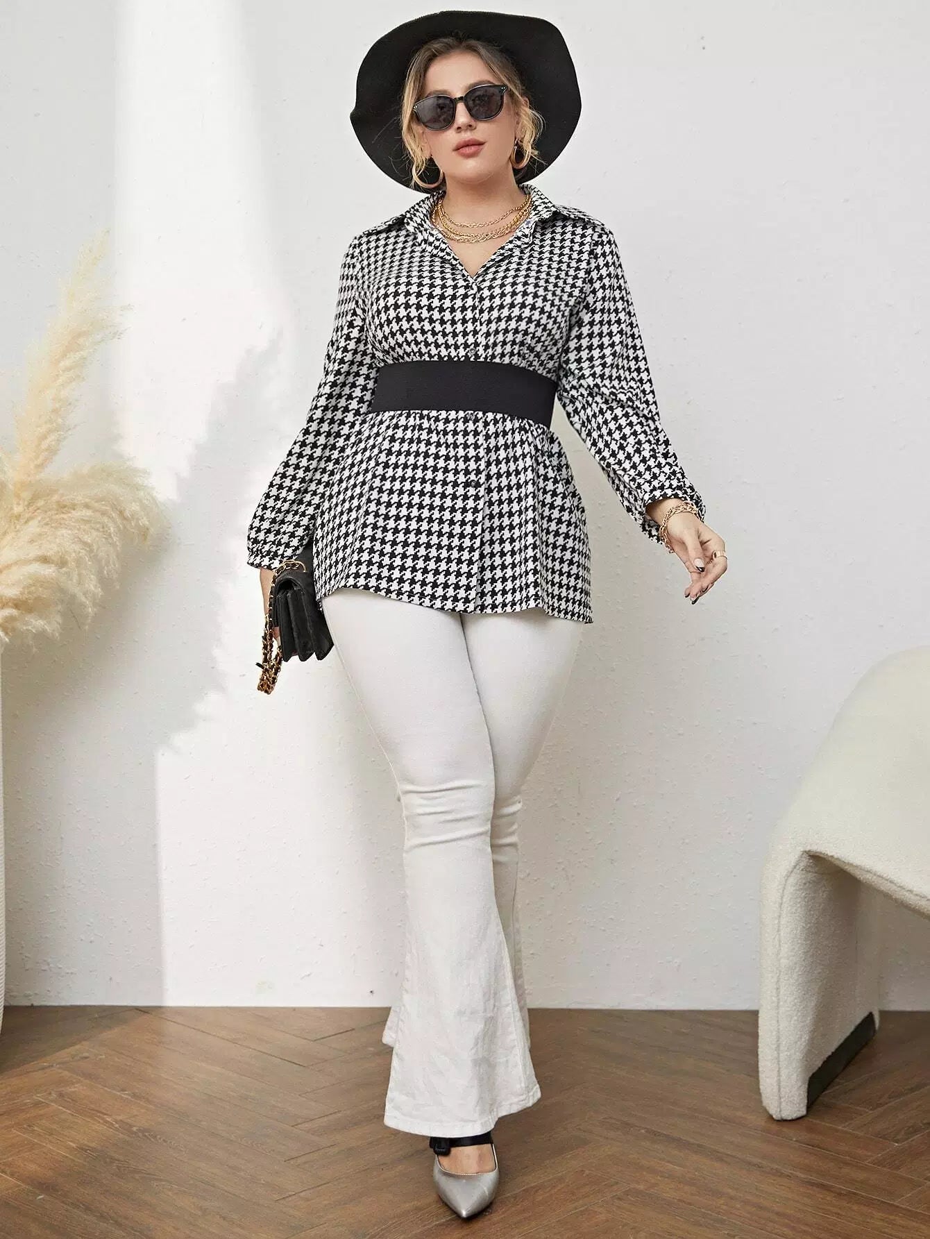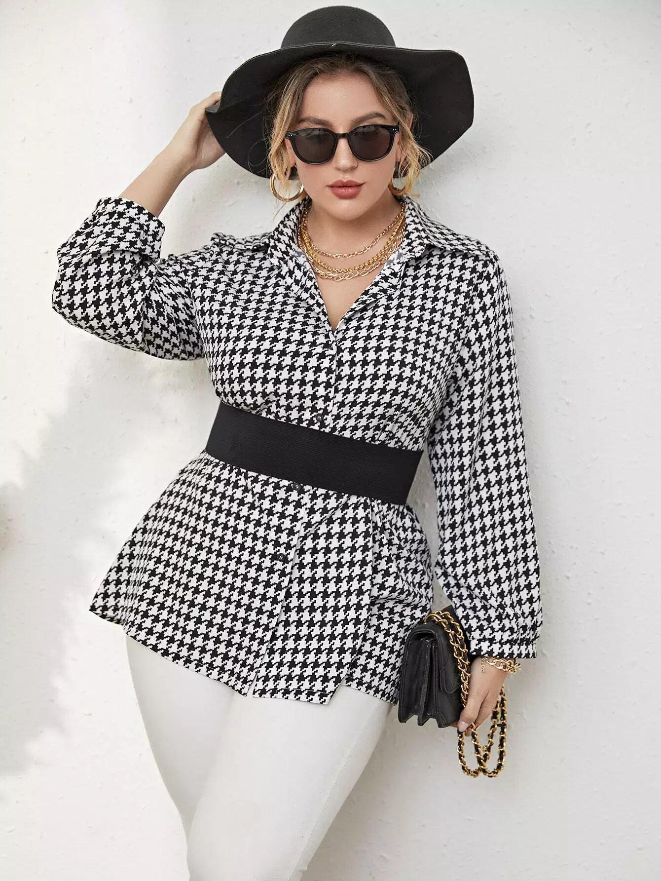 Plus Houndstooth Print Blouse Without Belt