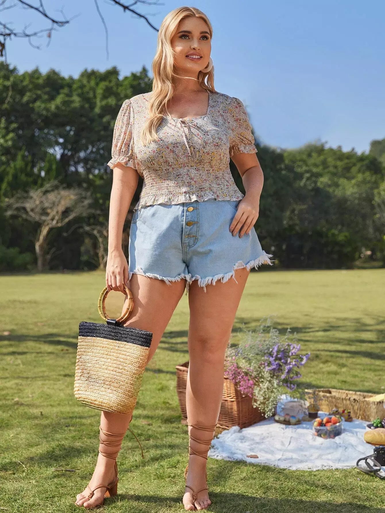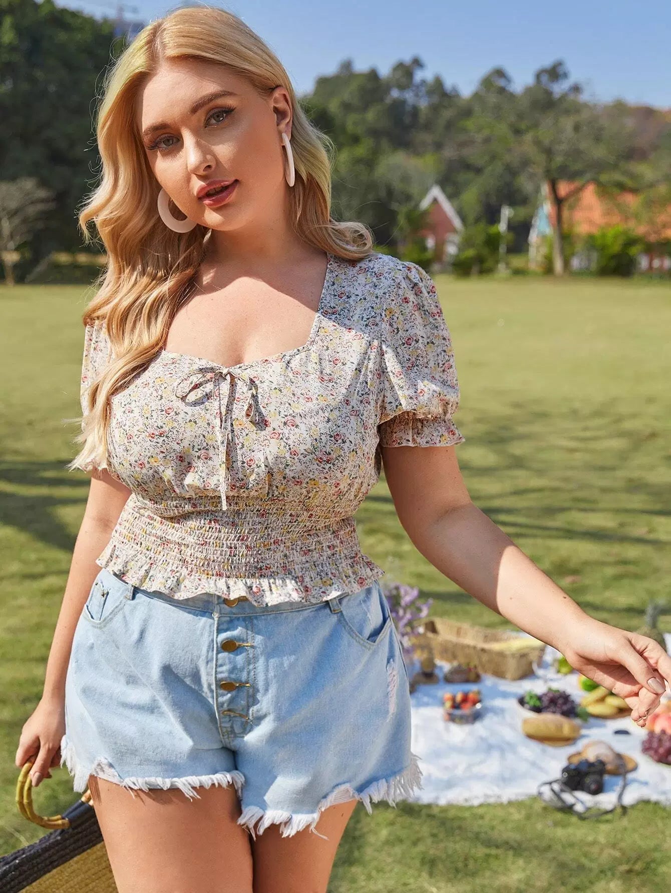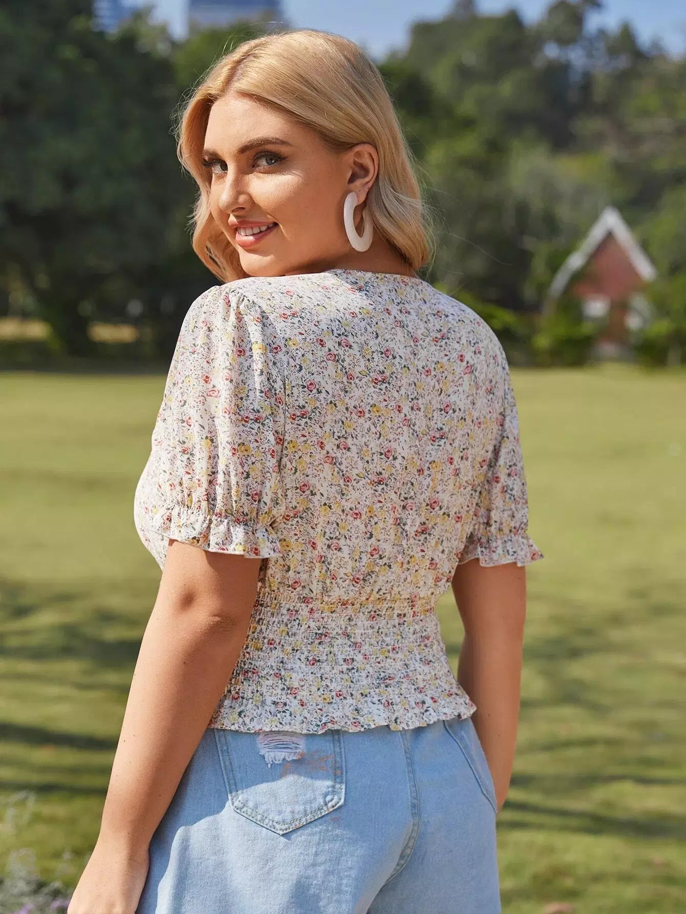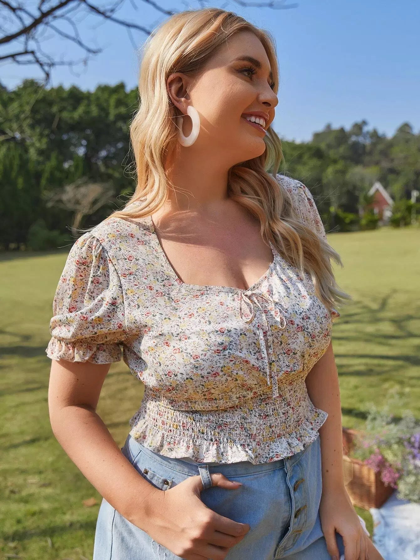 Plus Size Clothing - Plus Knot Front Shirred Ditsy Floral Milkmaid Blouse