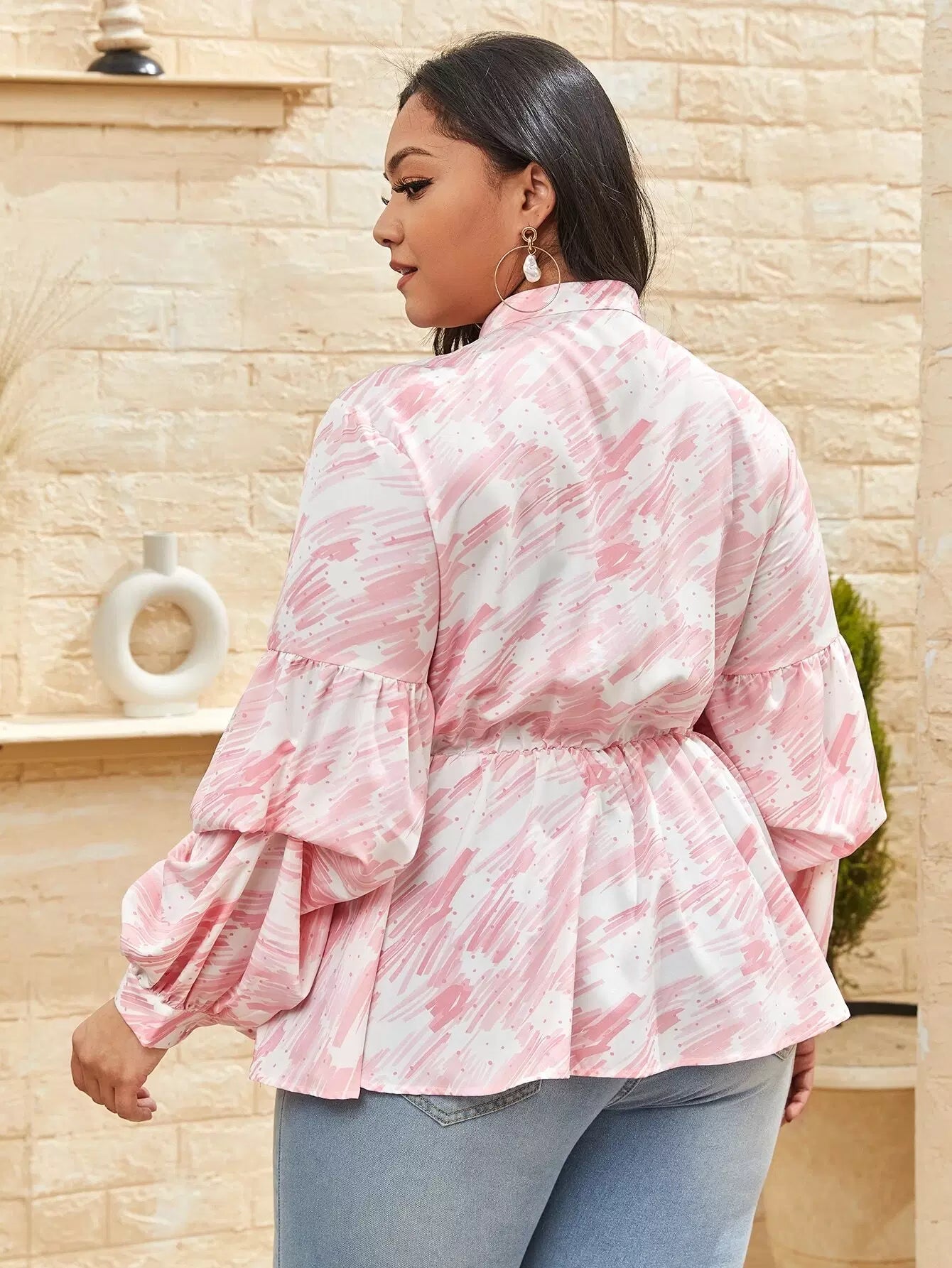 Plus Lantern Sleeve Buttoned Front Brush Stroke Print Blouse