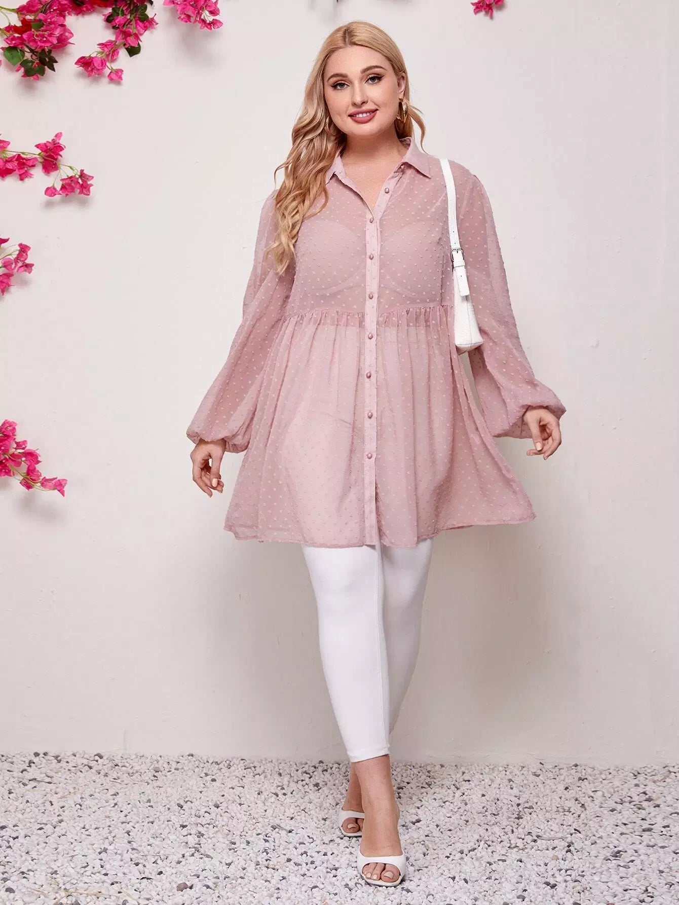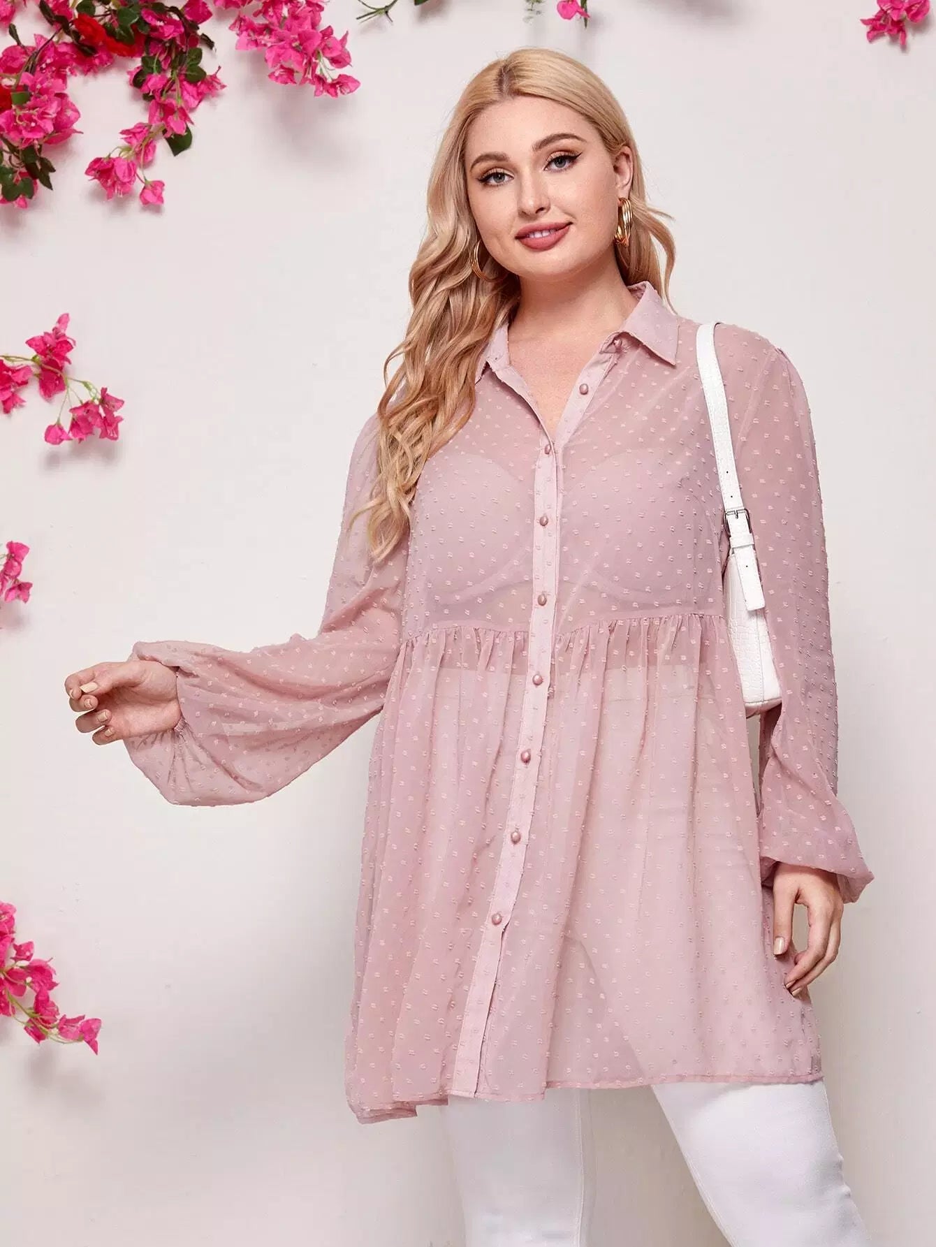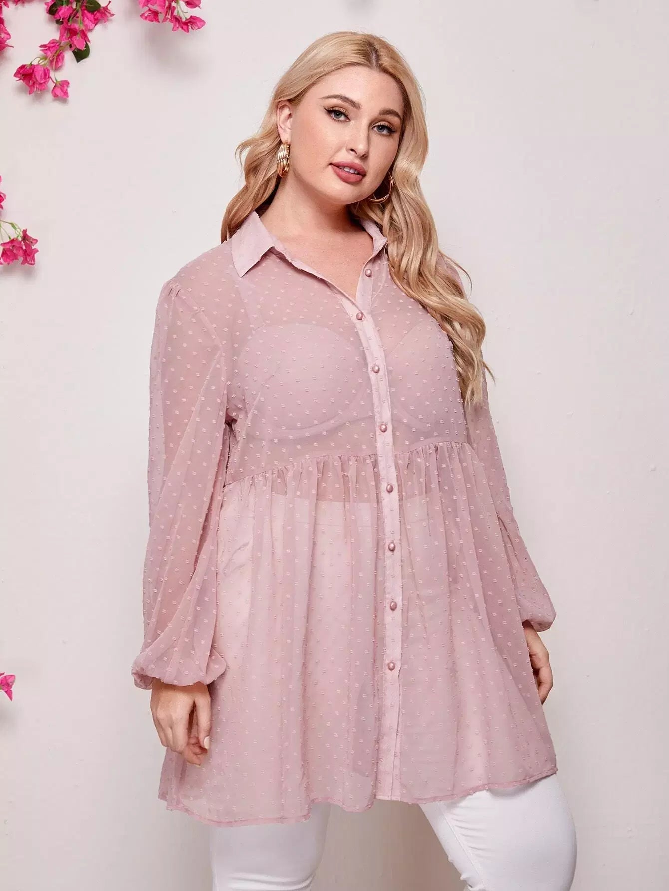 Plus Lantern Sleeve Buttoned Sheer Blouse