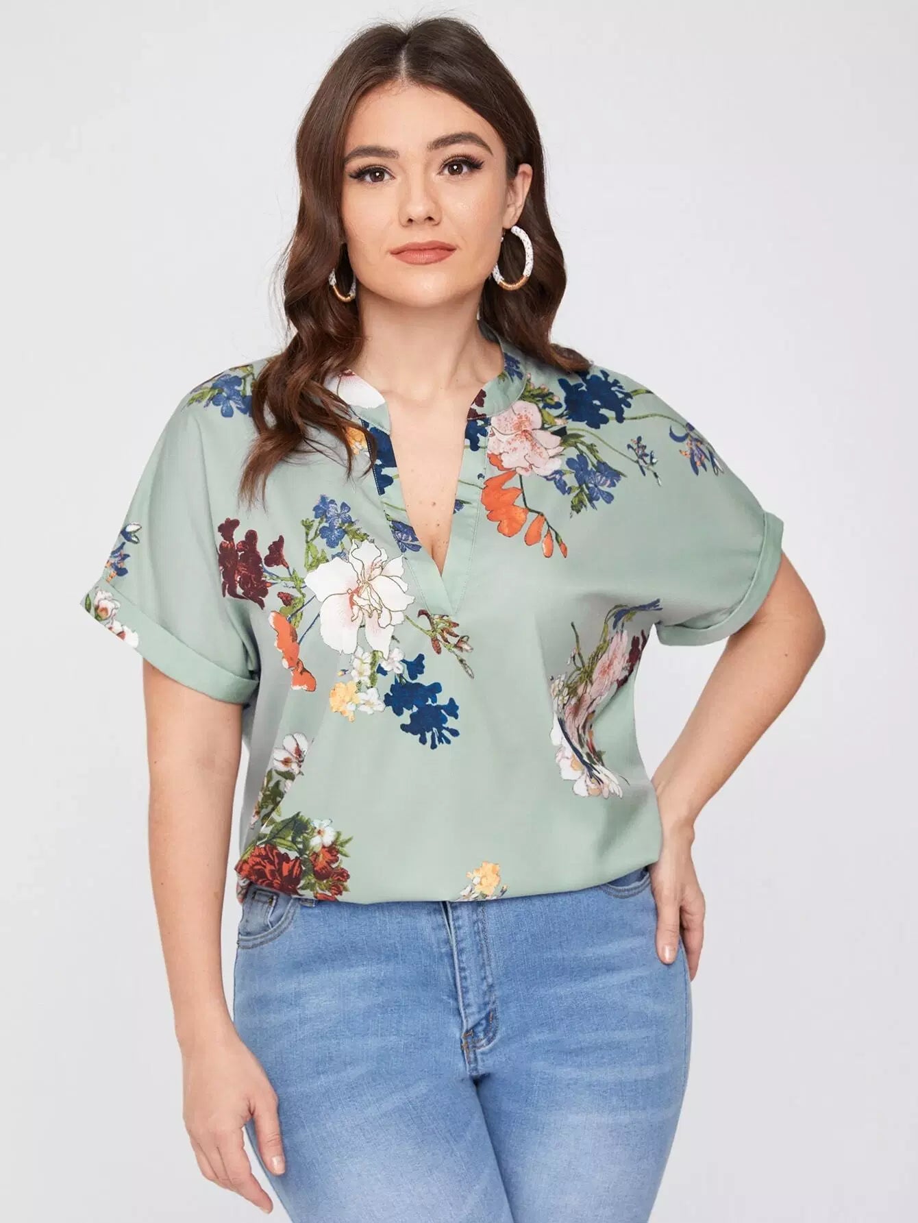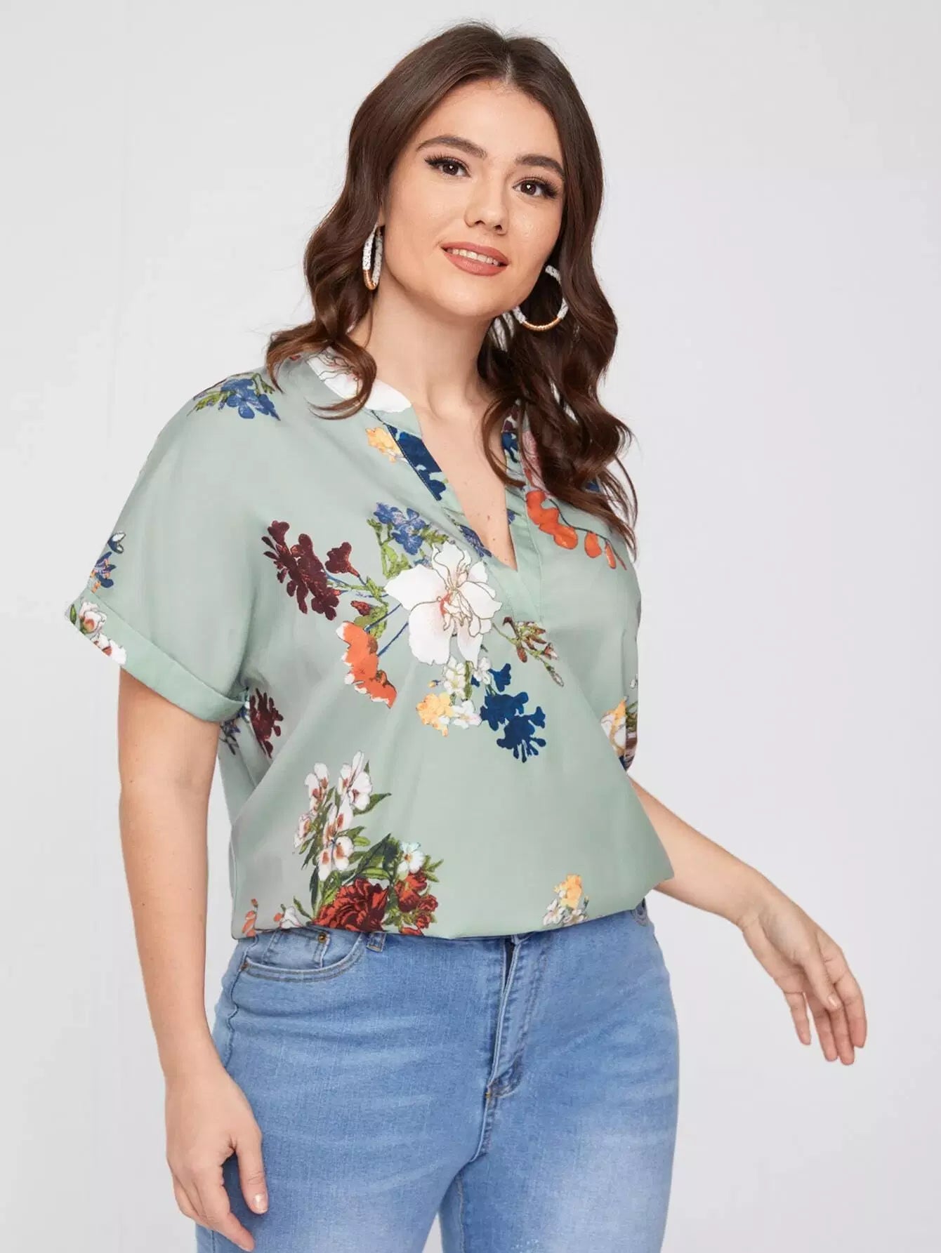 Plus Notch Neck Cuffed Sleeve Floral Top