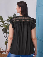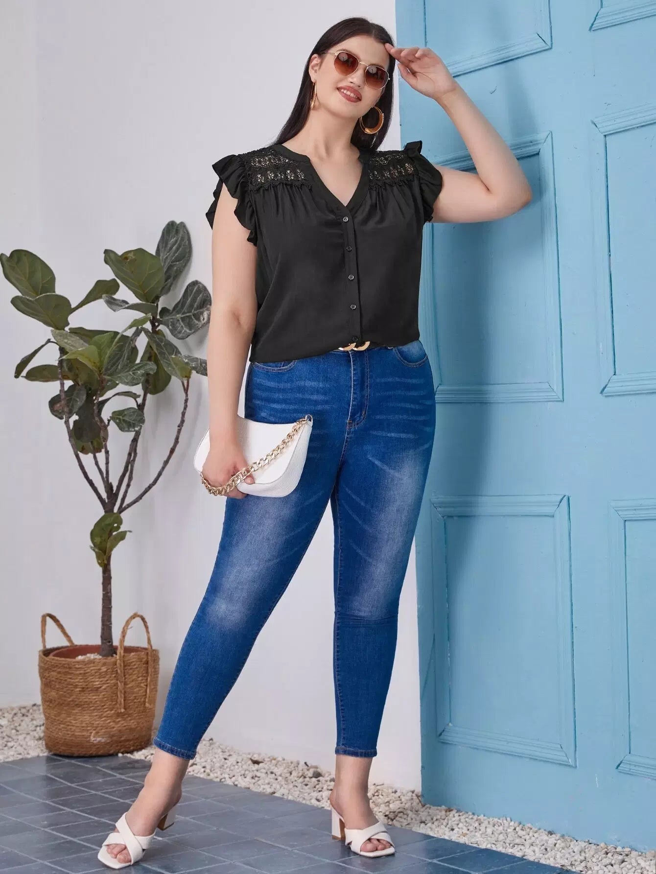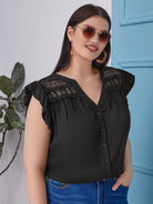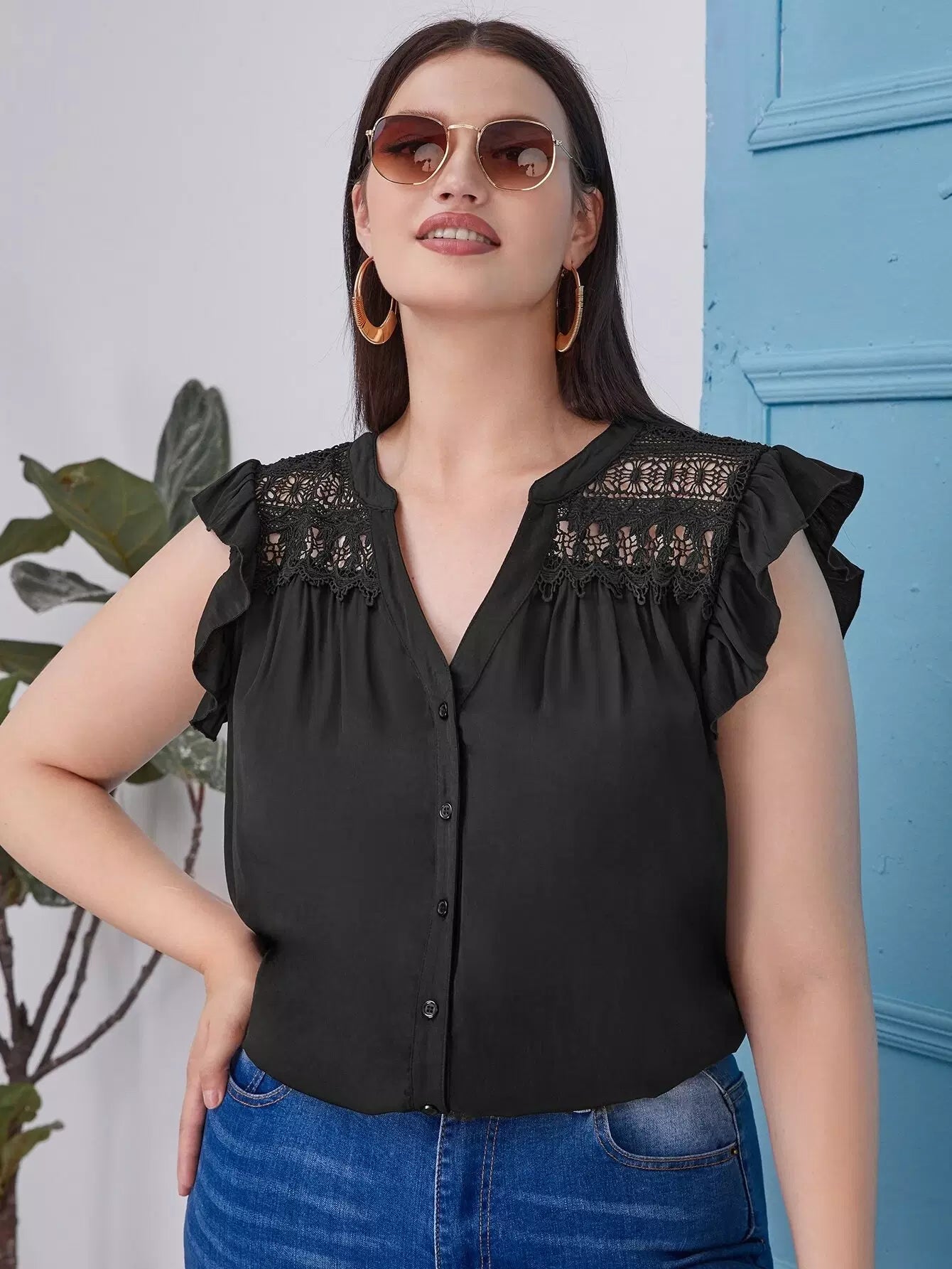 Plus Notched Neck Contrast Lace Button Front Blouse