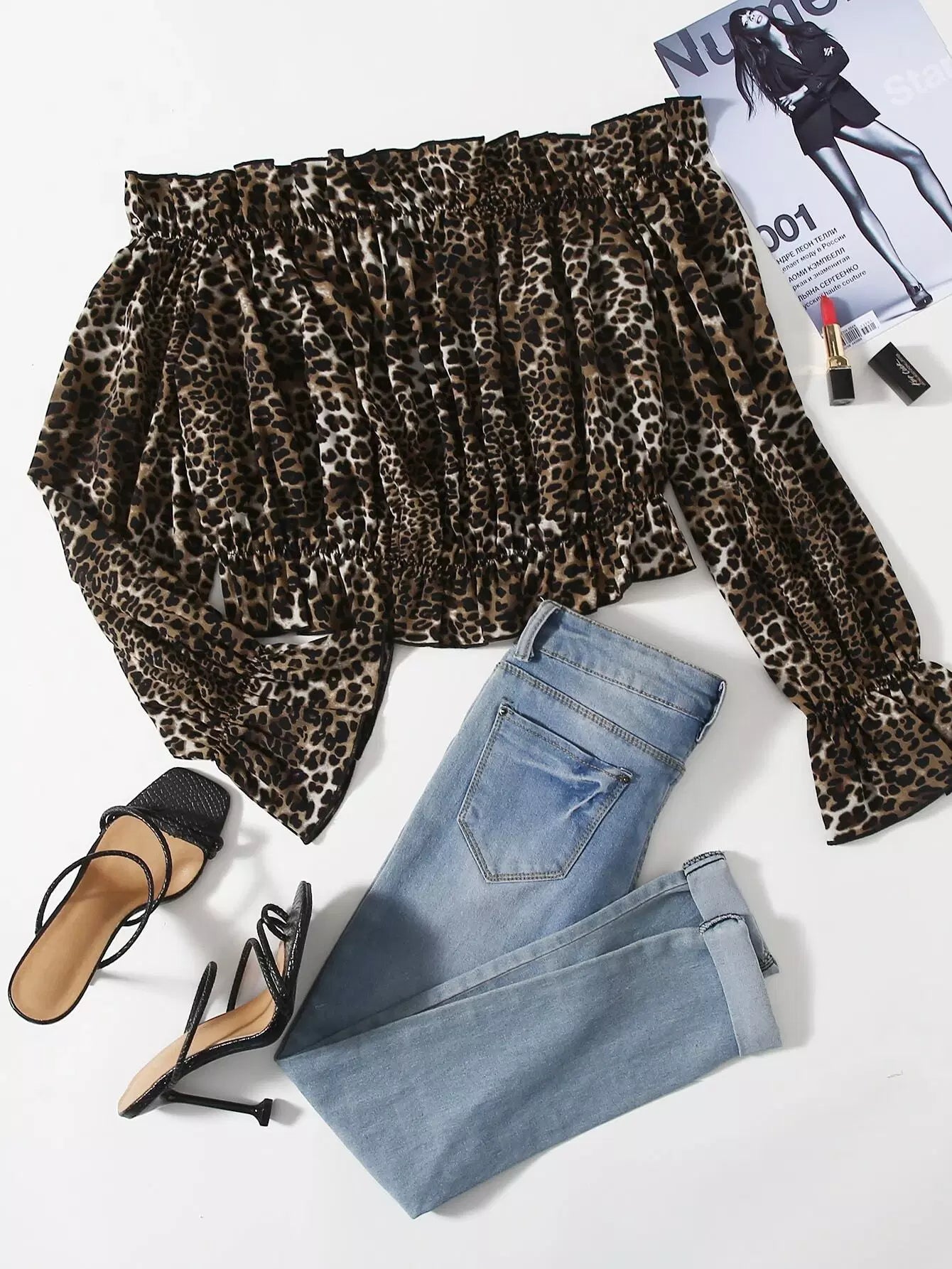 Plus Off-shoulder Leopard Print Ruffle Hem Blouse