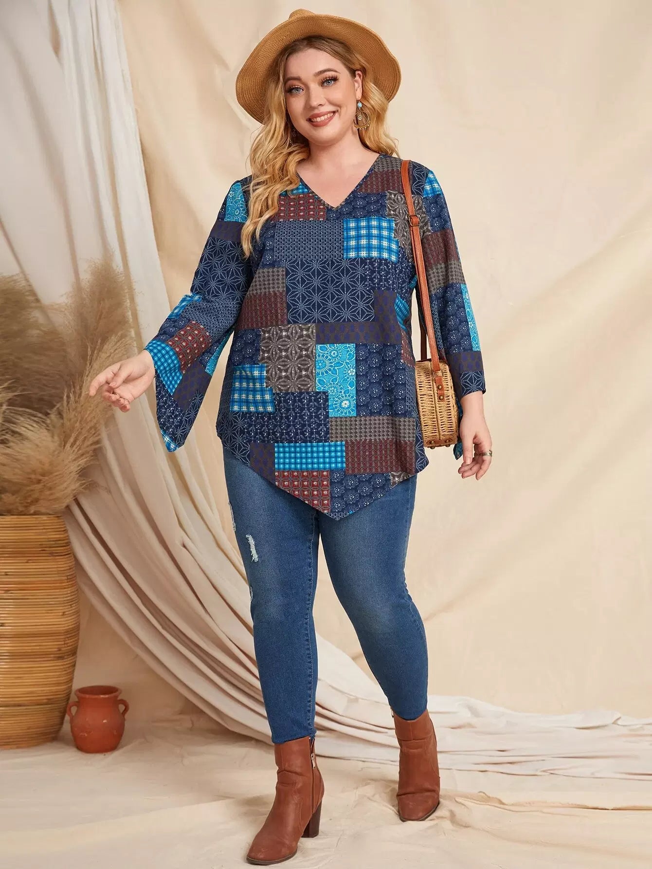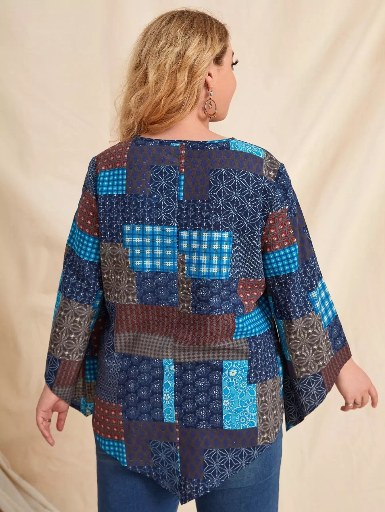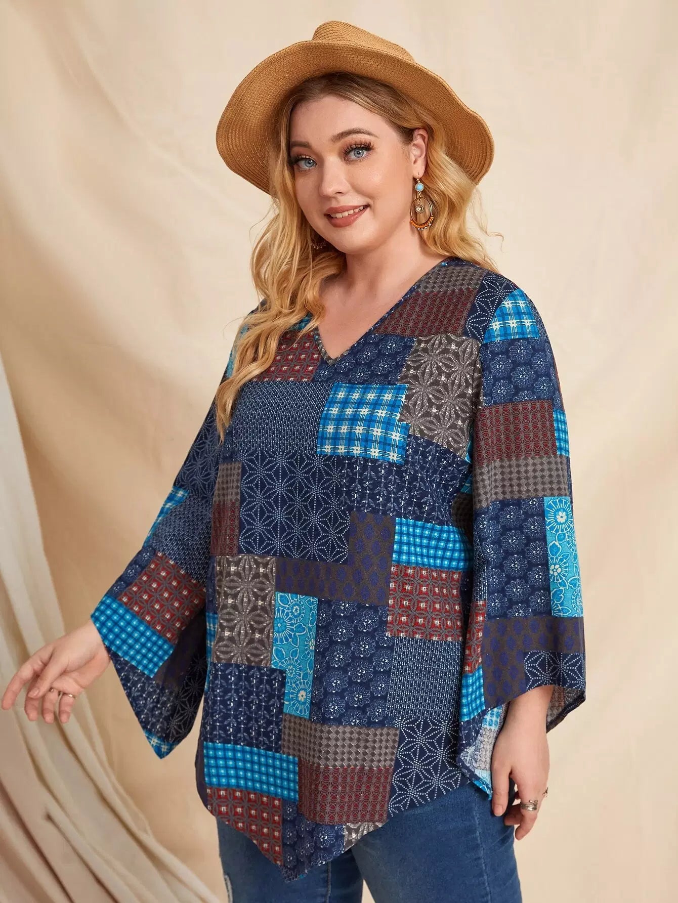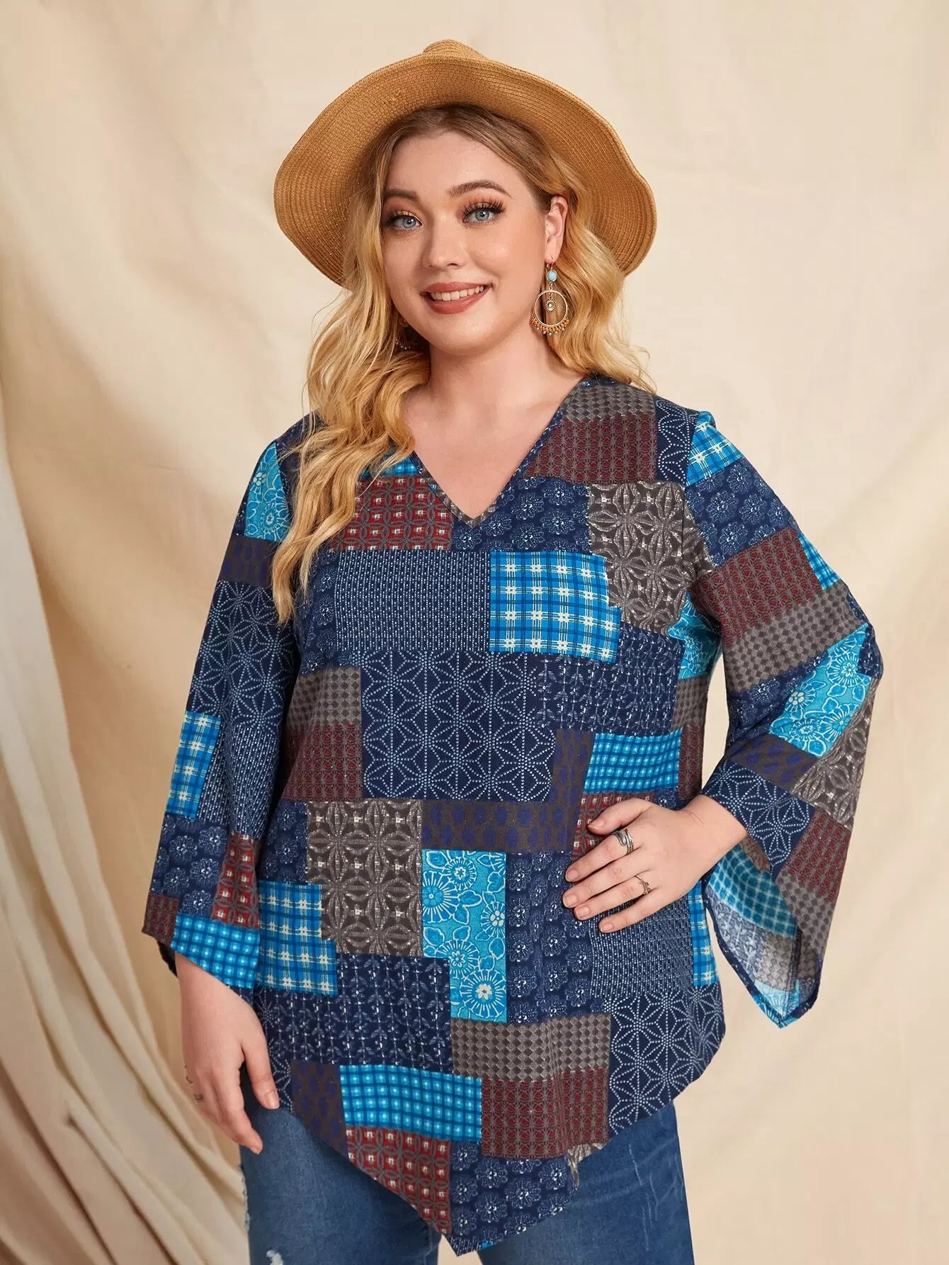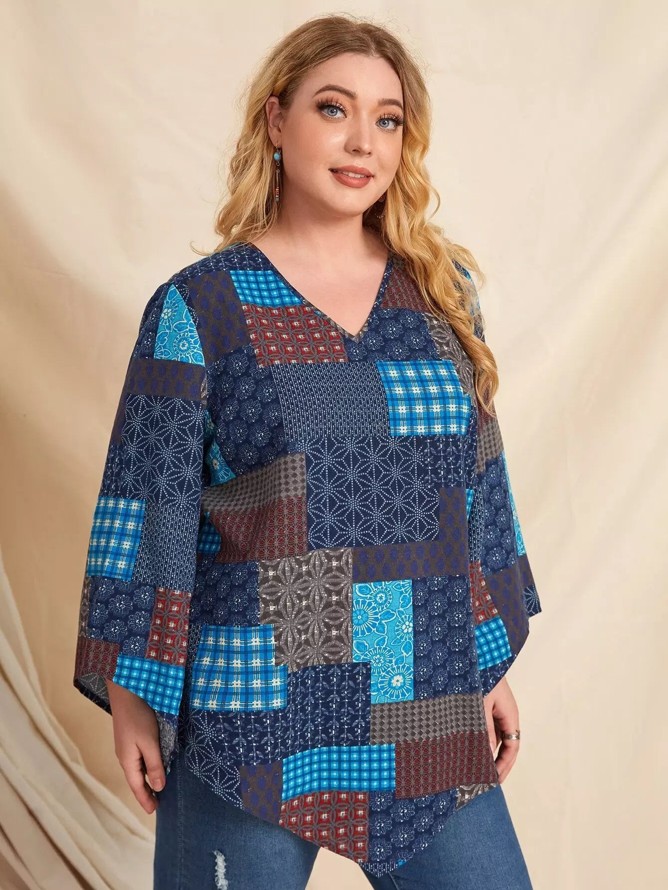 Plus Patchwork V-neck Blouse