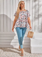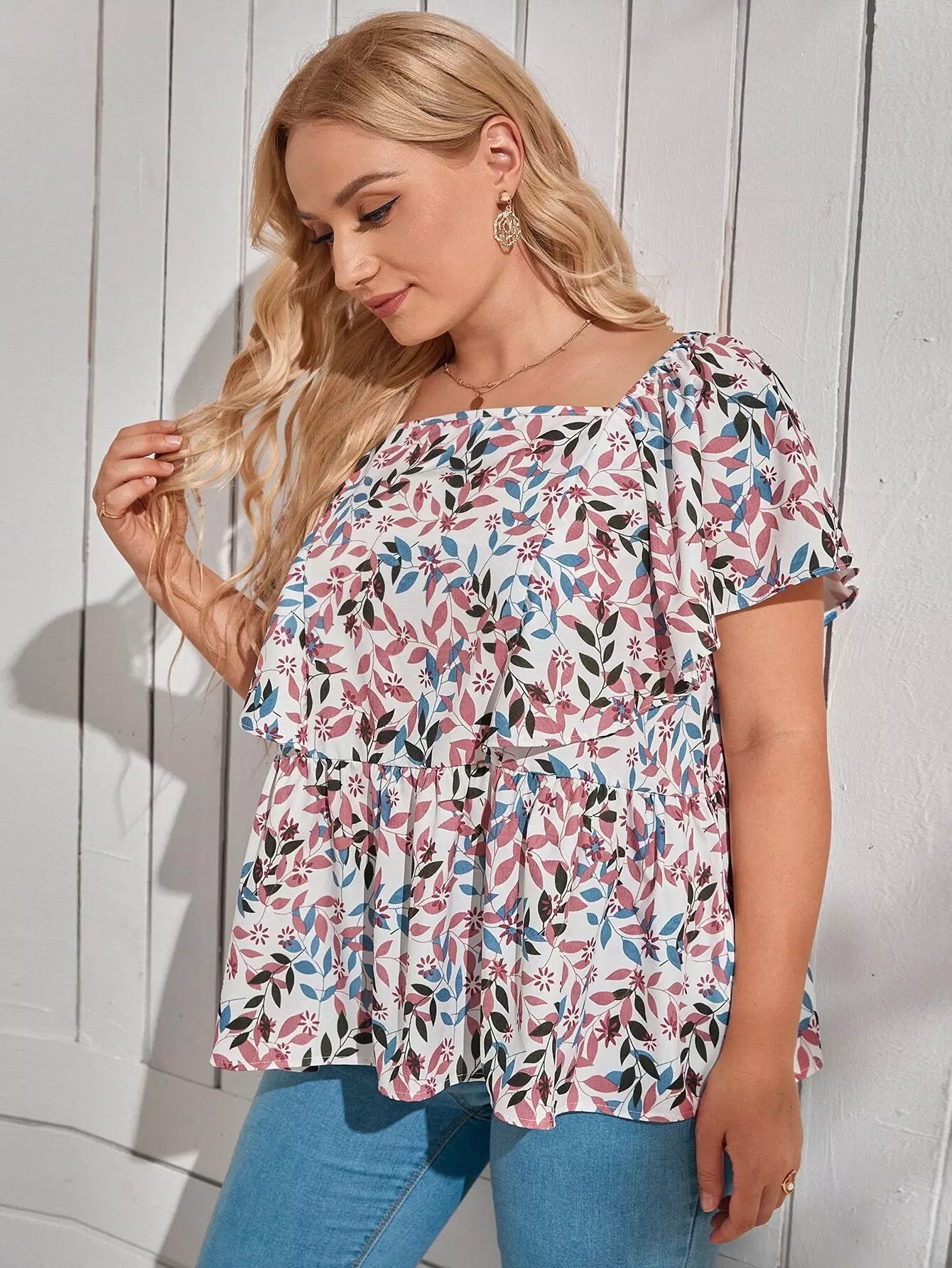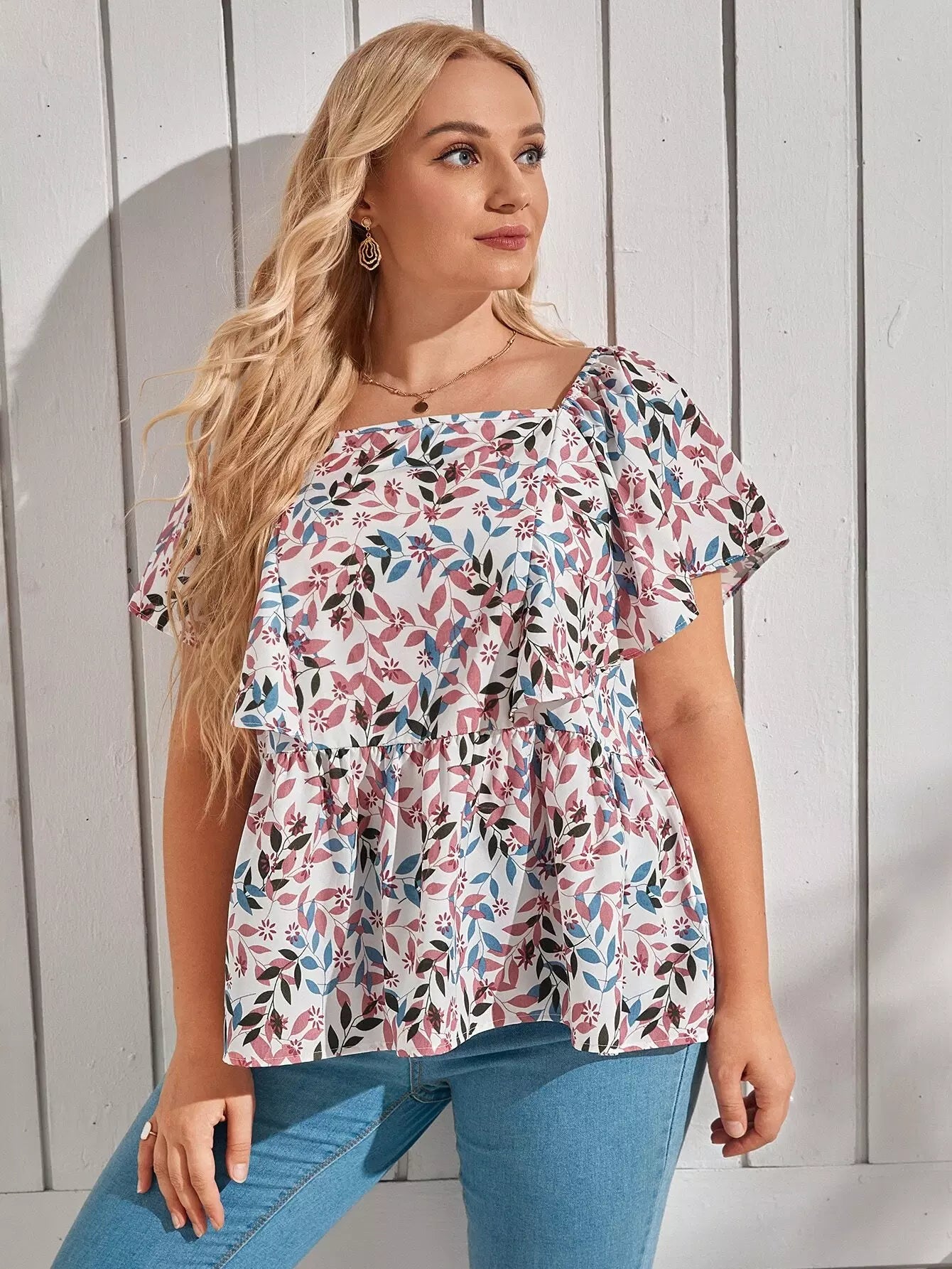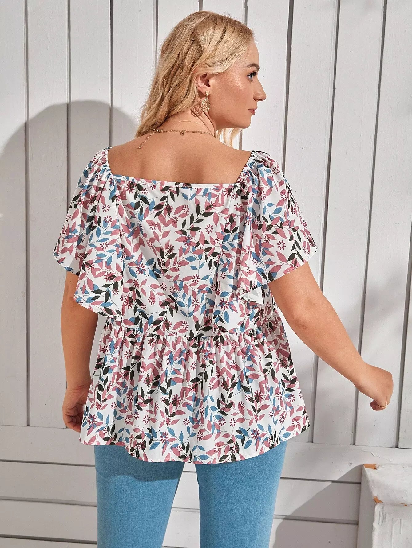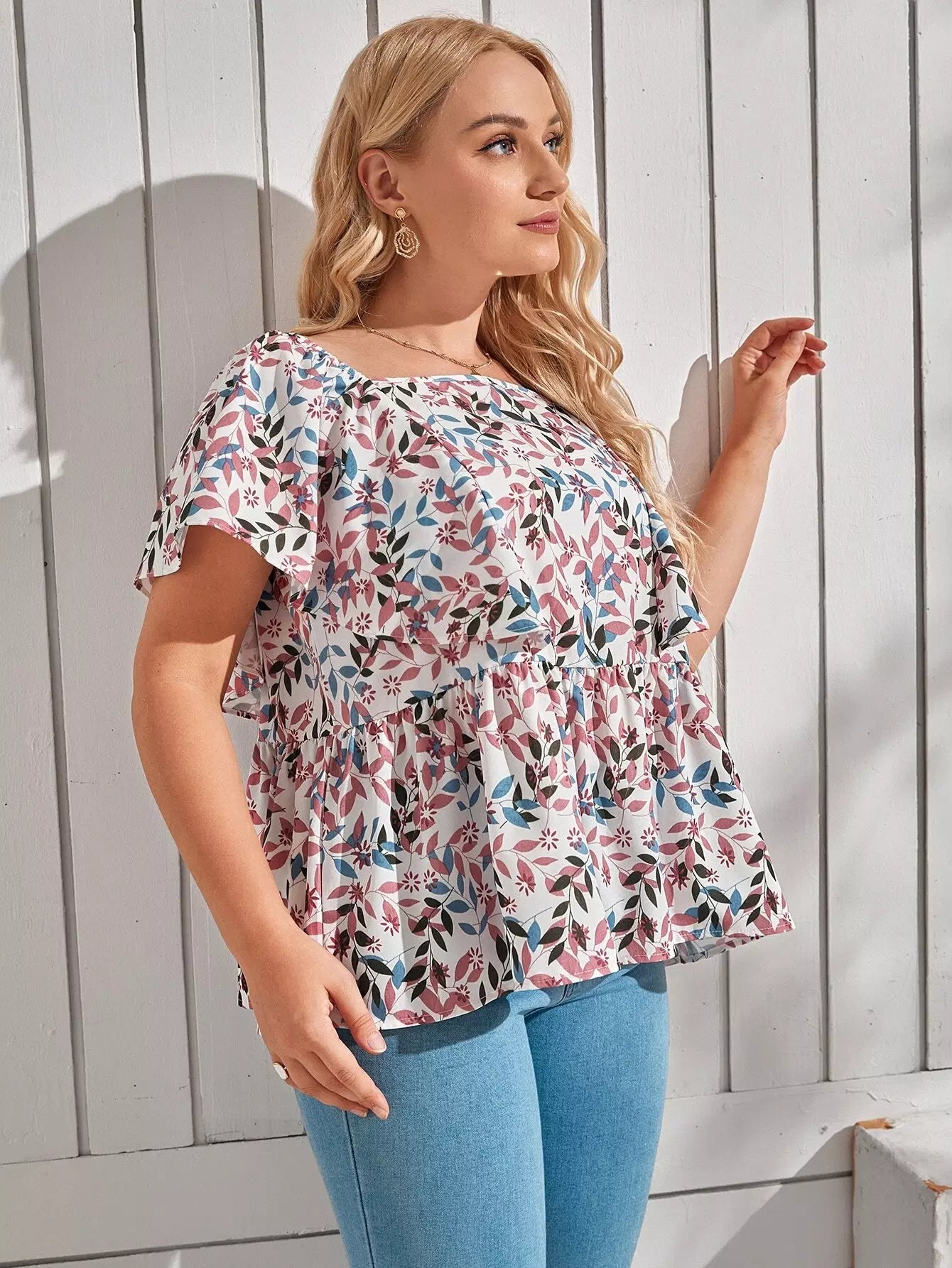 Plus Plants Print Butterfly Sleeve Babydoll Blouse