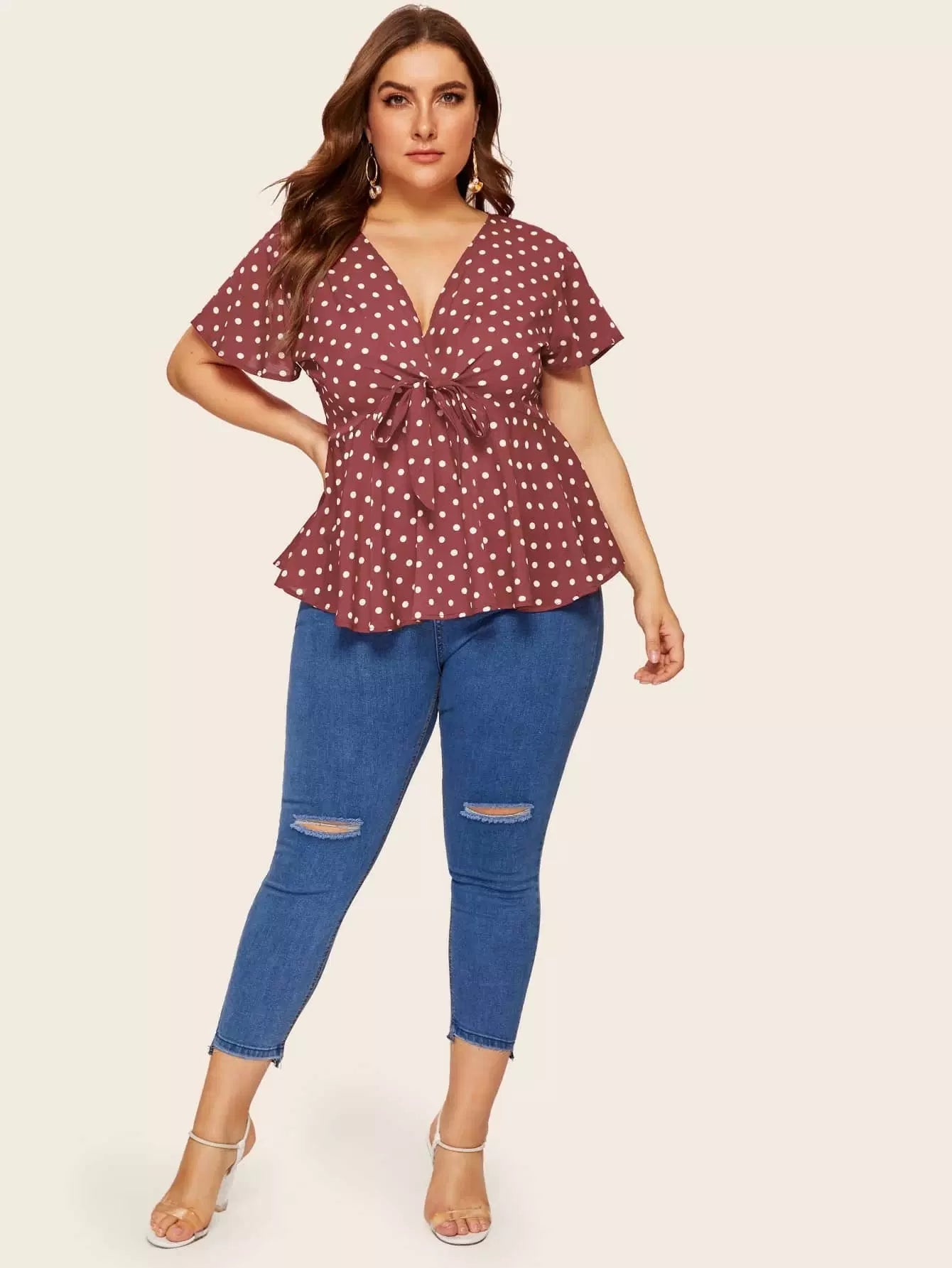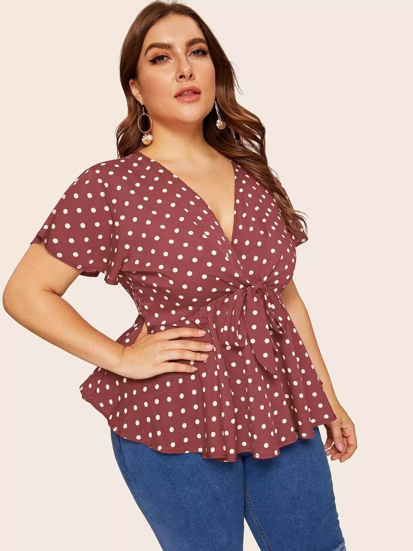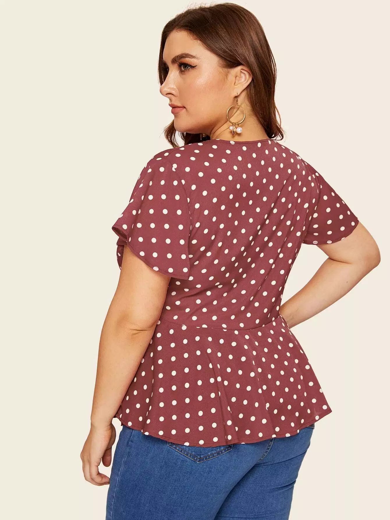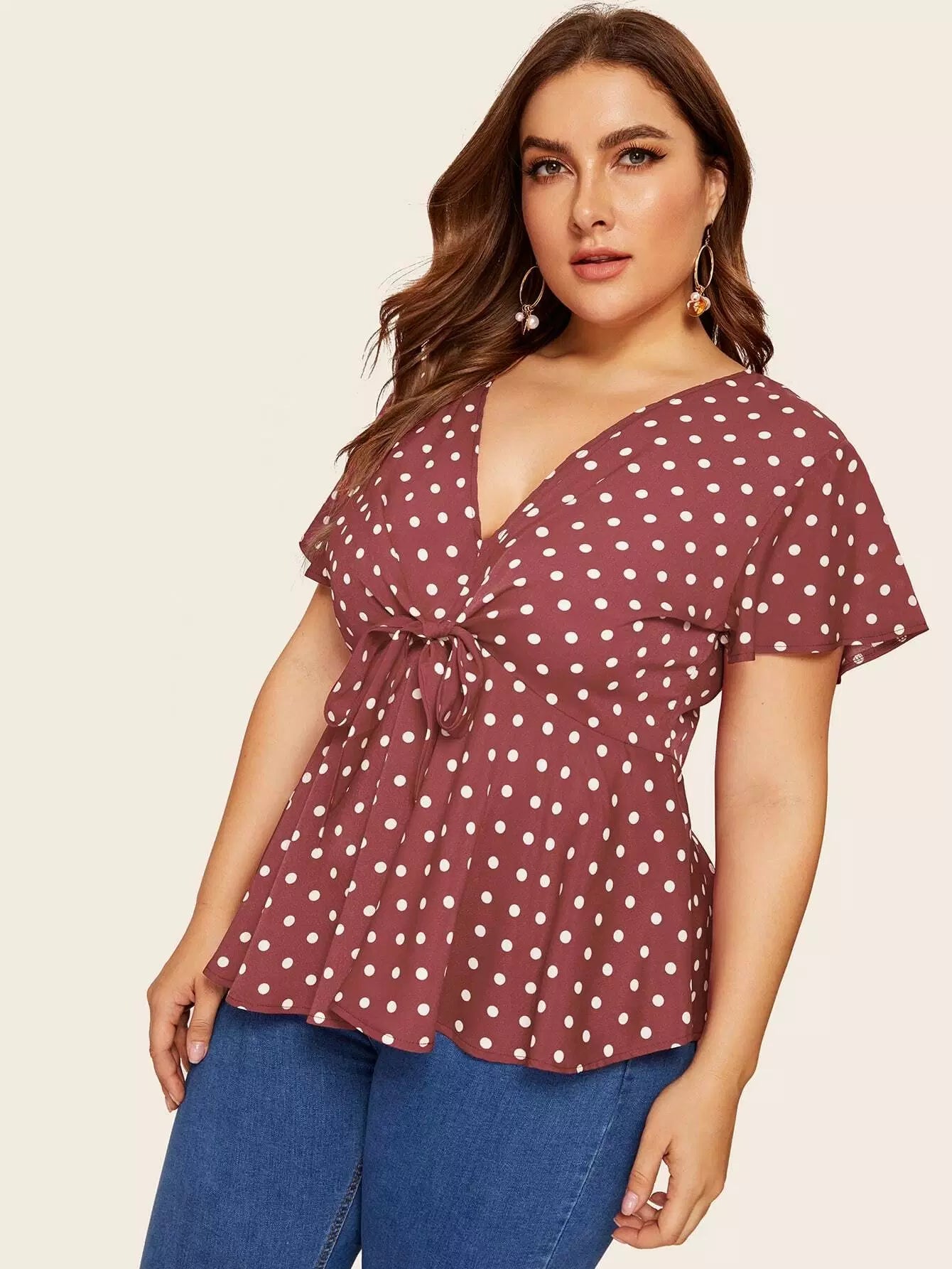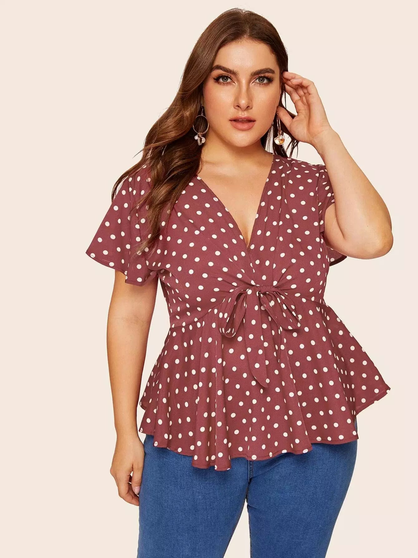 Plus Polka Dot Tie Front Peplum Blouse