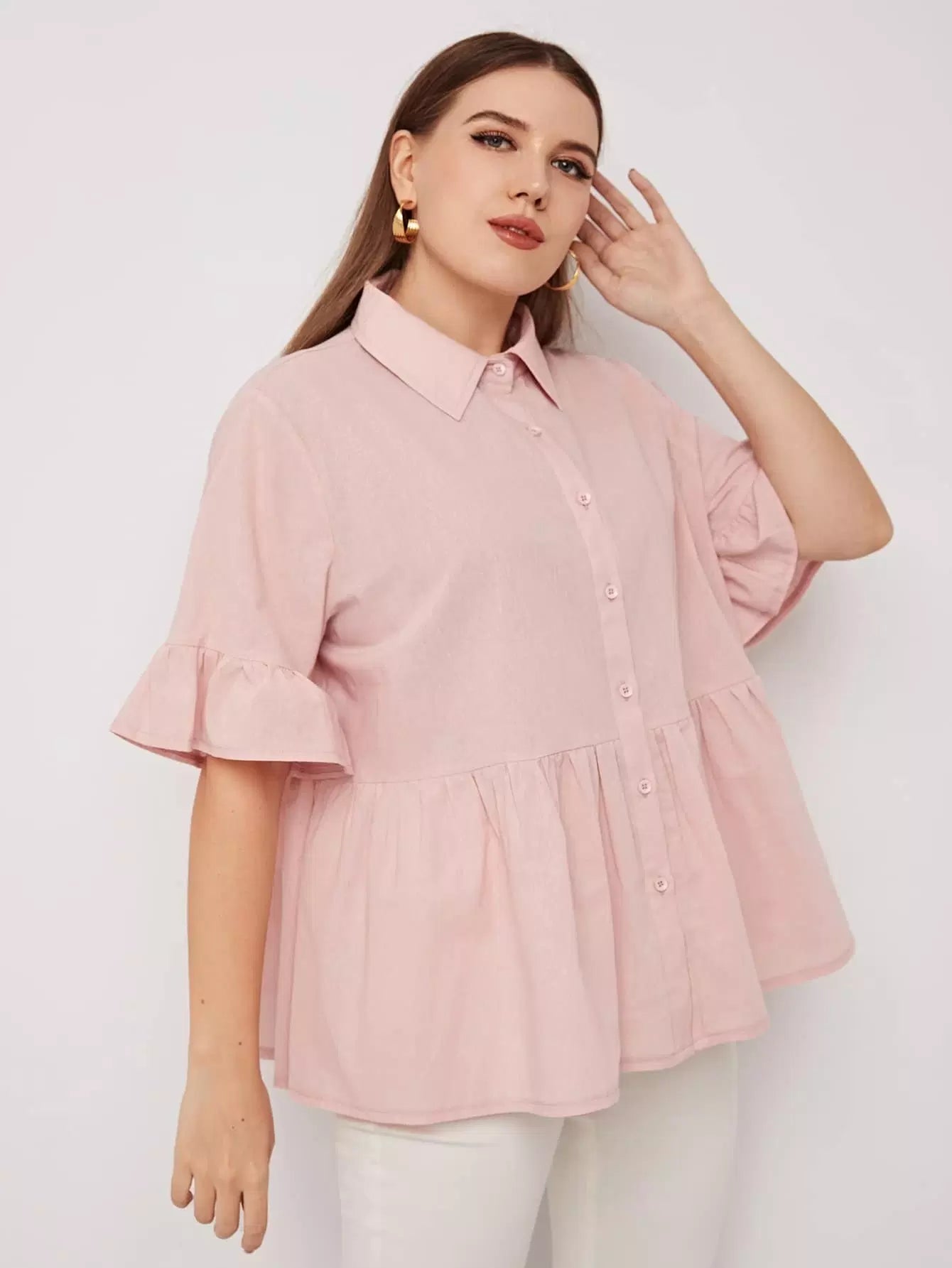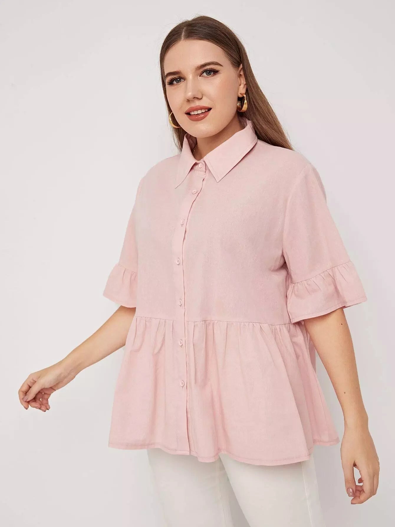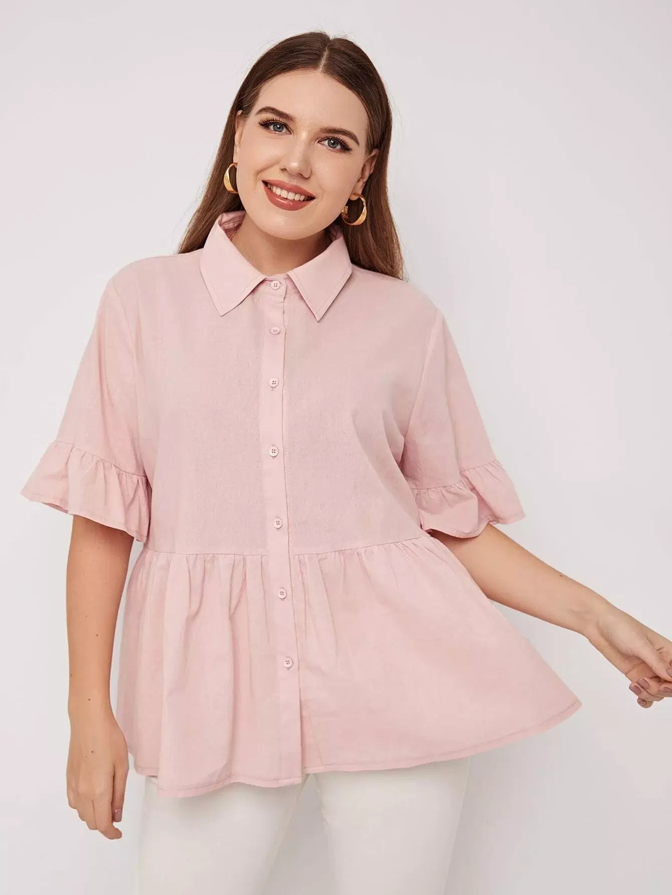 Plus Solid Button Through Babydoll Blouse
