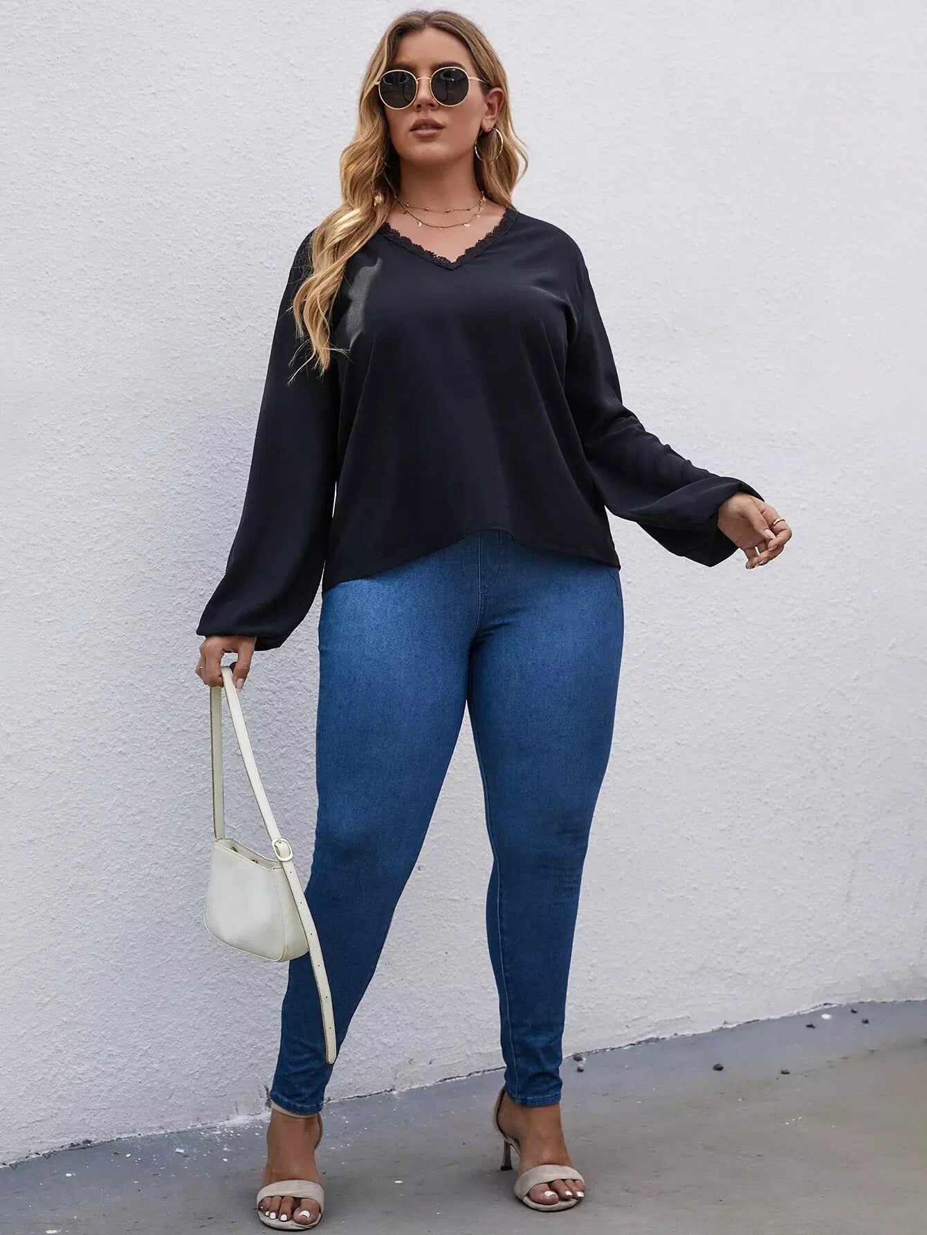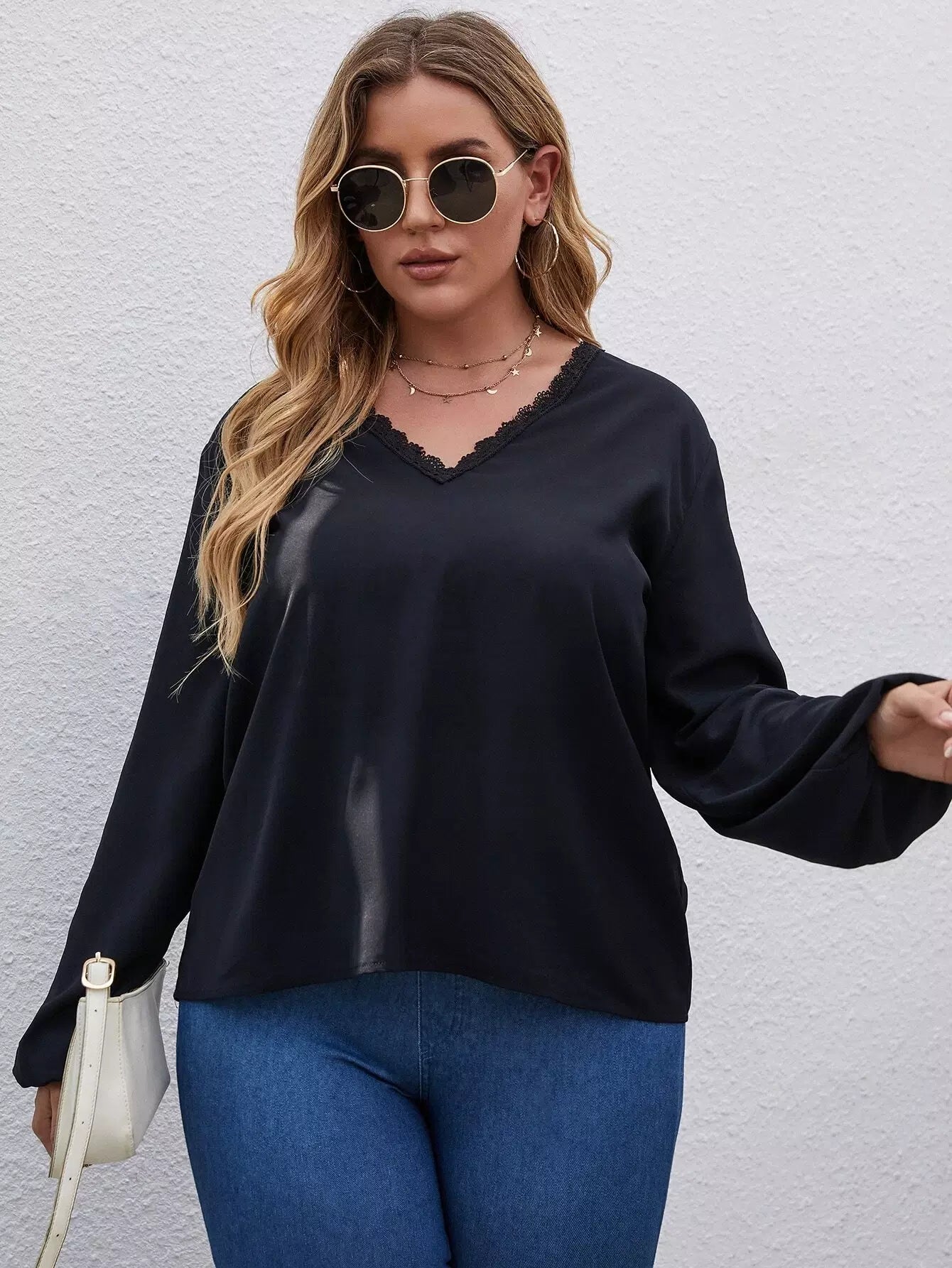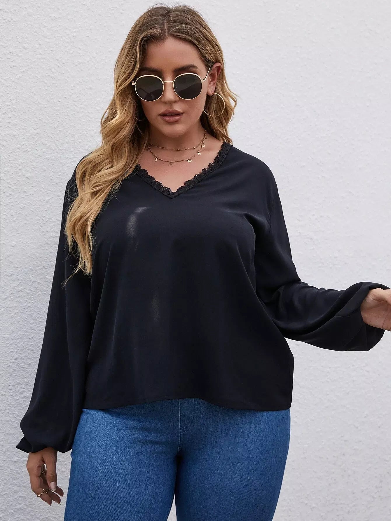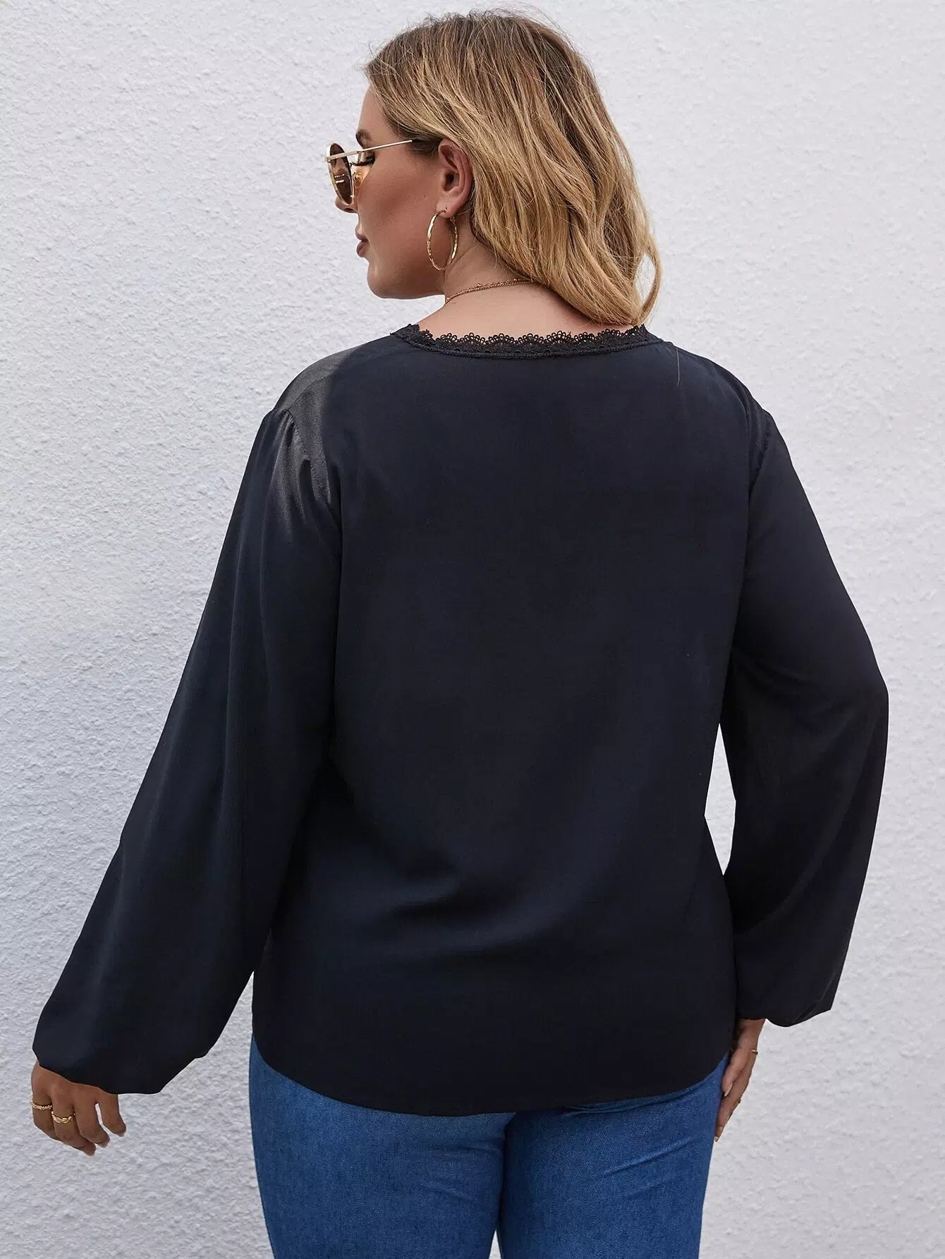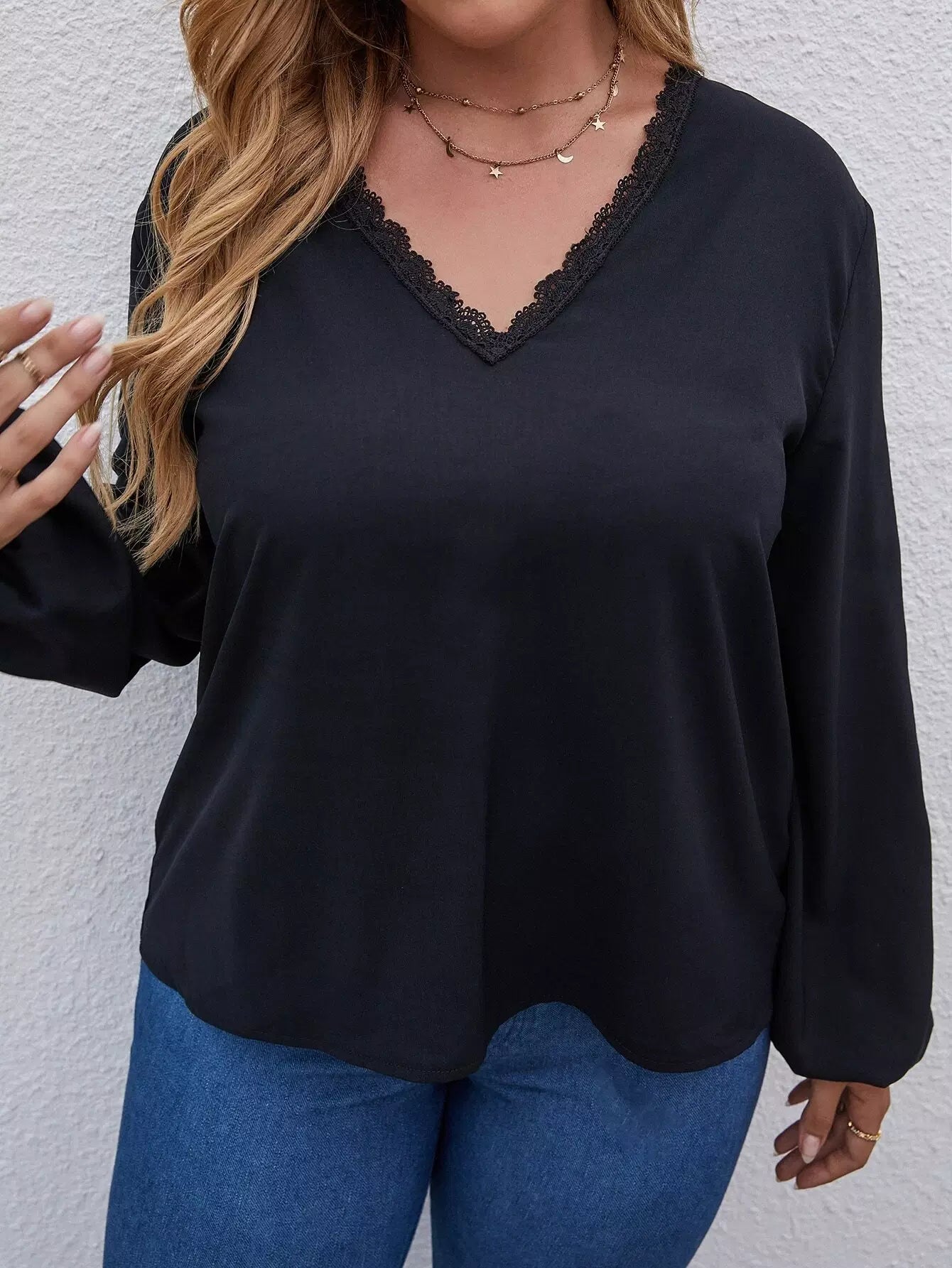 Plus Solid Lace Trim Blouse