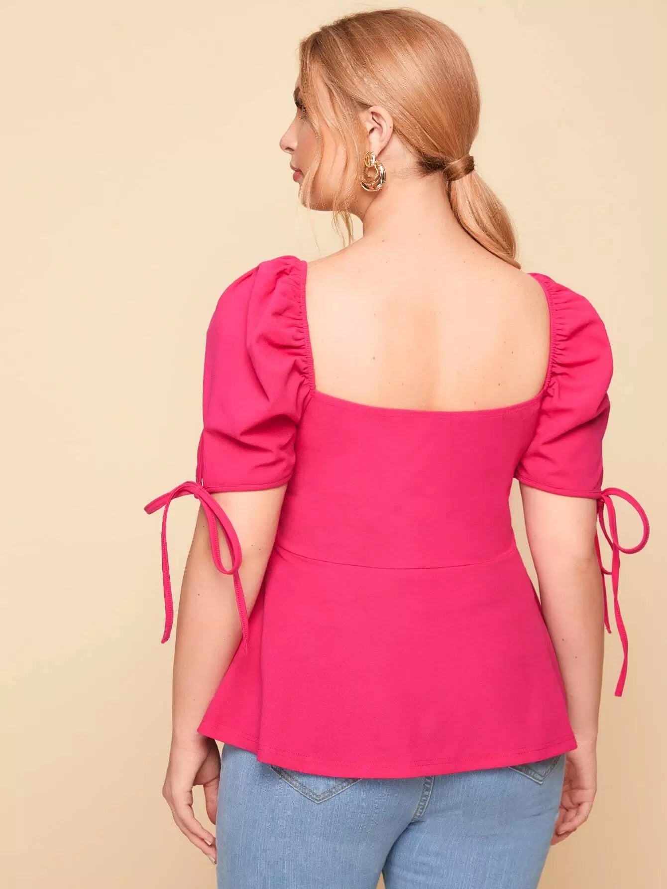 Plus Square Neck Knot Puff Sleeve Peplum Top