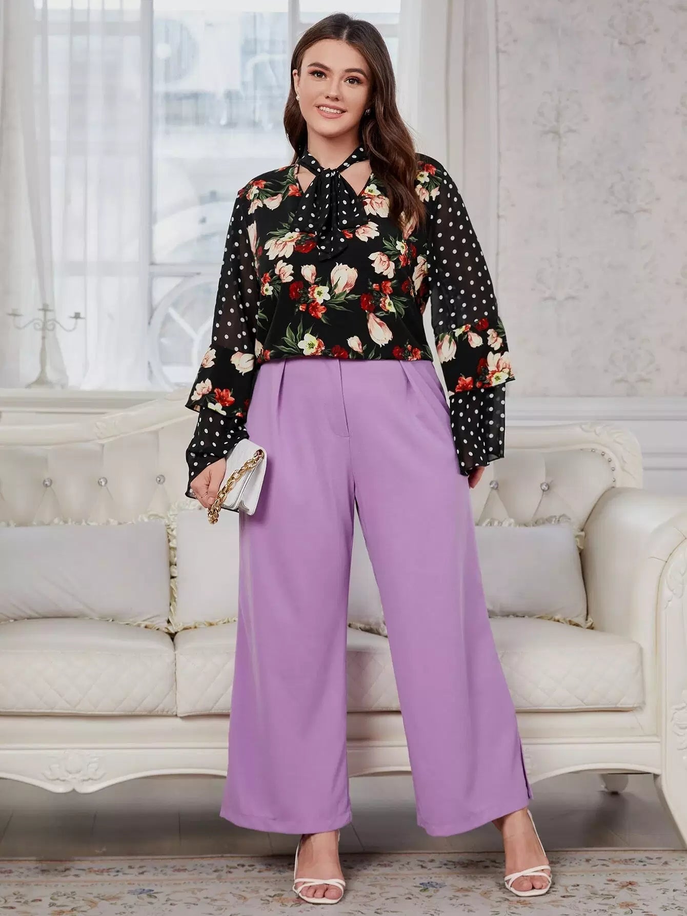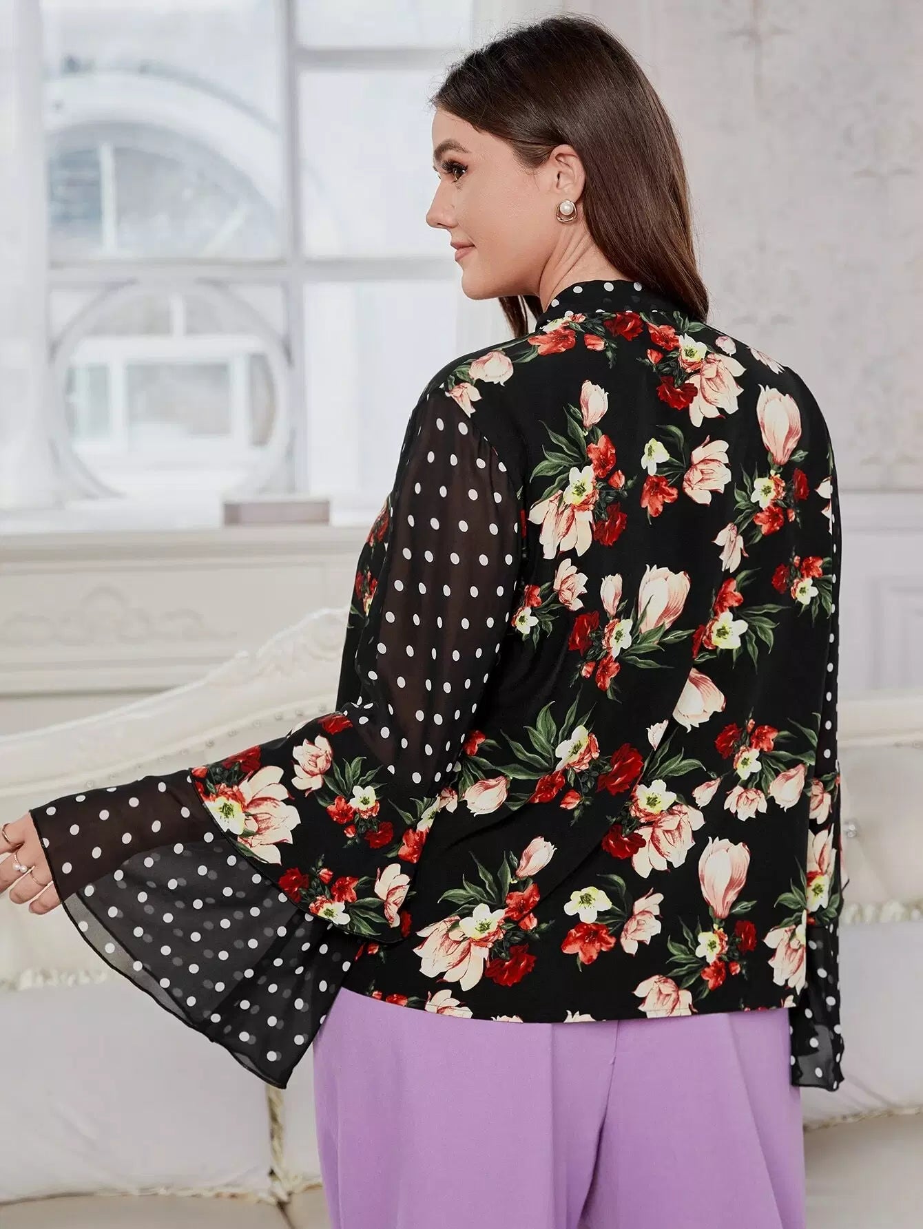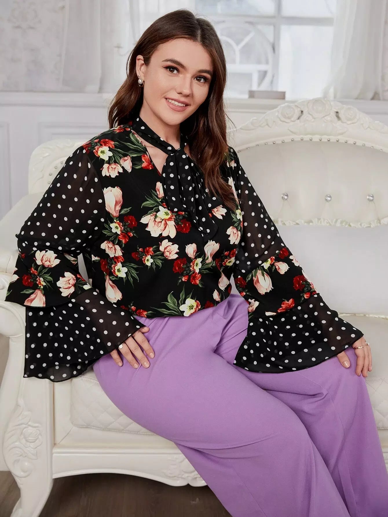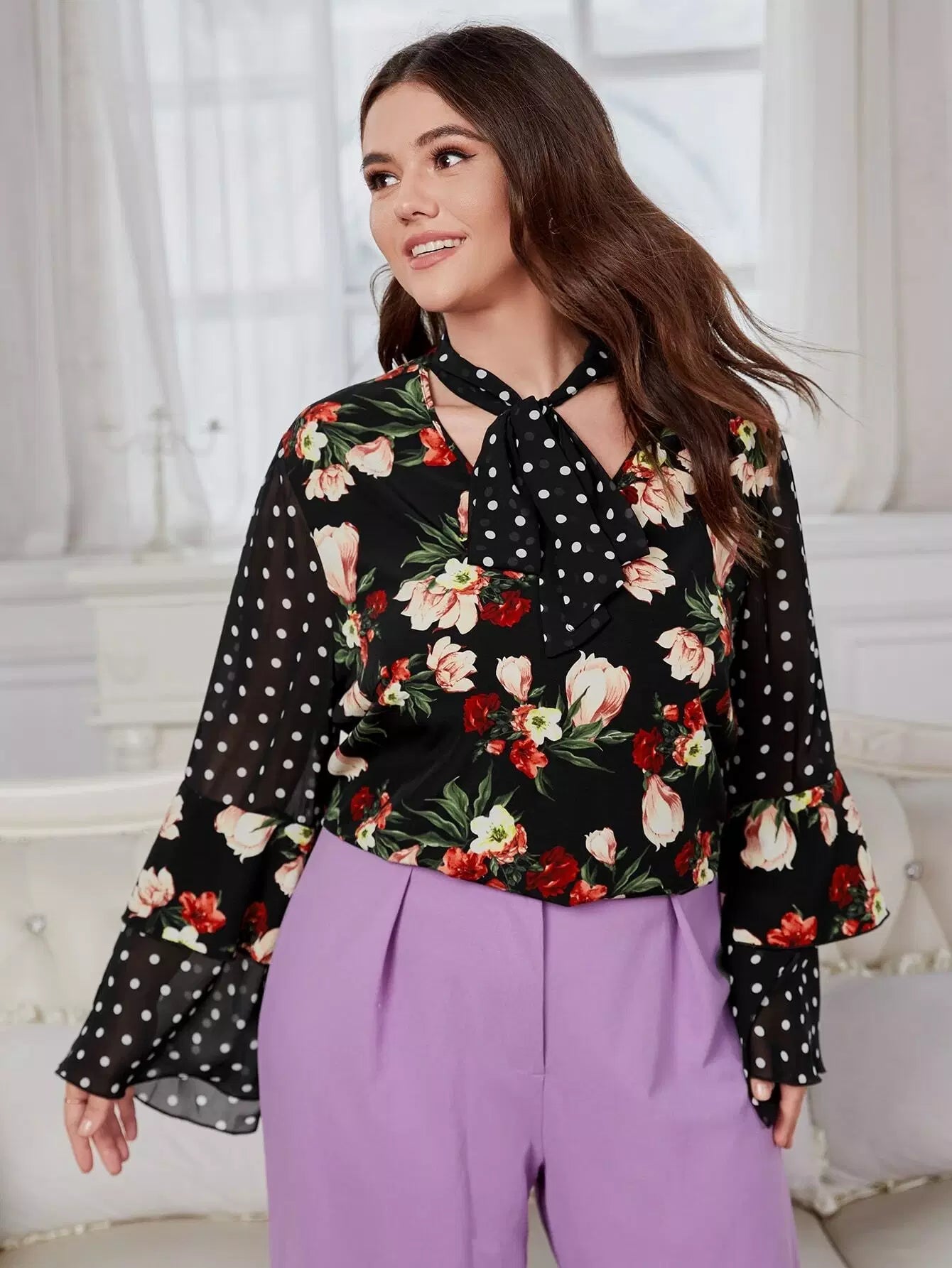 Plus Tie Neck Floral & Polka Dot Print Blouse