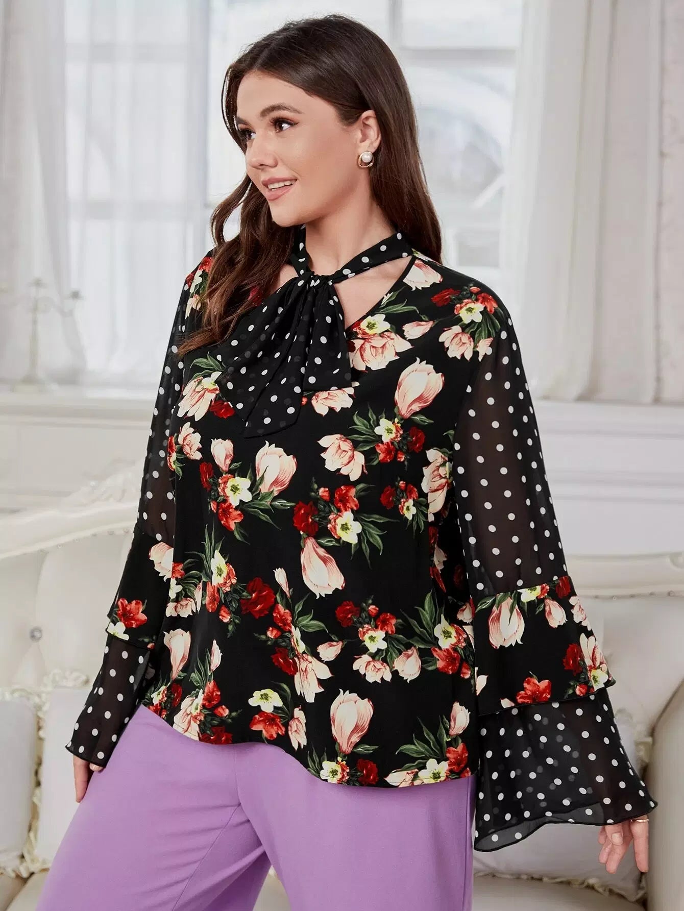 Women - Plus Tie Neck Floral & Polka Dot Print Blouse