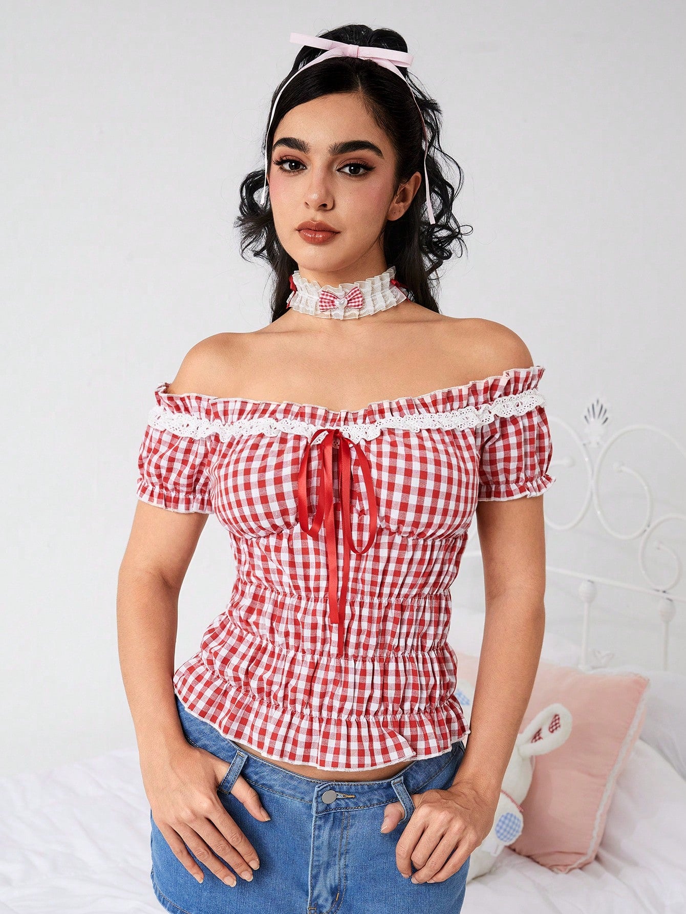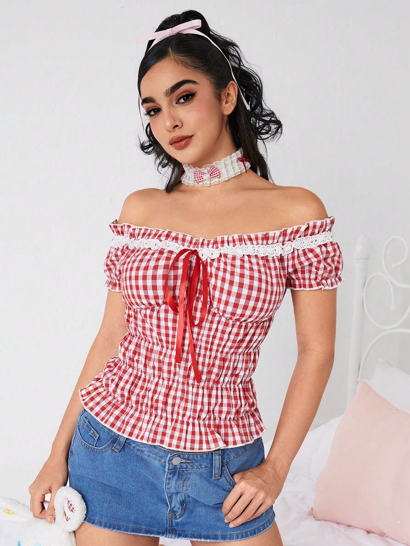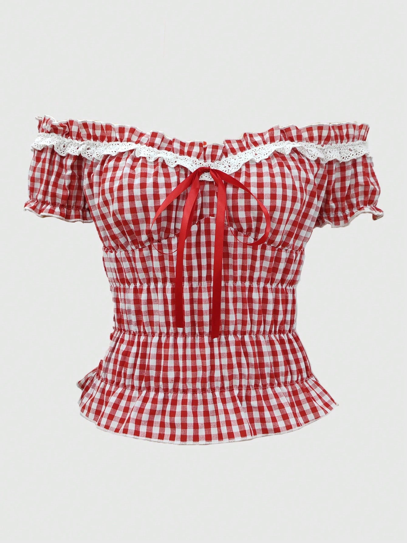 ROMWE Kawaii Plus Size Women Summer Plaid Print Ruffle Trim Front Tie Off Shoulder Sweet Blouse