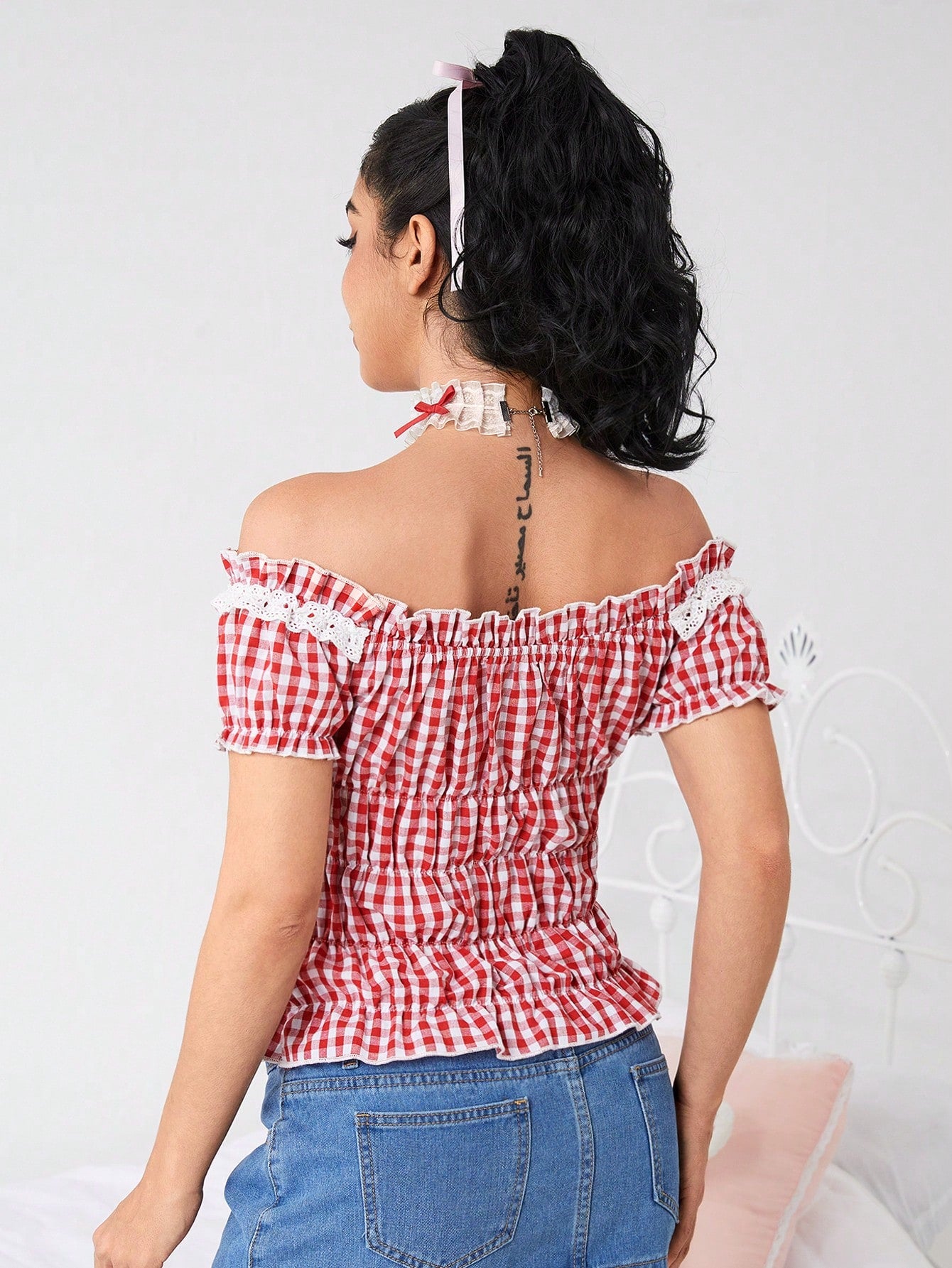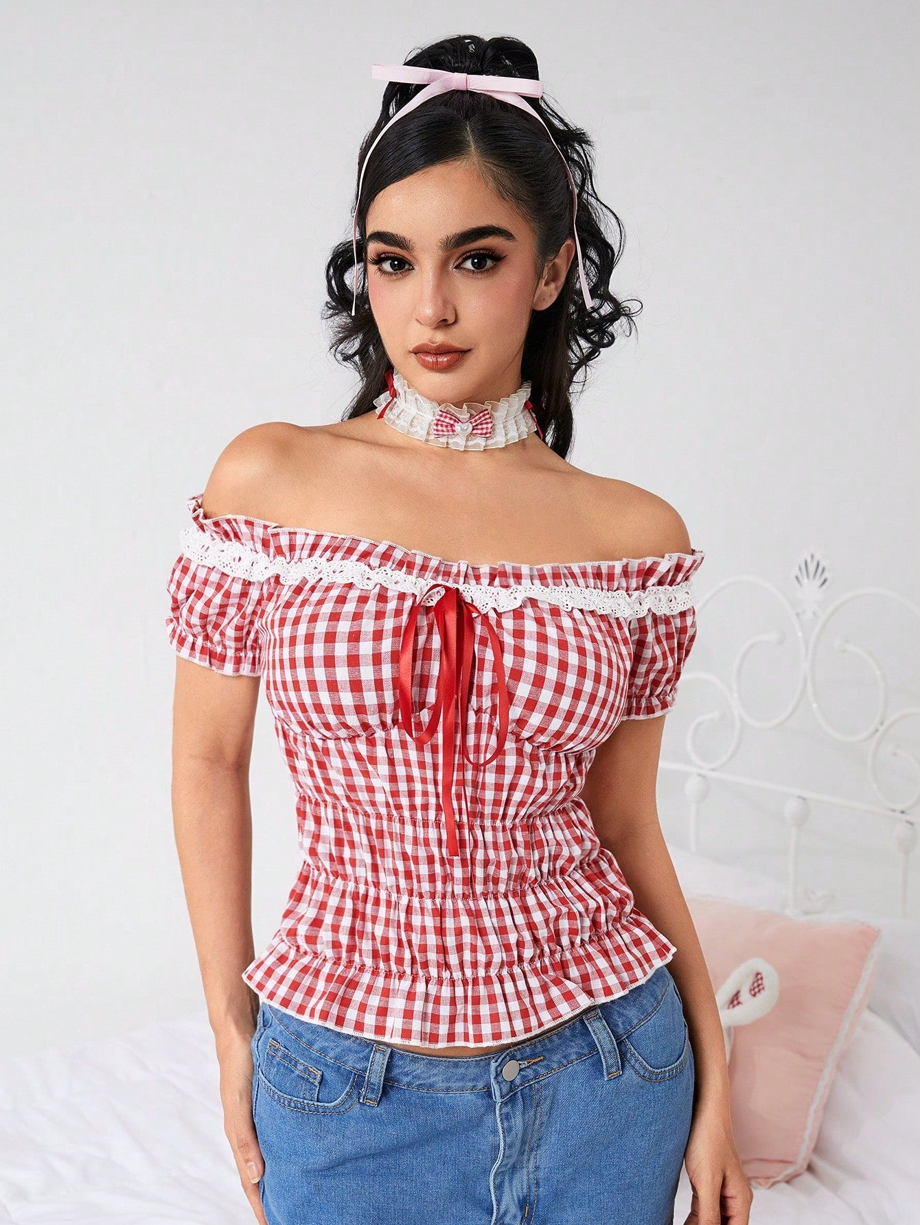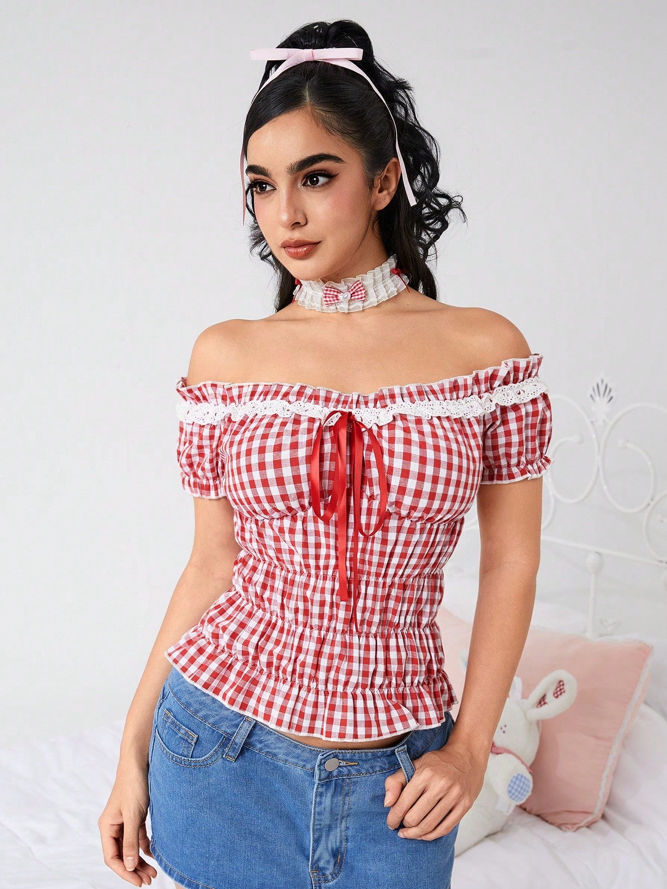 ROMWE Kawaii Plus Size Women Summer Plaid Print Ruffle Trim Front Tie Off Shoulder Sweet Blouse