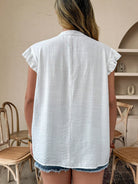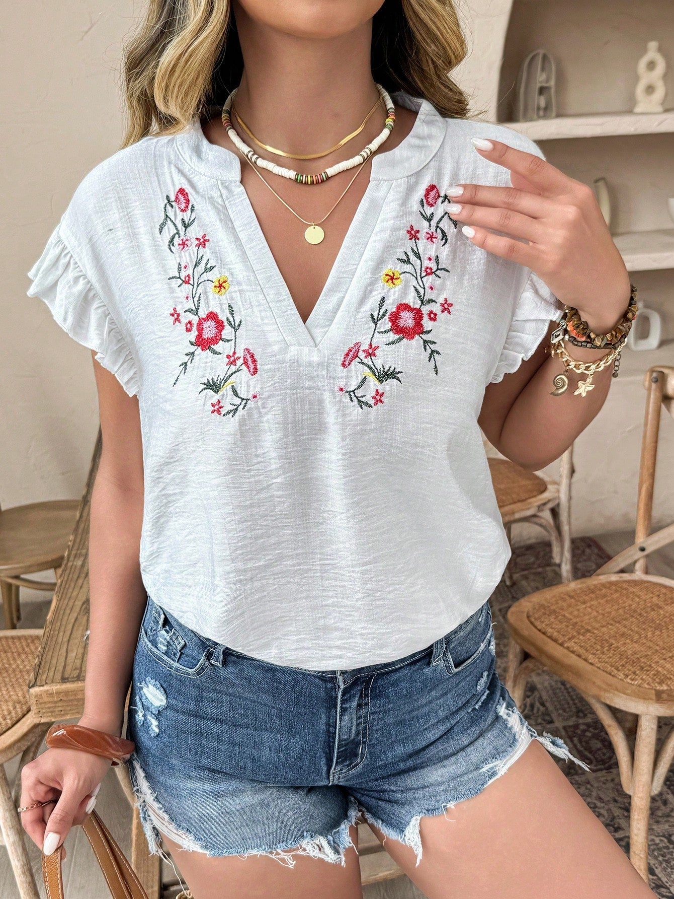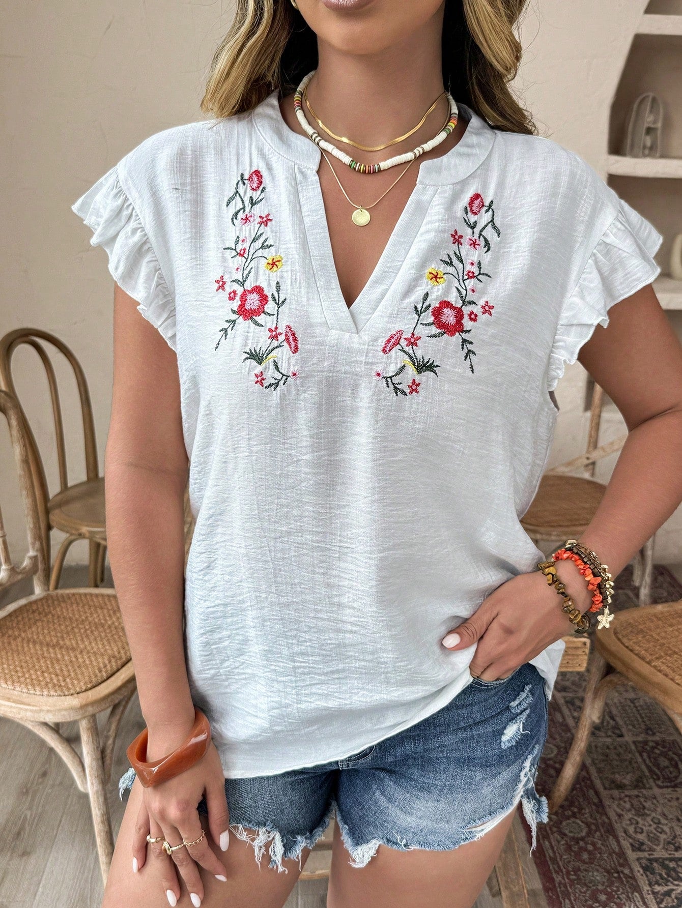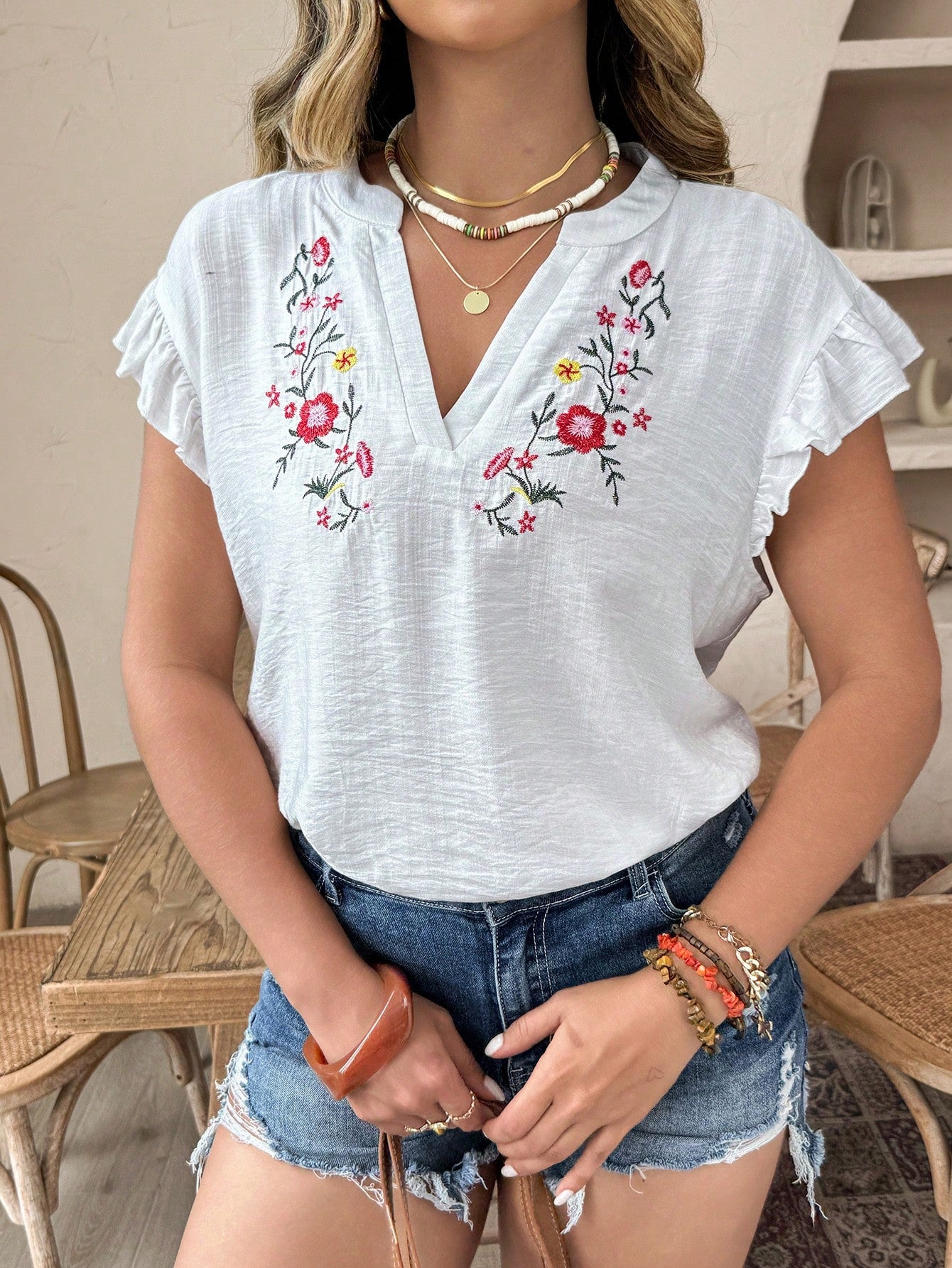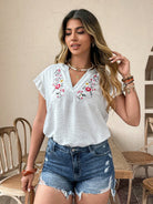 Weeklong Plus Size V-Neck Floral Embroidery Ruffle Trim Flutter Sleeve Blouse And Skirt Set, Vacation