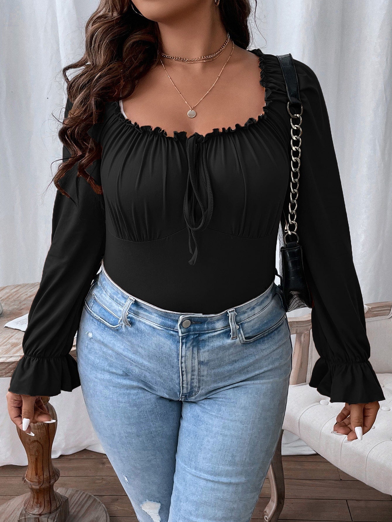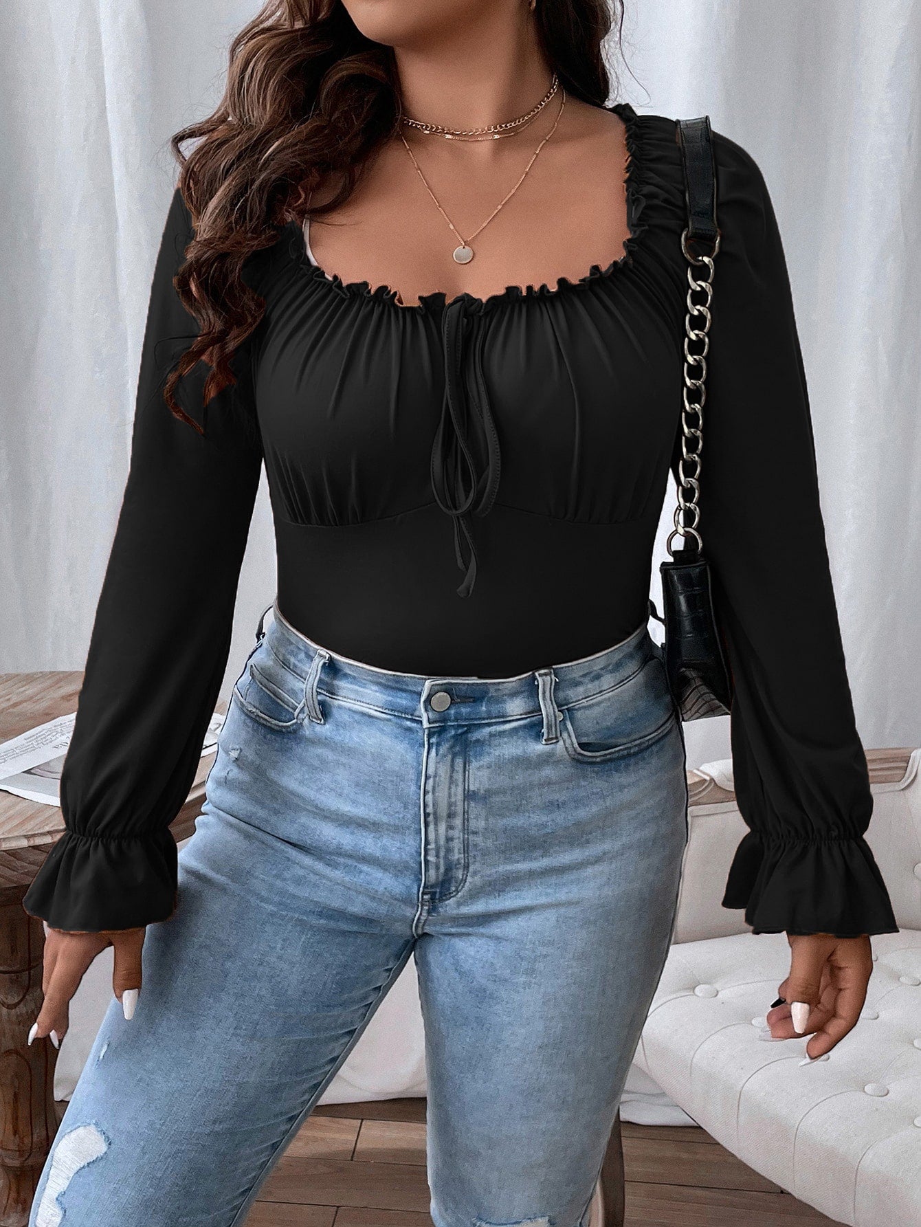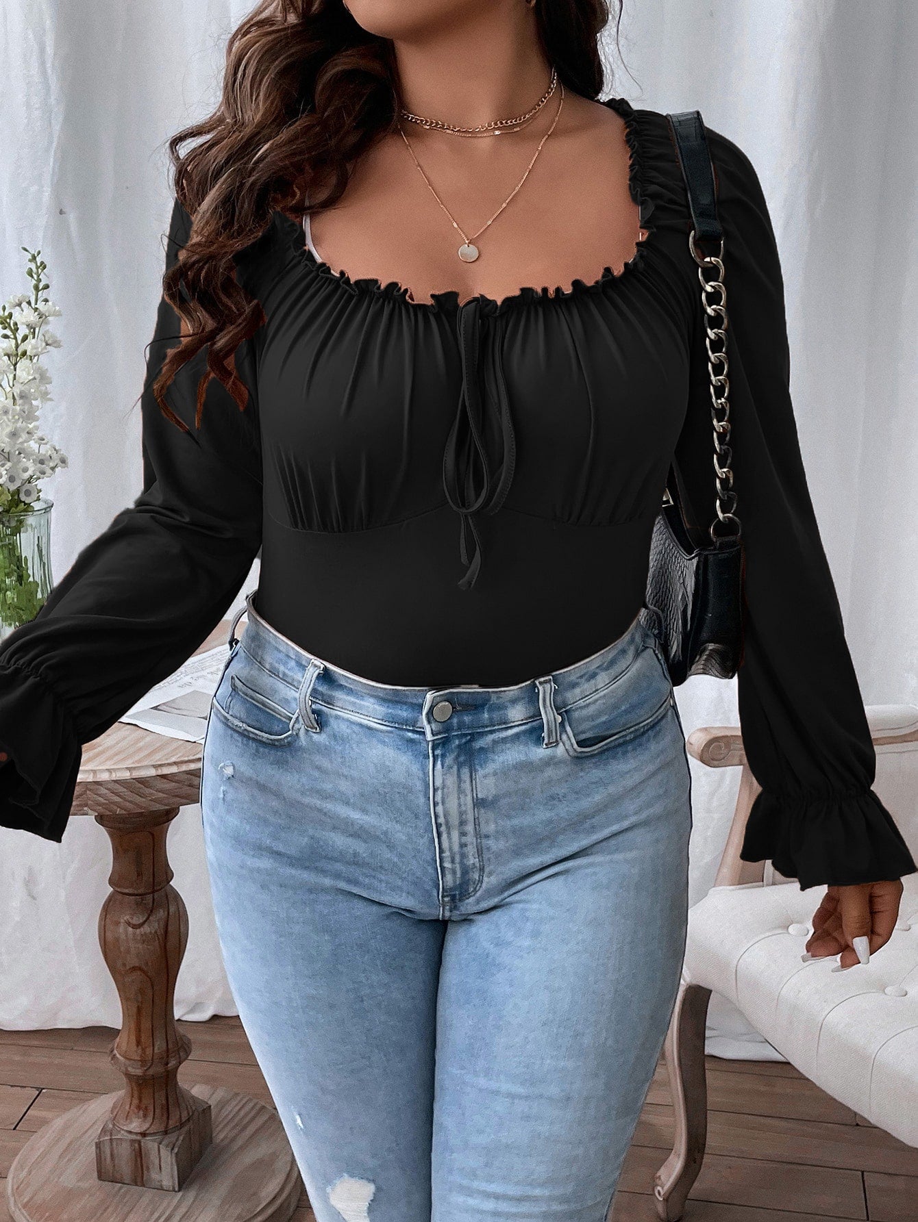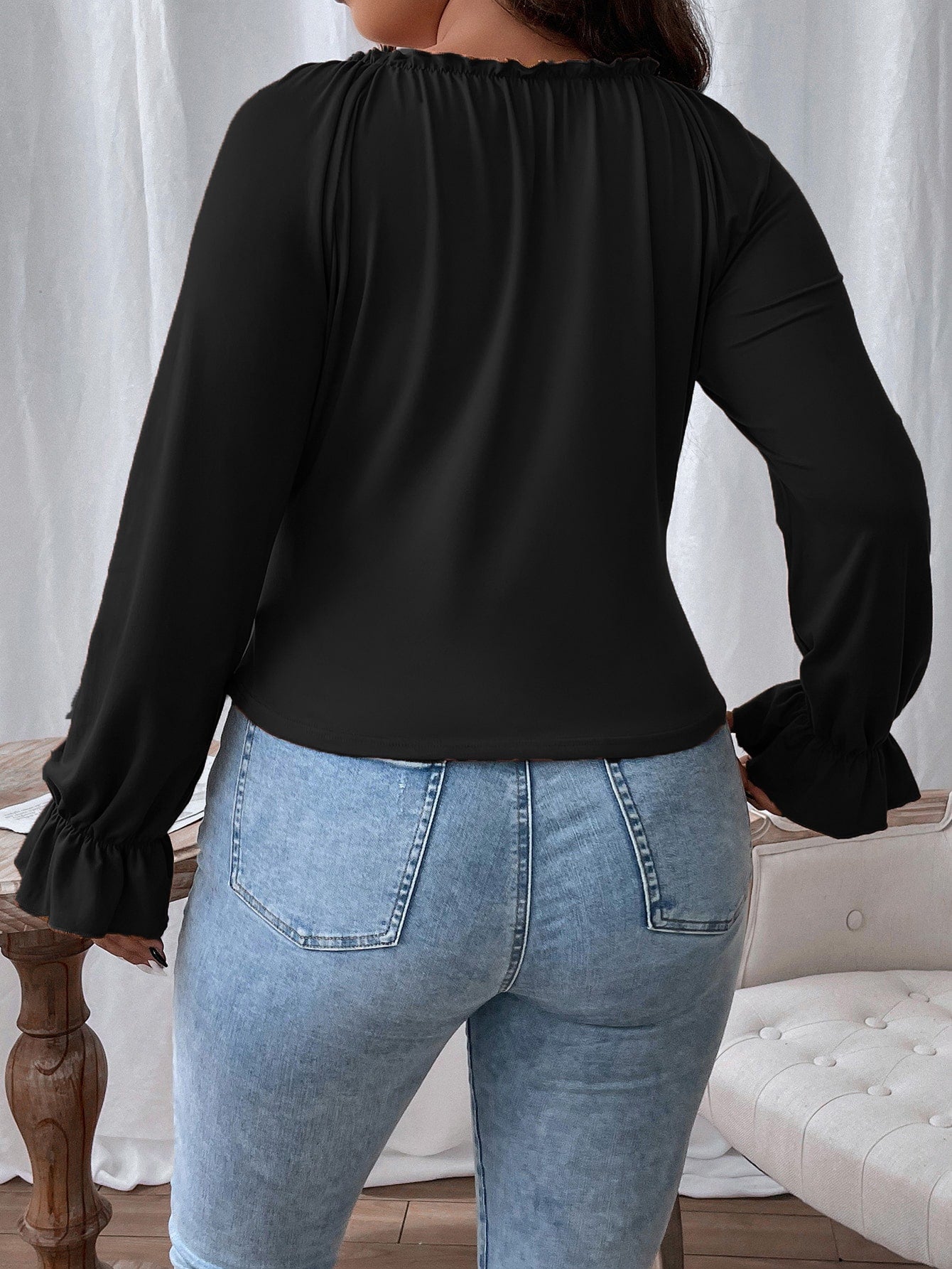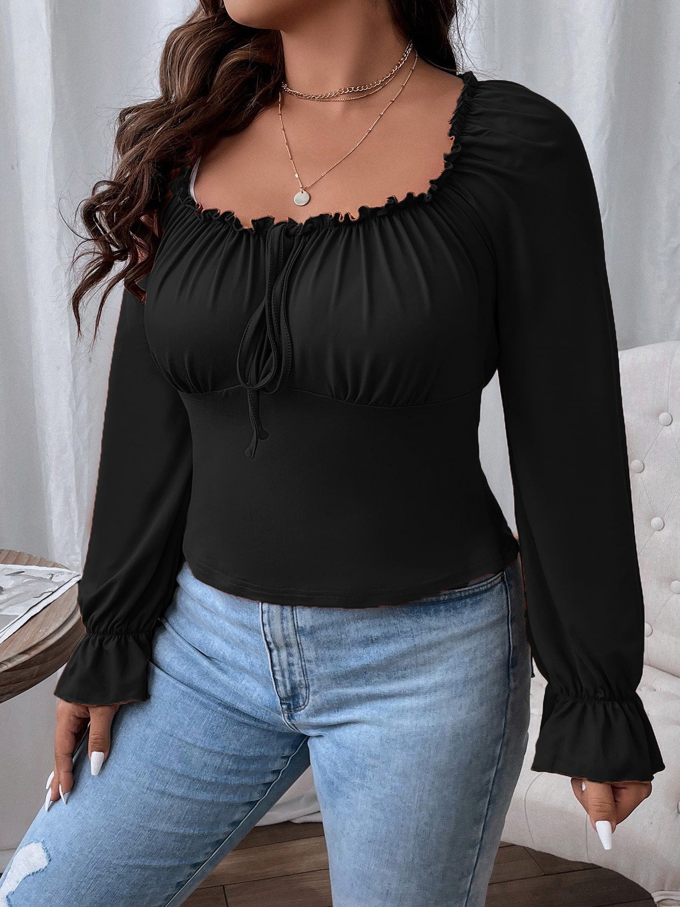 Flirla Plus Frill Trim Knot Front Flounce Sleeve Milkmaid Tee