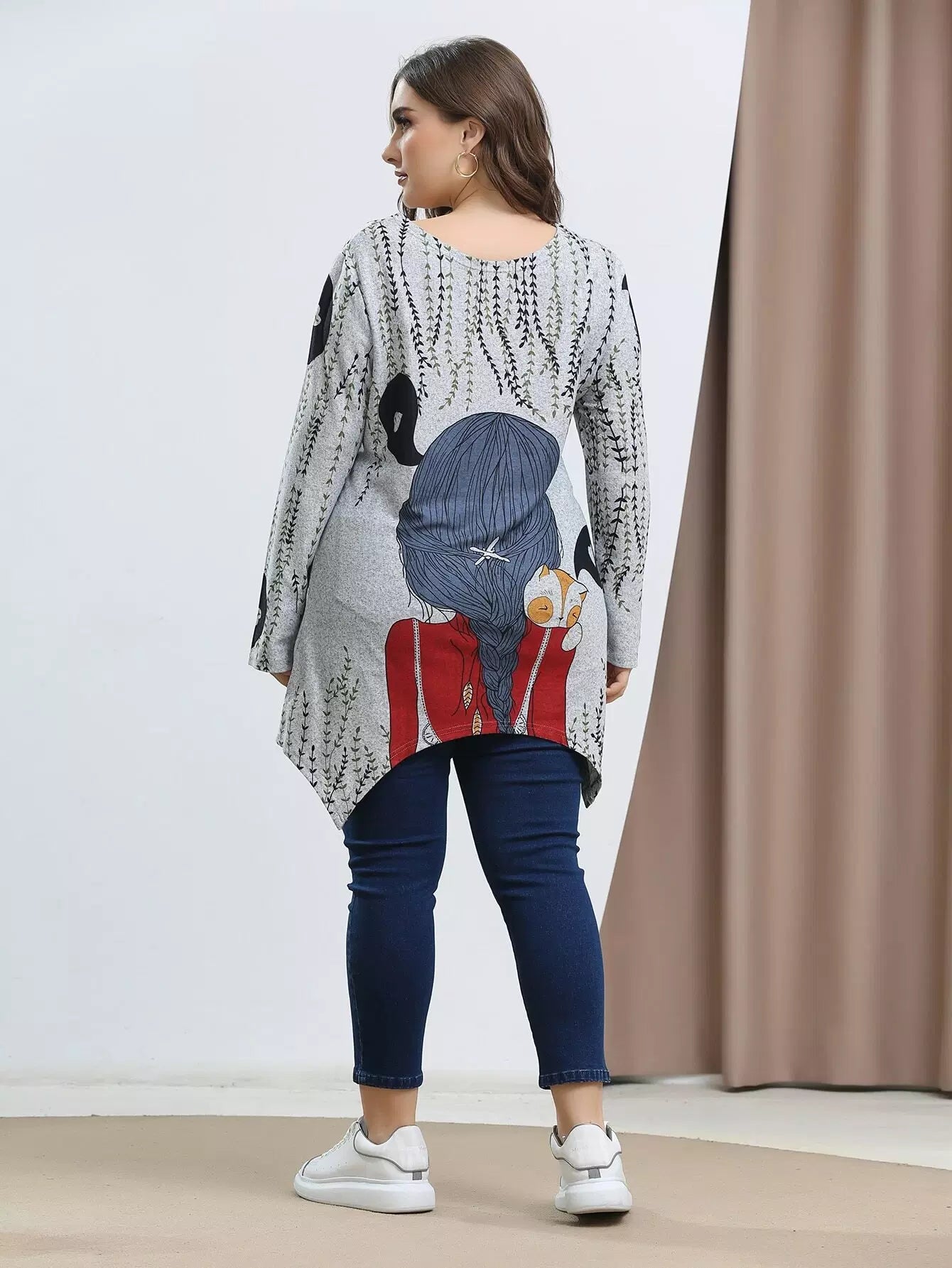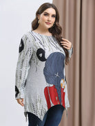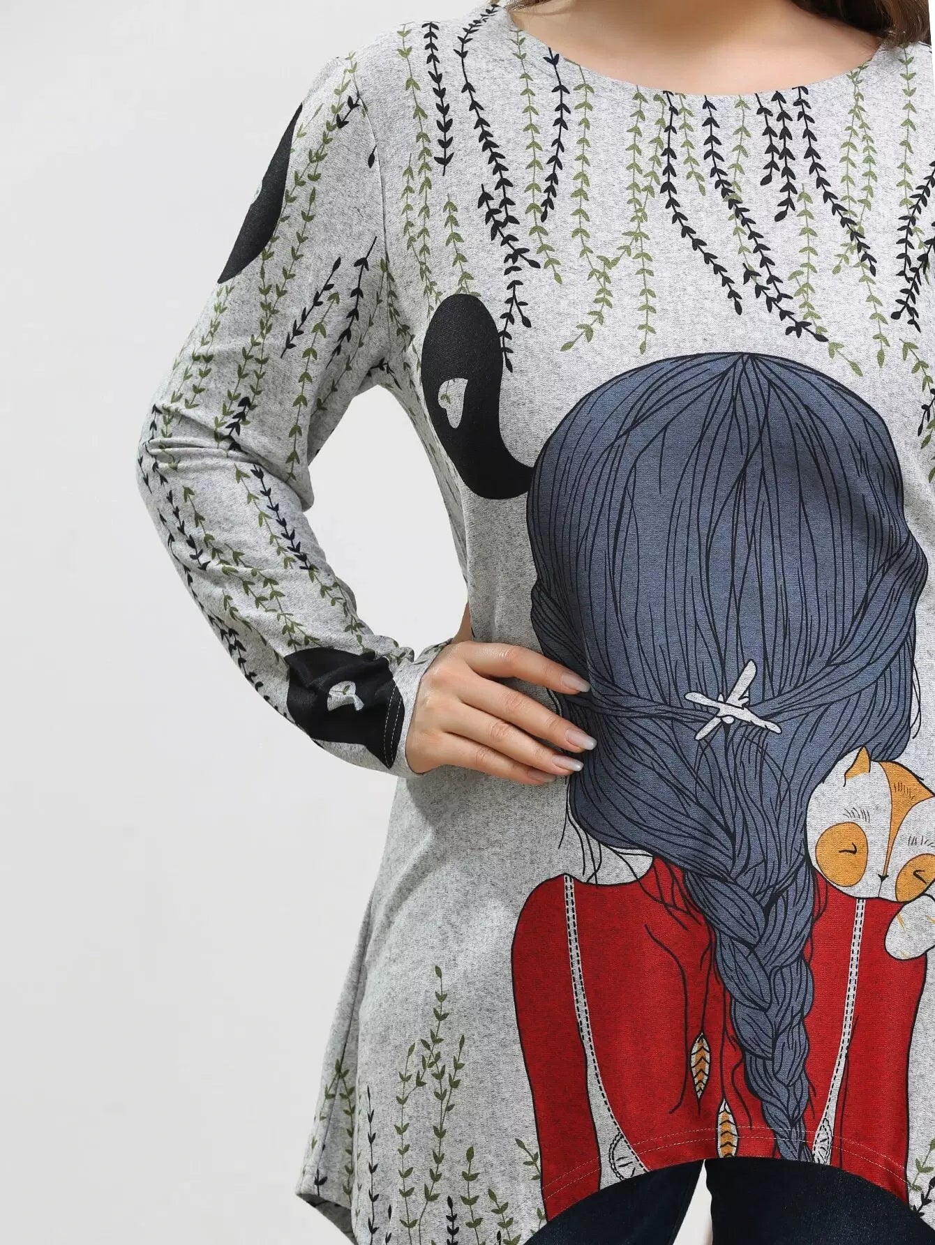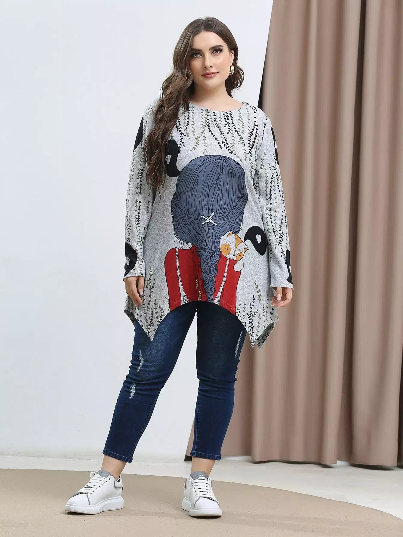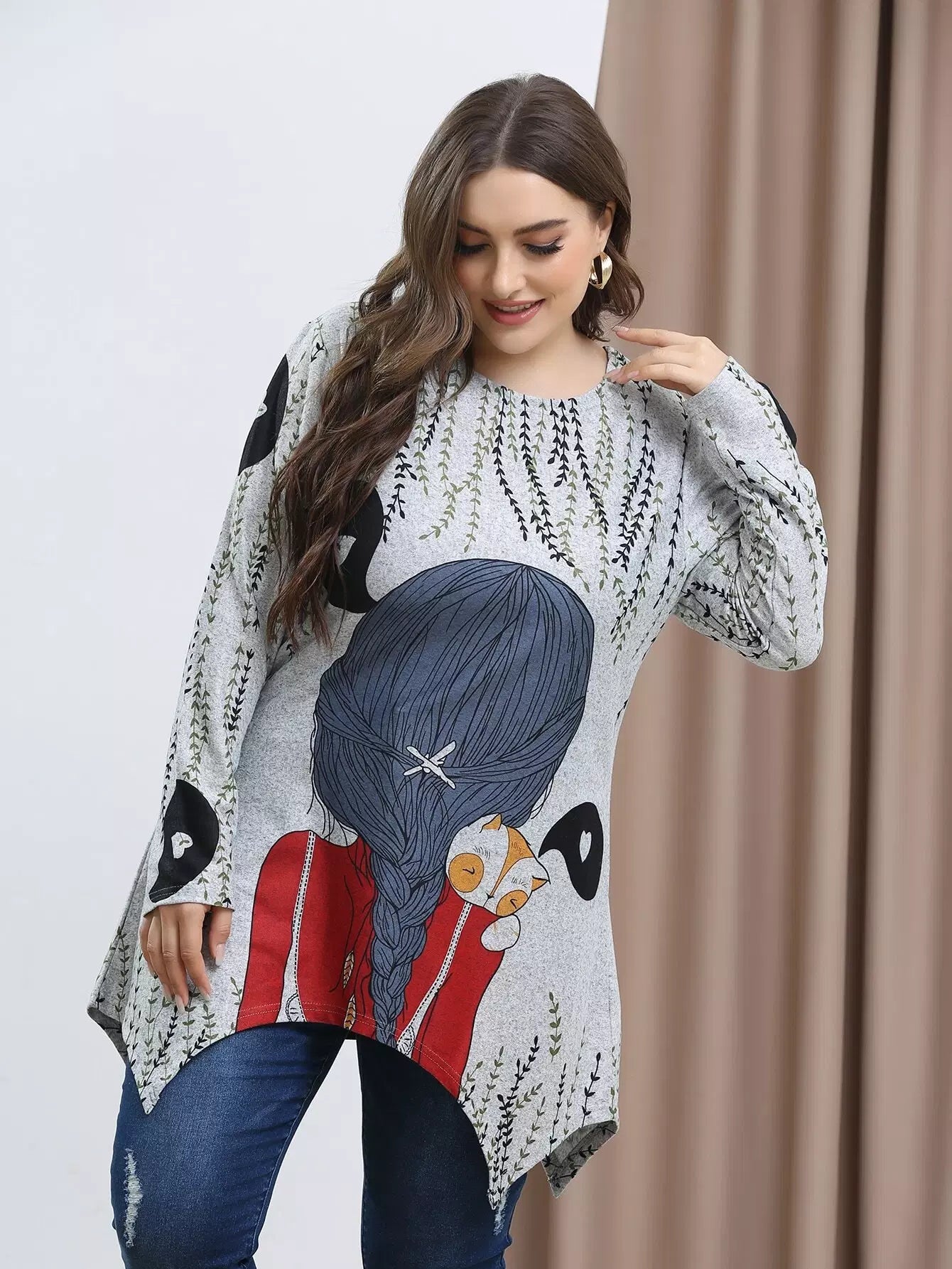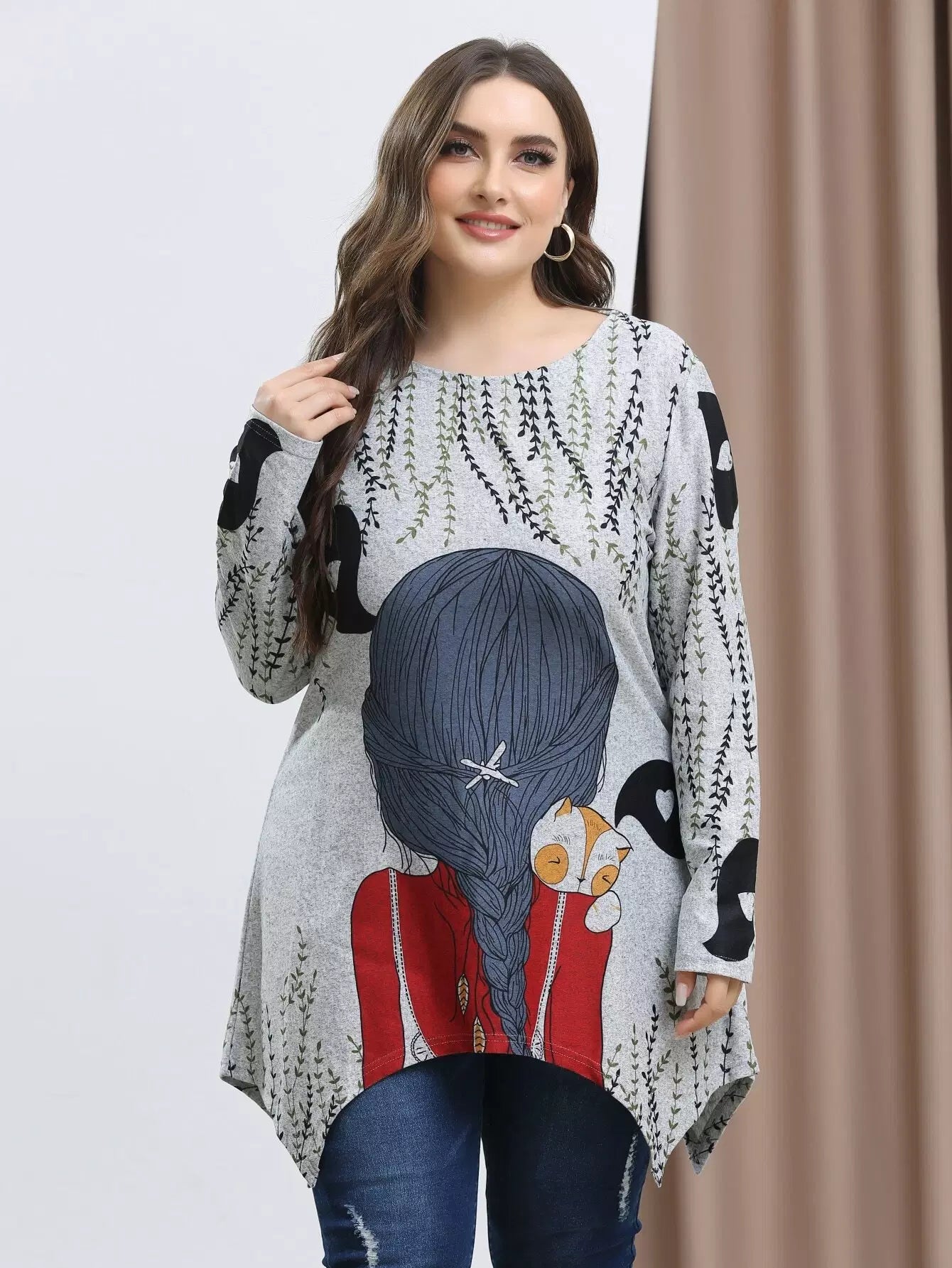 Plus Figure And Plants Print Asymmetrical Hem Tee