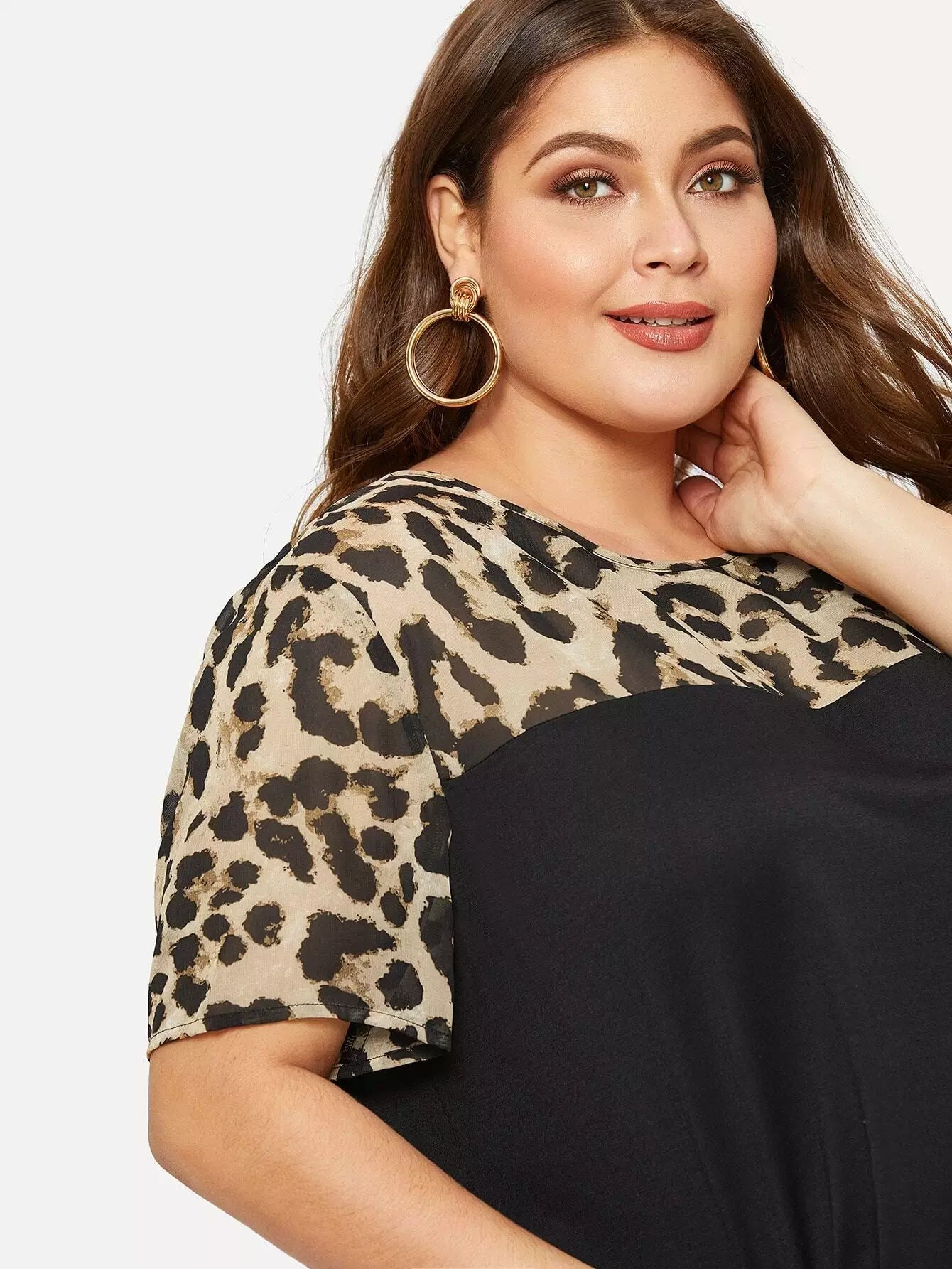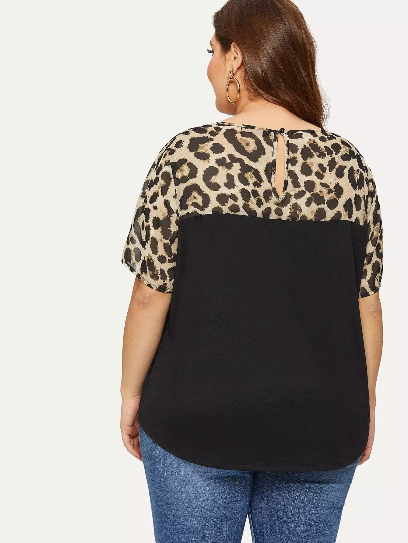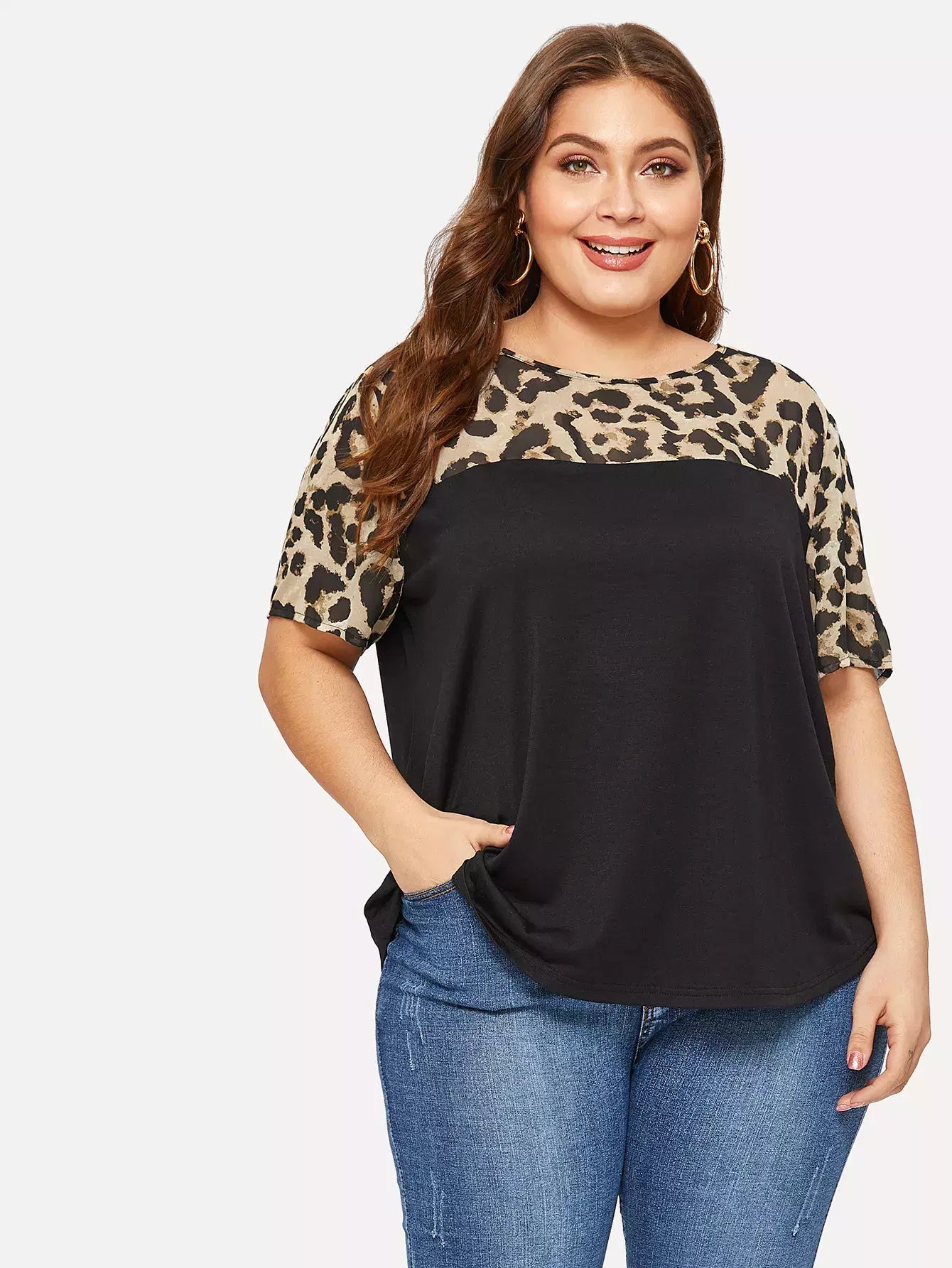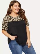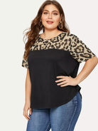 Plus Leopard Yoke Cut-and-sew Curved Hem T-shirt
