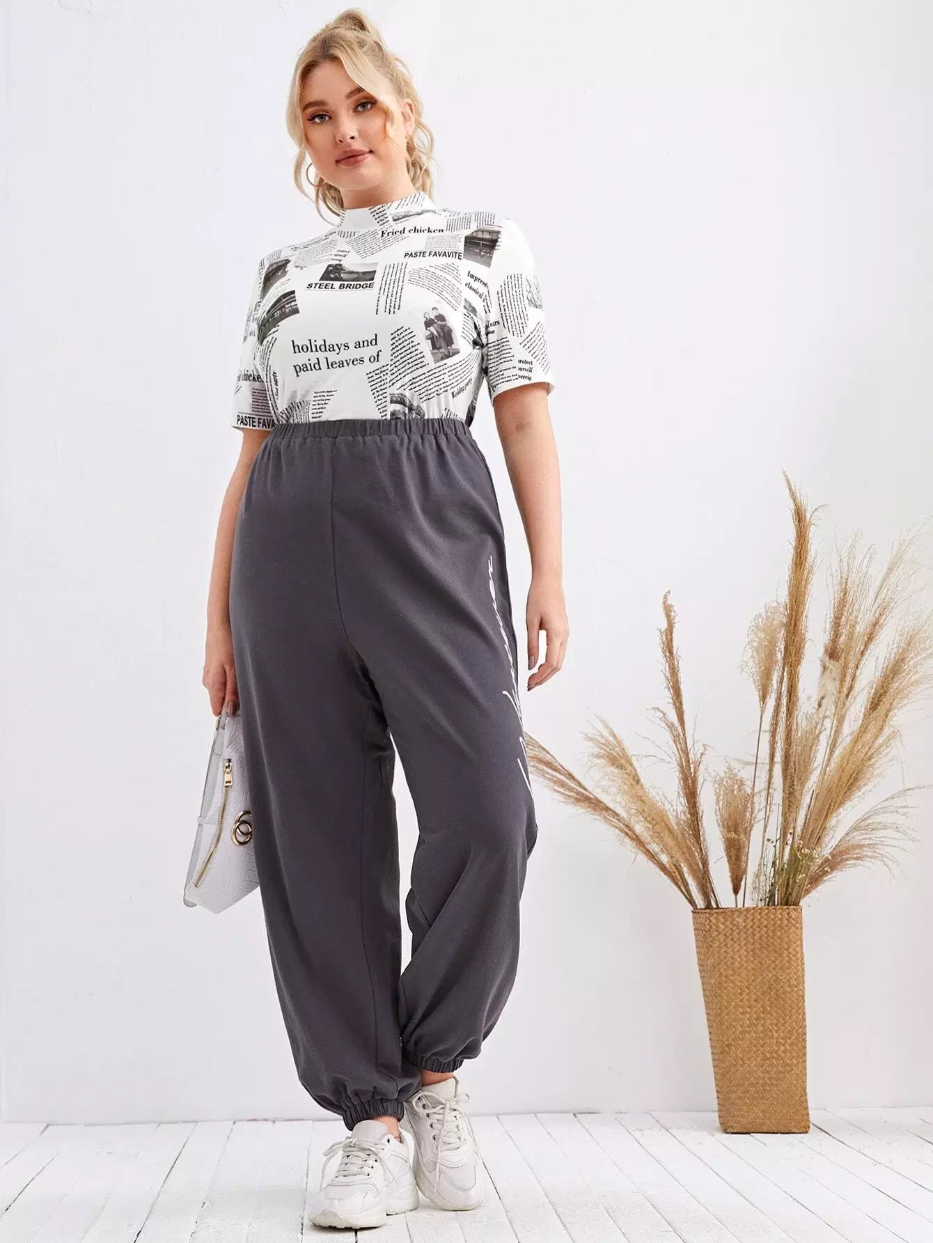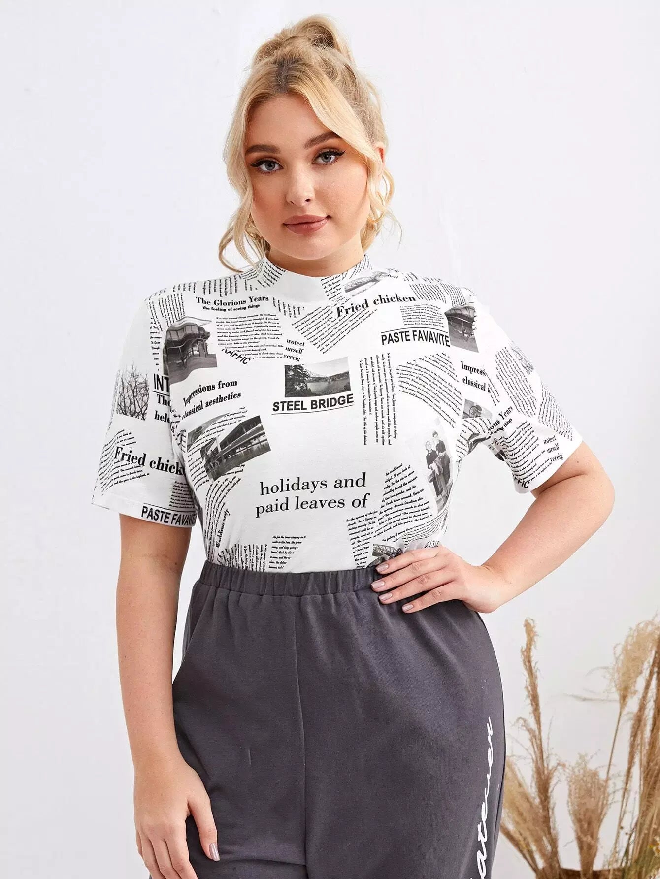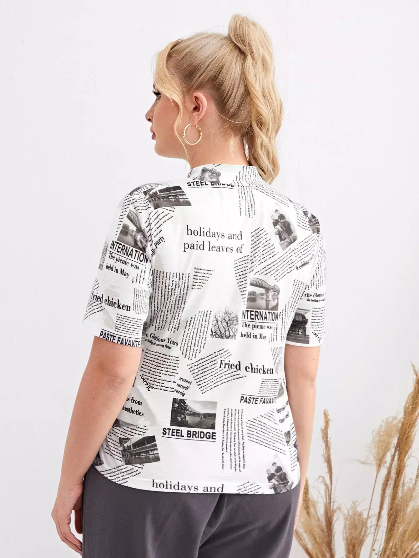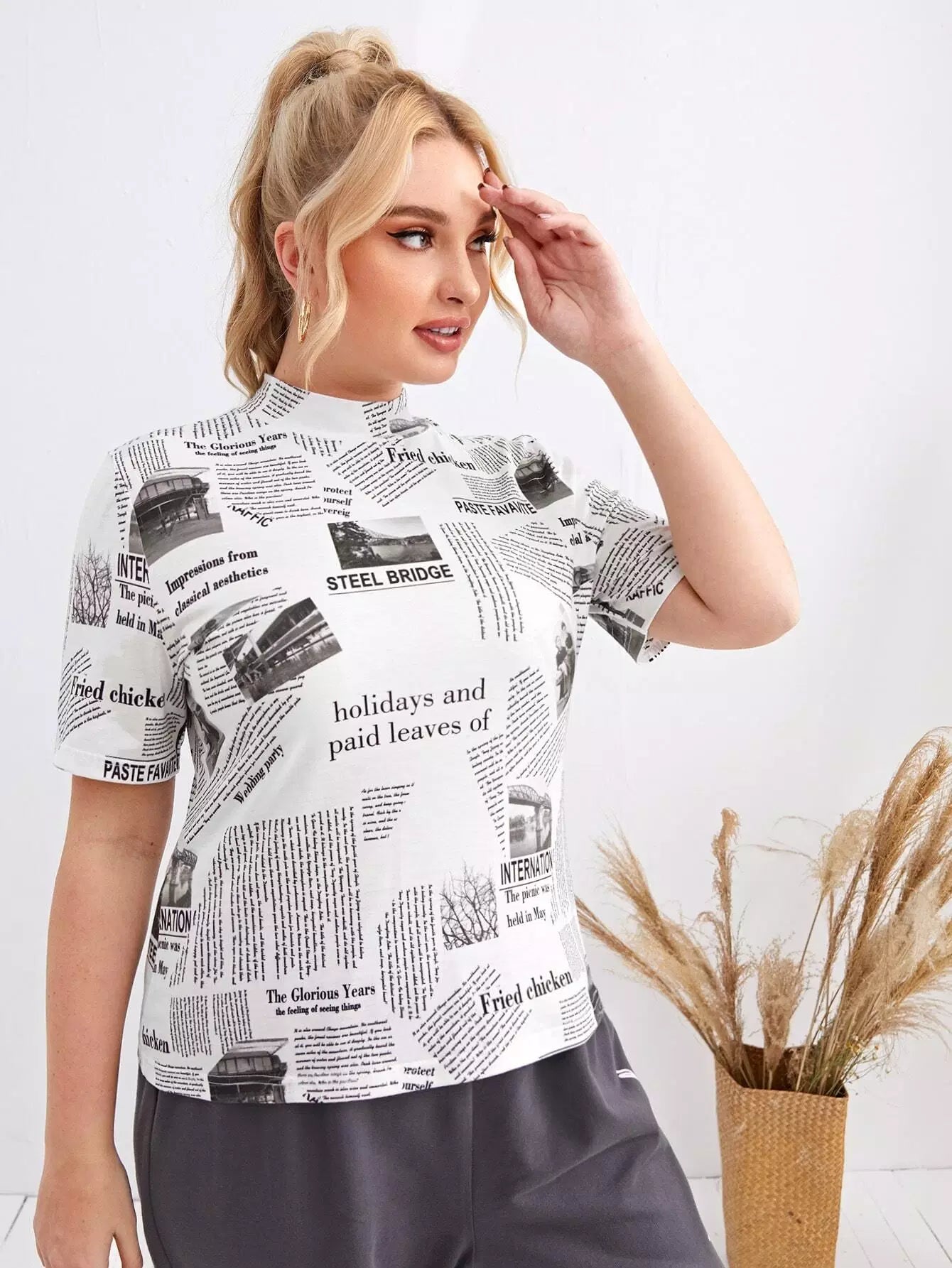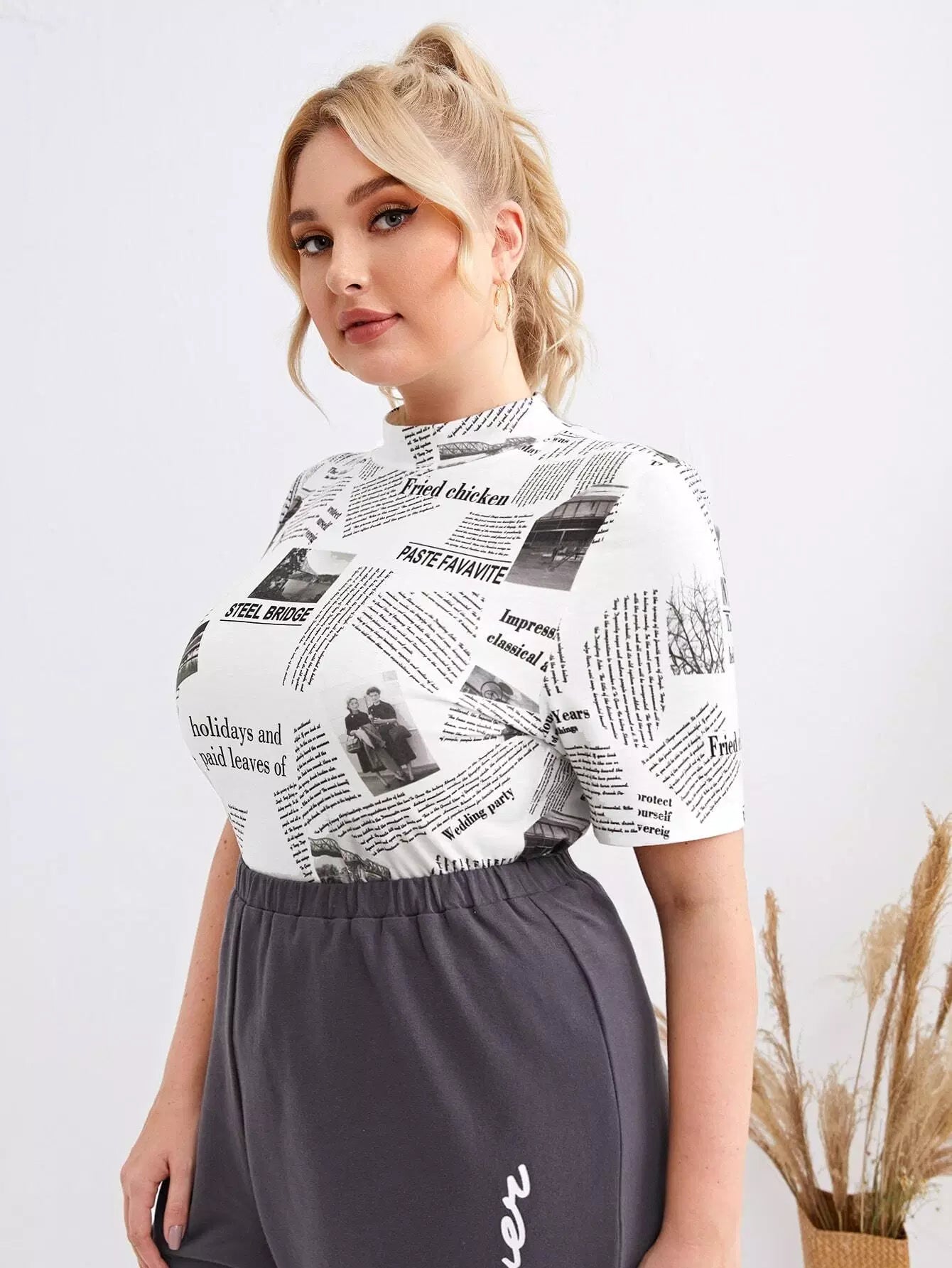 Plus Mock Neck Newspaper Print Top
