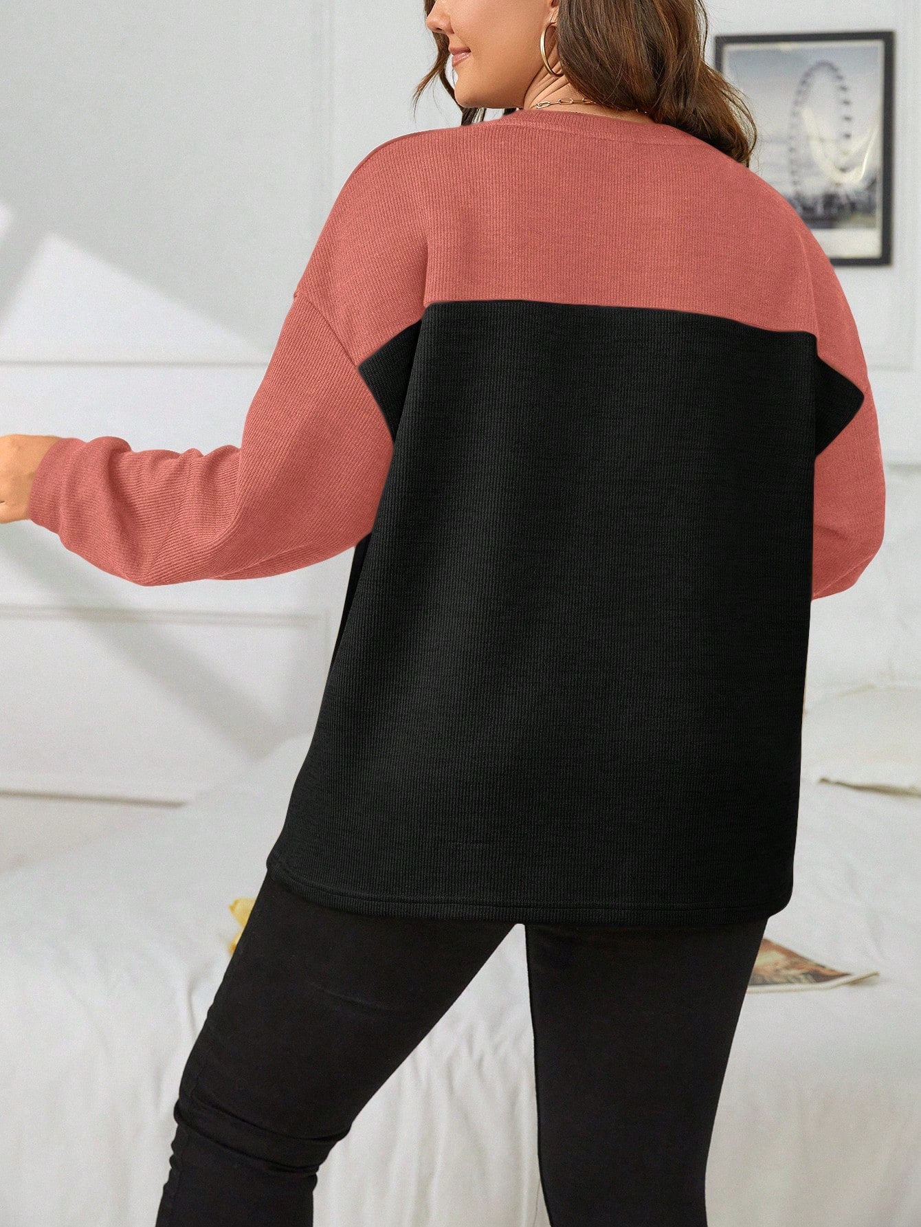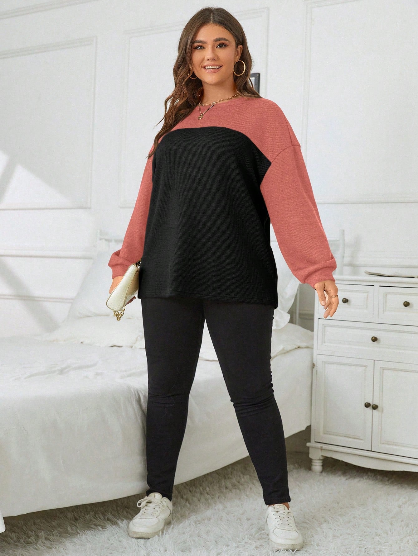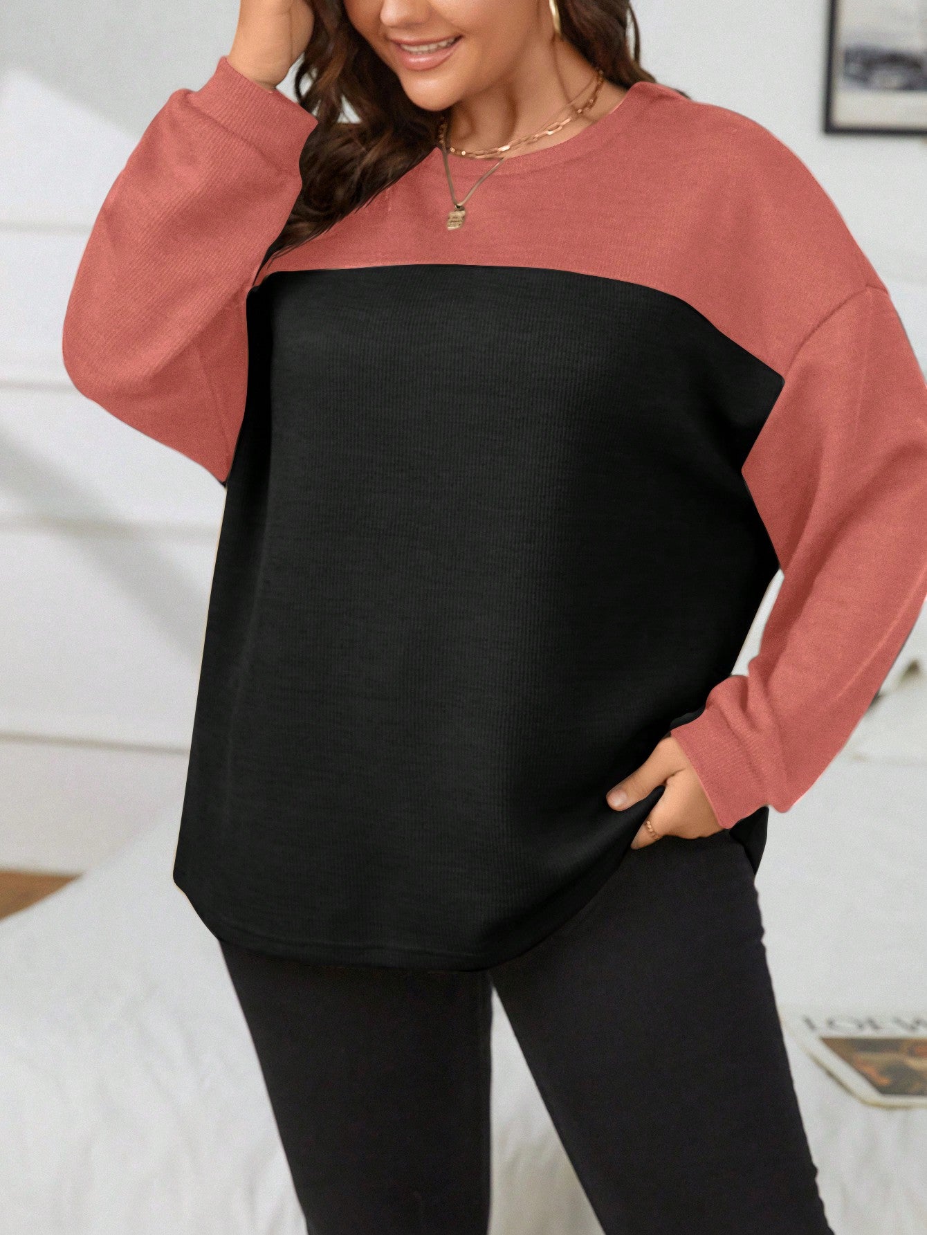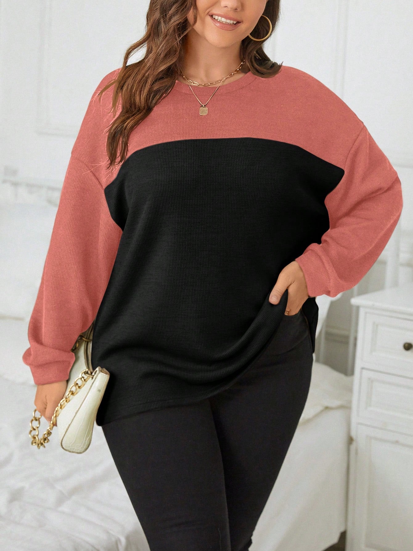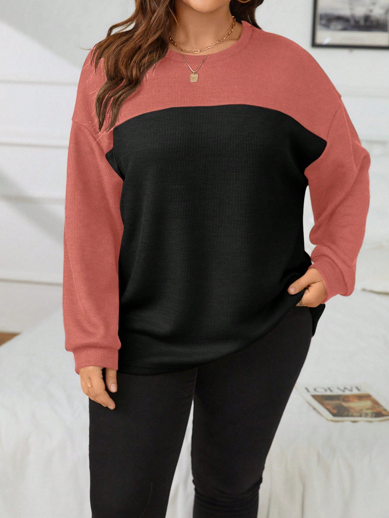 SHEIN Essnce Plus Size Women Two Tone Drop Shoulder Loose Long Sleeve T-Shirt
