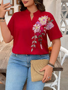 SHEIN LUNE Women Plus Size Summer Stand Collar Embroidered Casual Short Sleeve Shirt