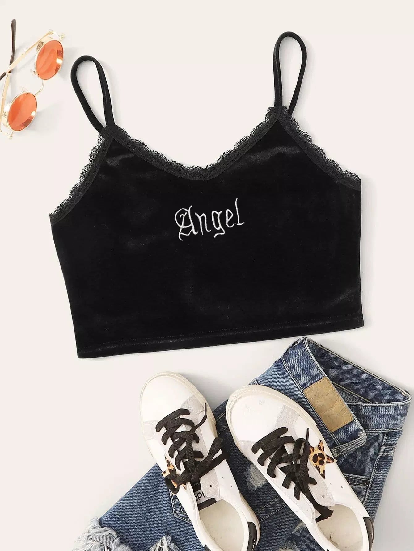 Plus Lace Panel Letter Embroidery Velvet Cami Top