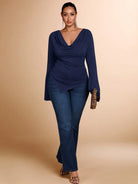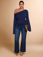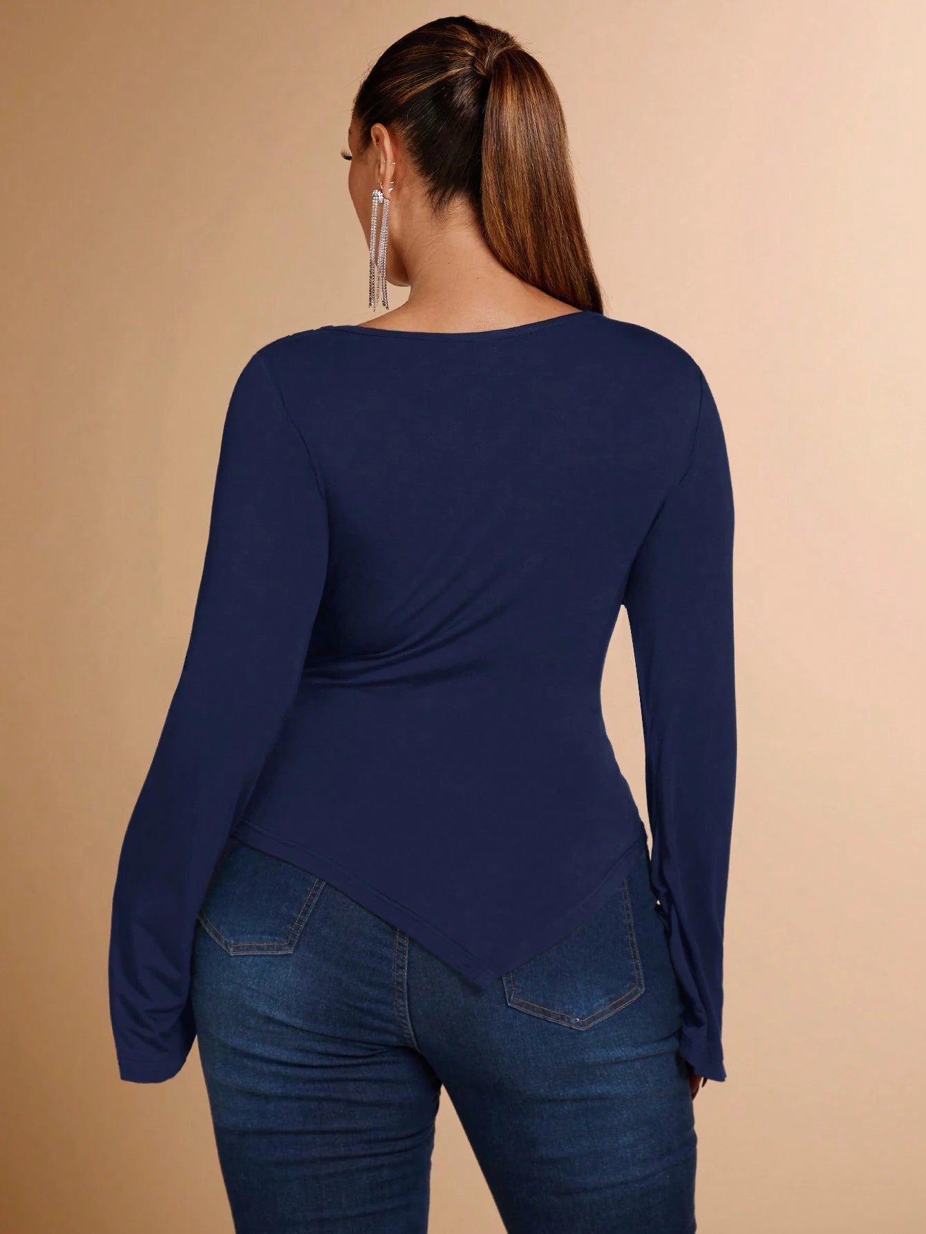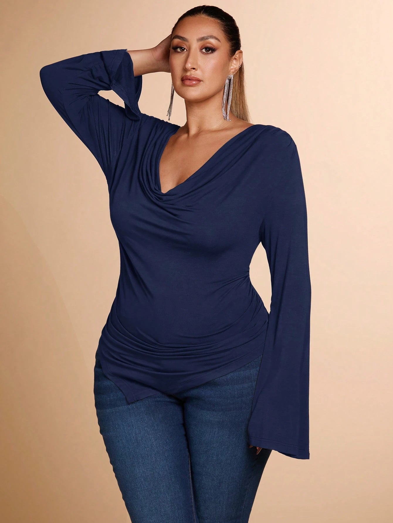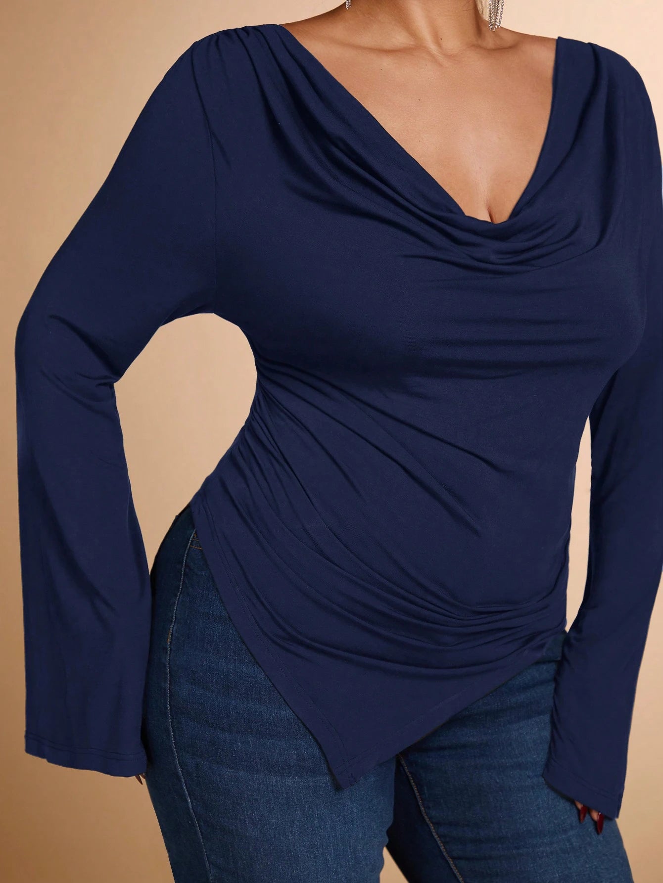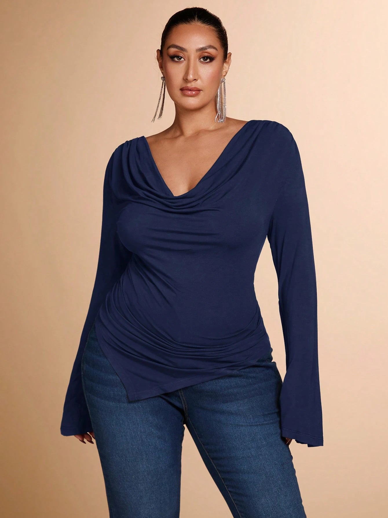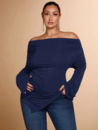 SHEIN BAE Plus Size Women's Elegant Sexy Black Draped Collar One Shoulder Square Hem Knitted T-Shirt Long Sleeve T-Shirt Long Sleeve Top Casual Tops Women Long Sleeve Curve Fall And Winter Tops
