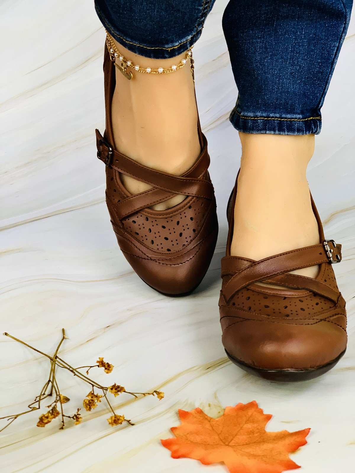 Comfortable beige women's shoes with two straps with decorative eyelets for breathable foot medical low heel
