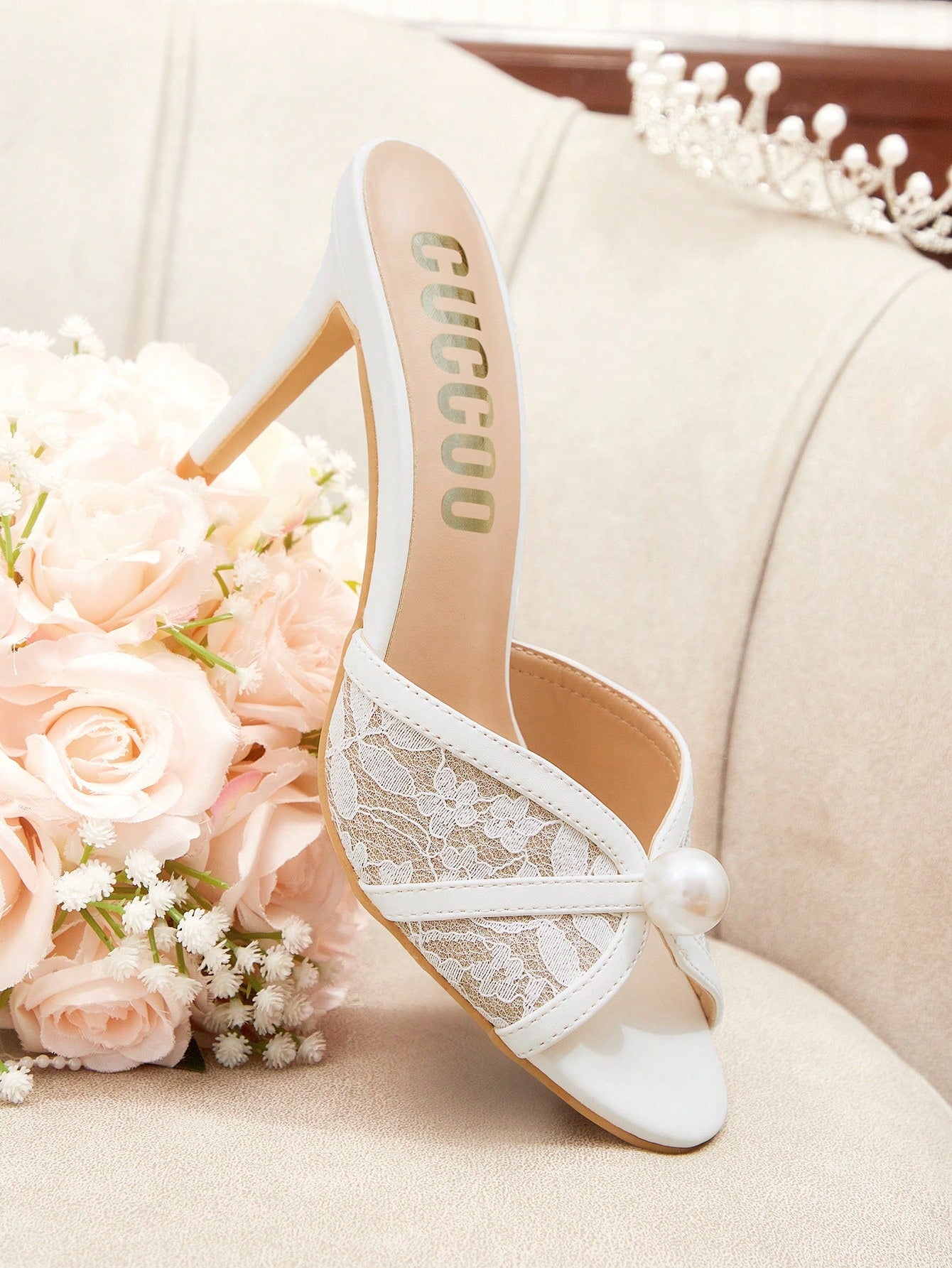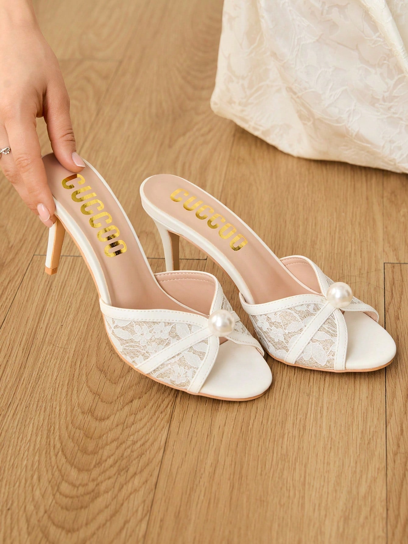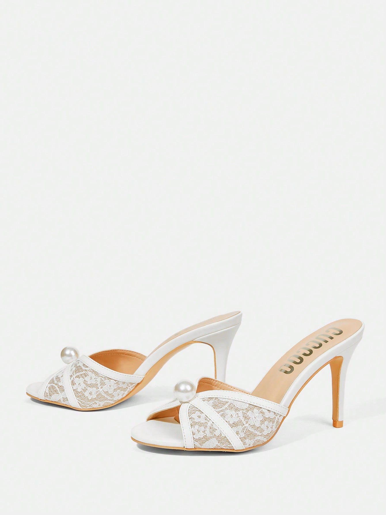 women CUCCOO HITCHD Women's Round Toe Lace & Pearl Decorated High Heel Sandals
