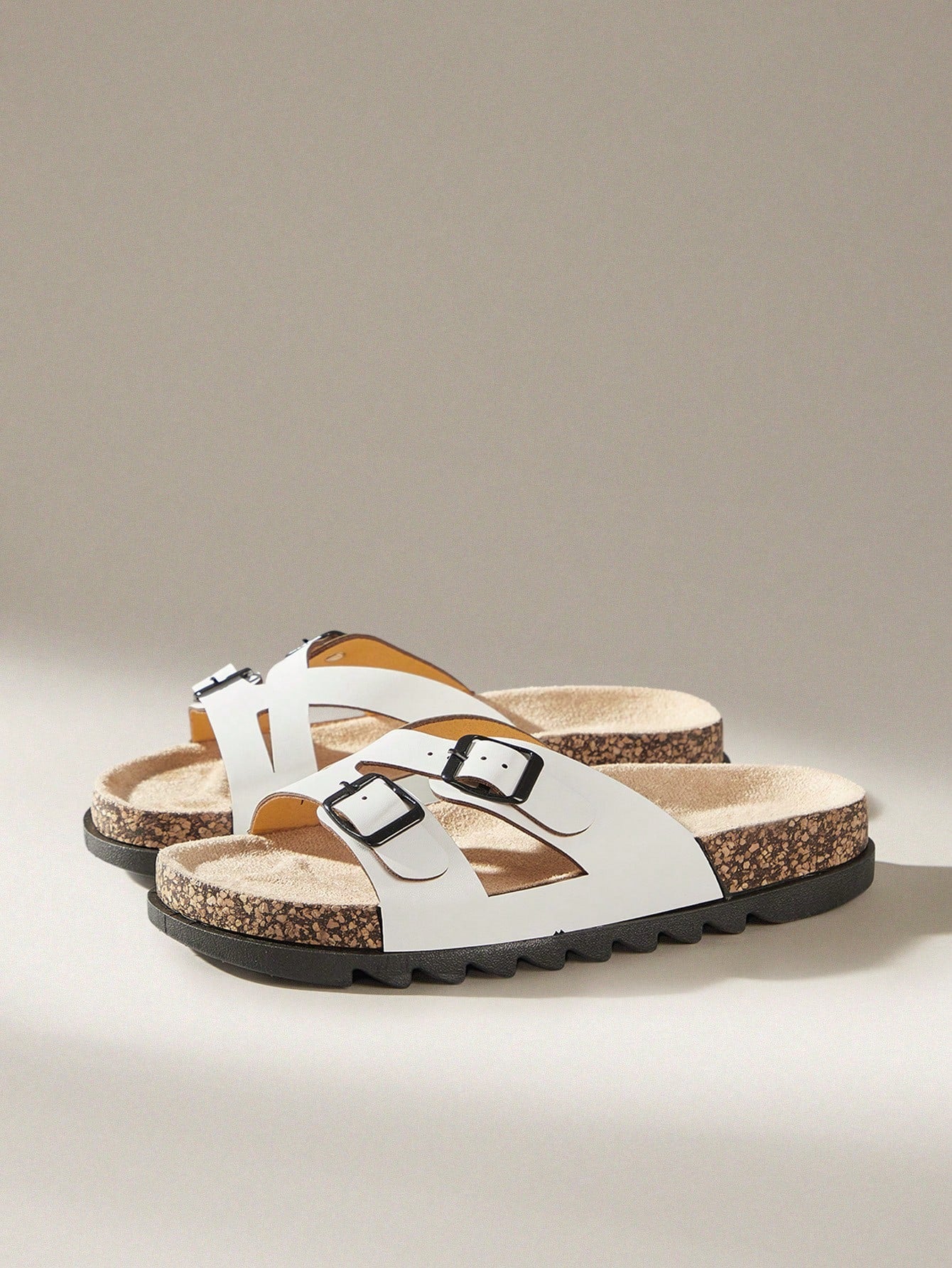 Solecia Fashionable White Strap With Buckle Decor Comfortable Thick Sole Flat Sandals