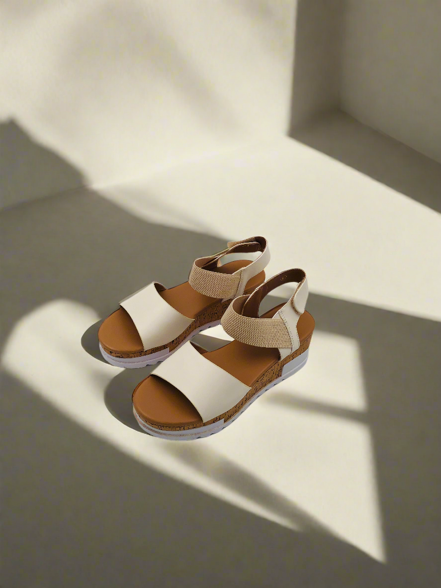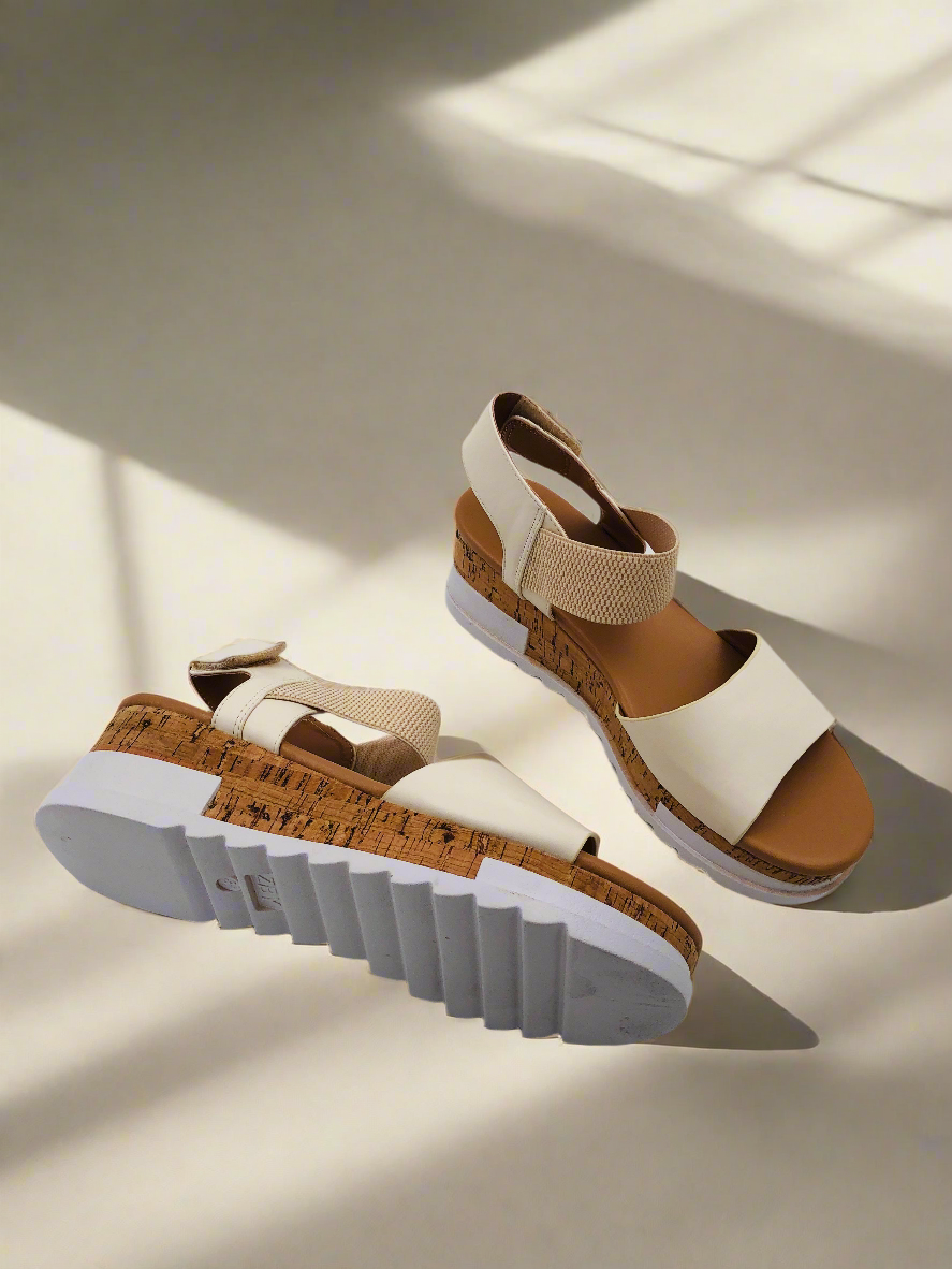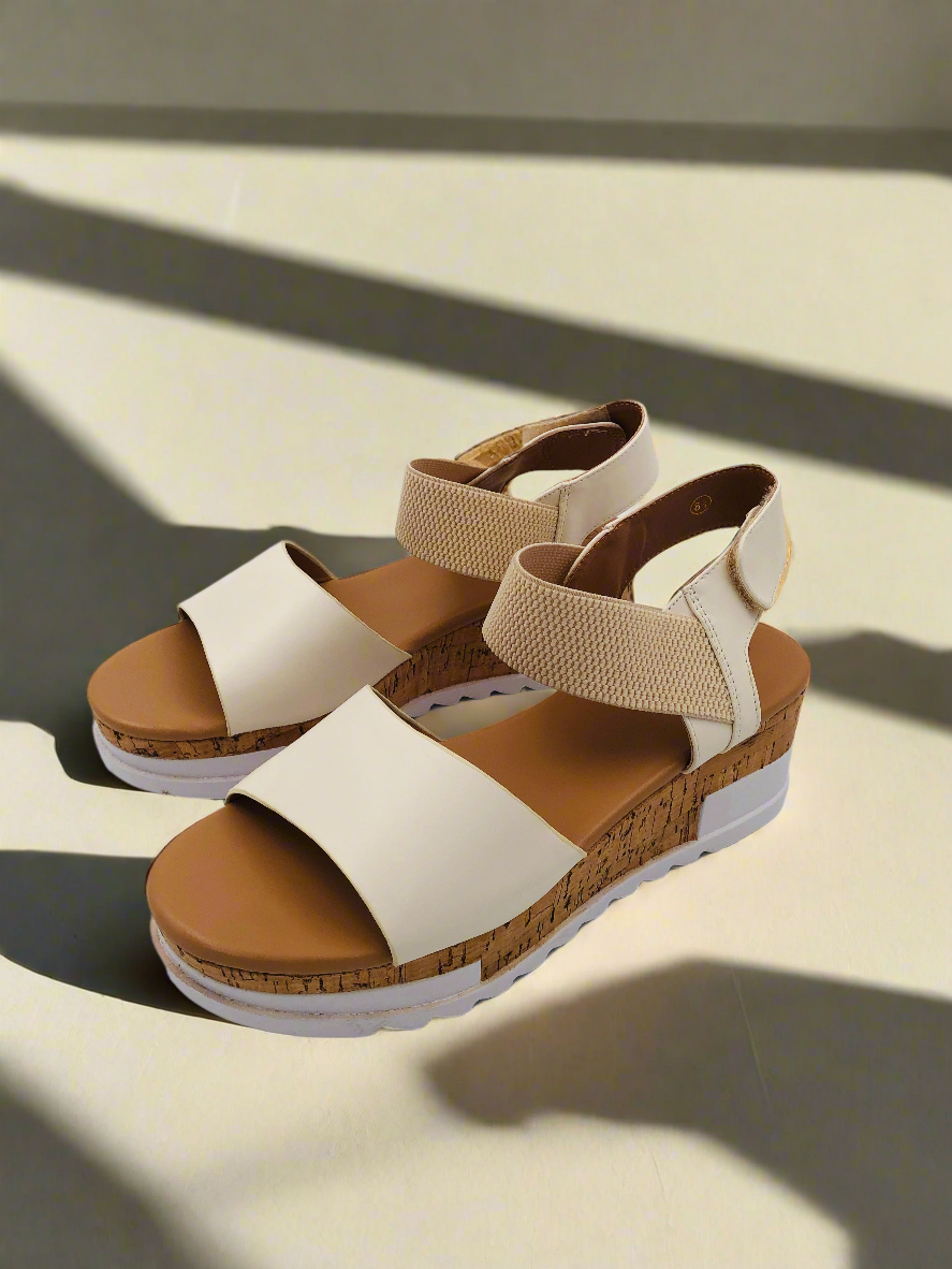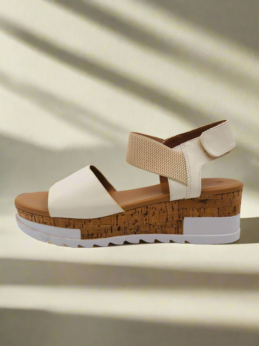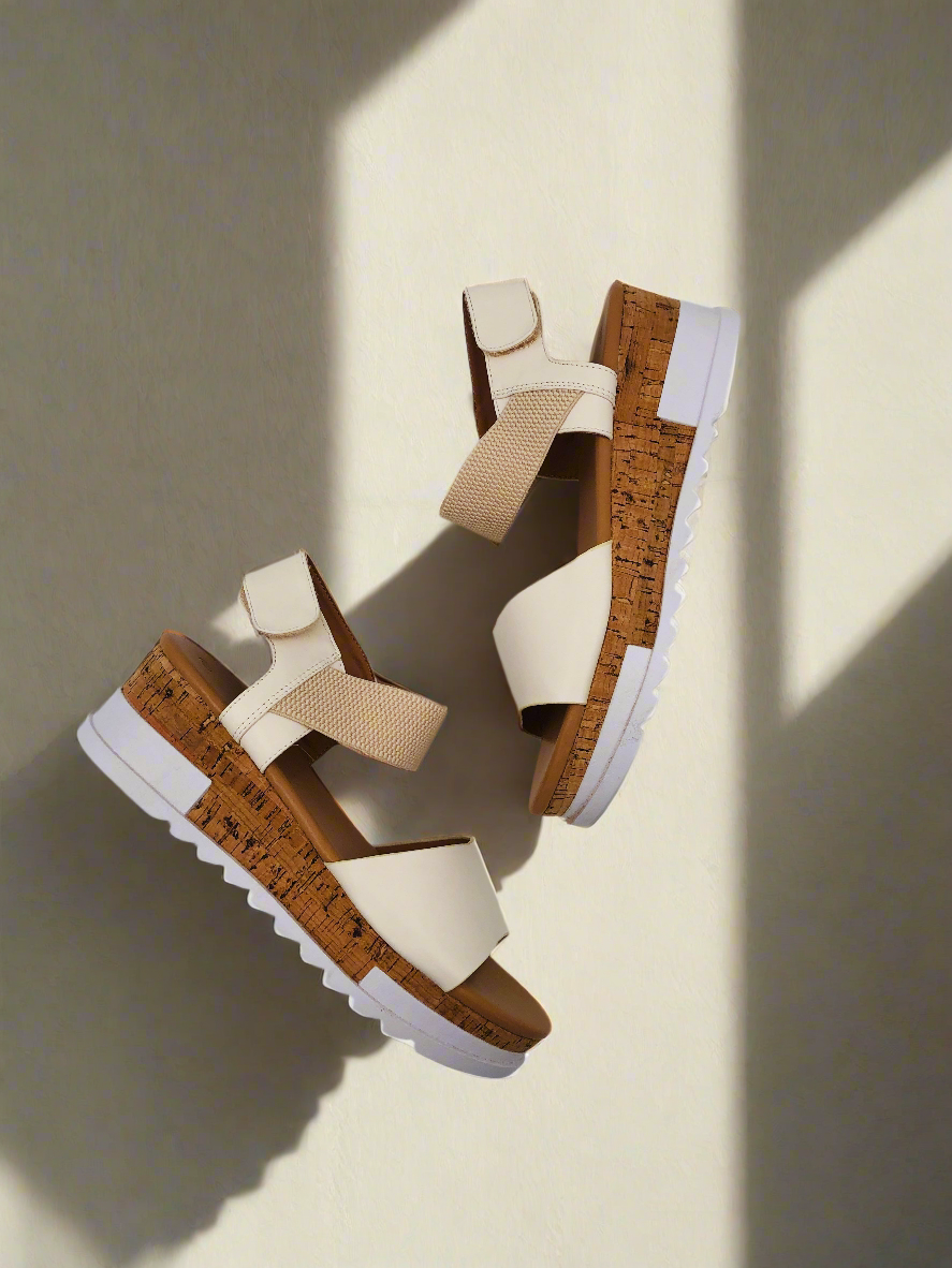 White open-toe platform sandals with a light brown cork wedge heel and ankle strap, perfect for a summery and fashionable look.