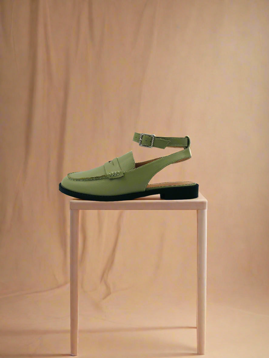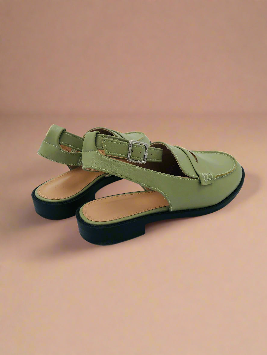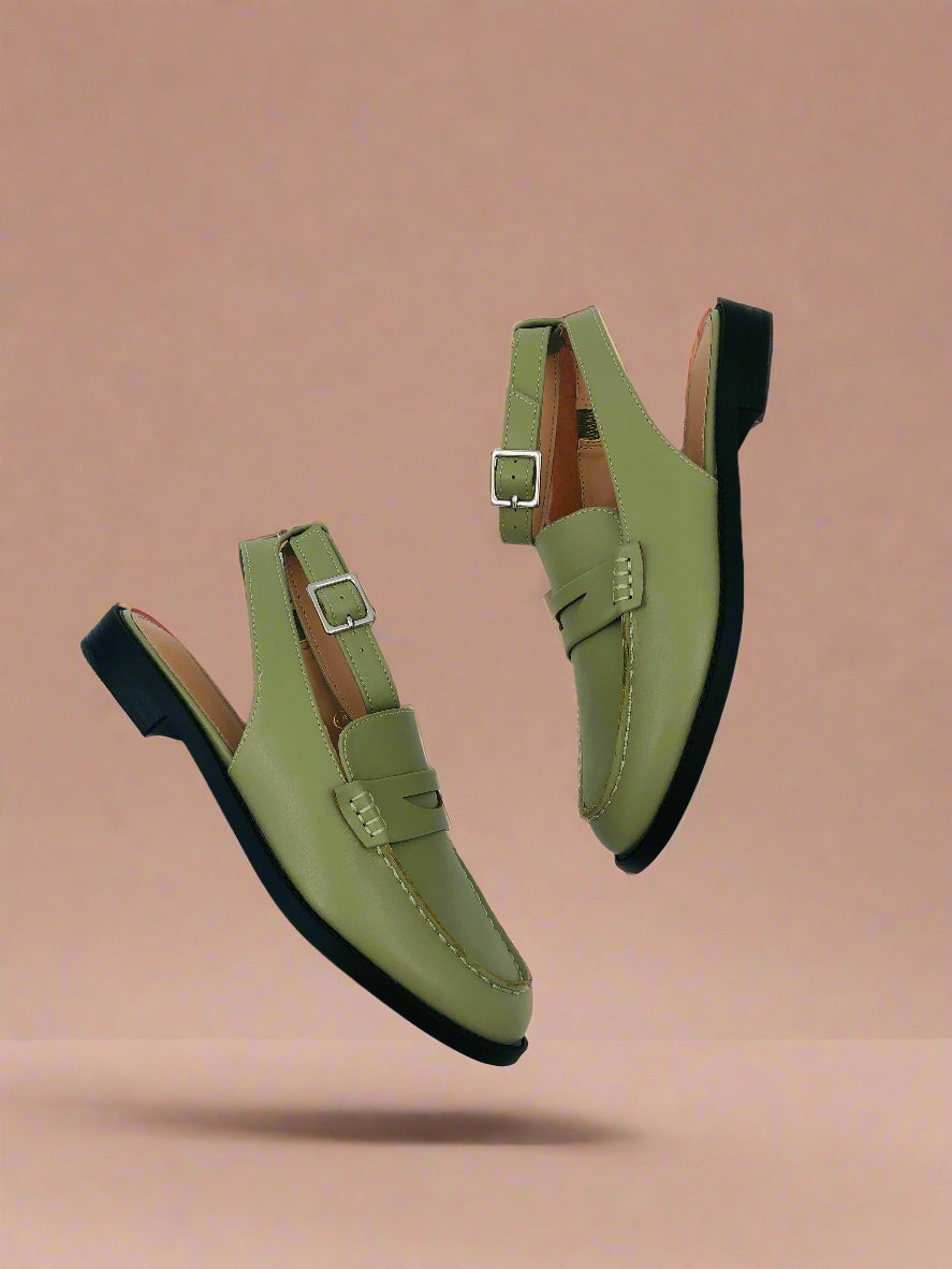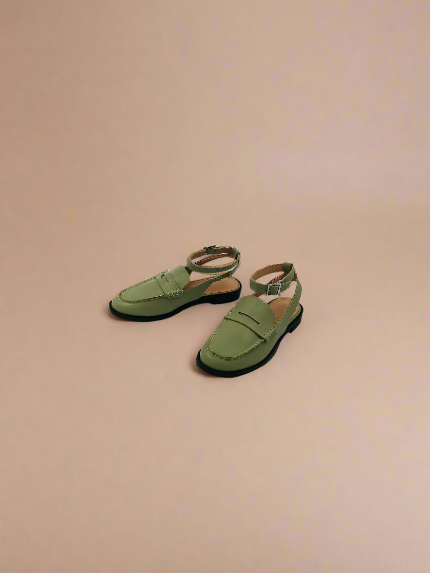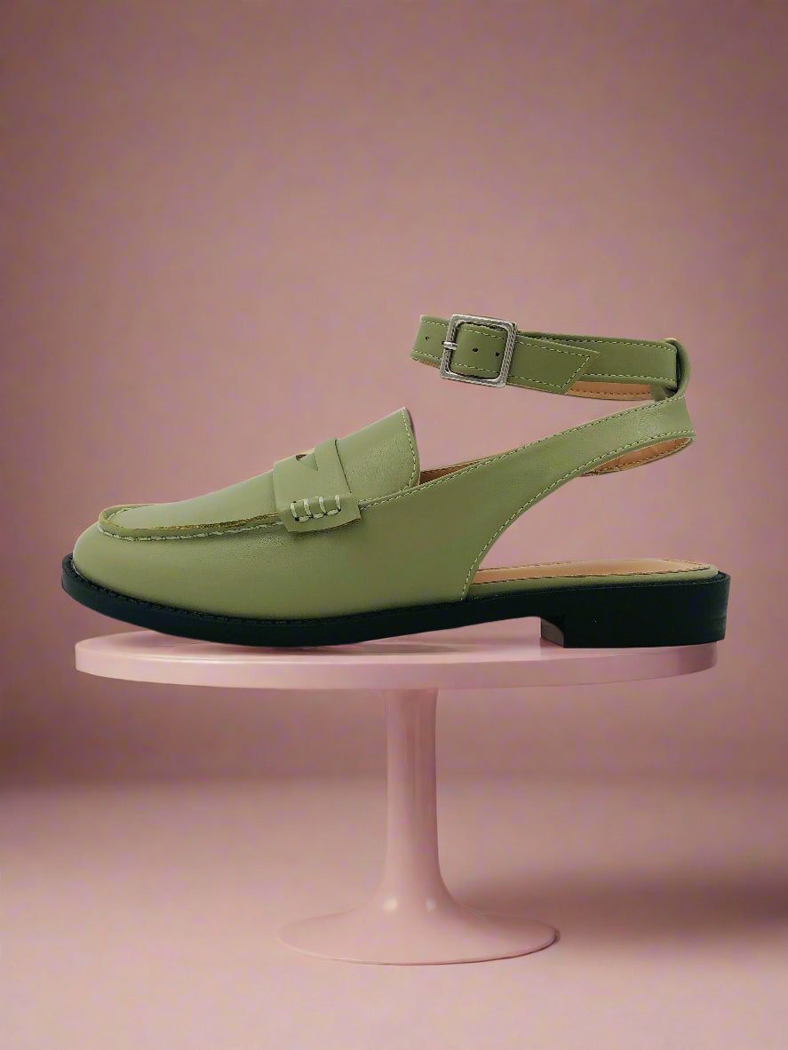 Women's olive green flat slingback loafers with adjustable ankle strap, provides a perfect fit for your feet, ideal for office wear, and designed for all-day comfort.