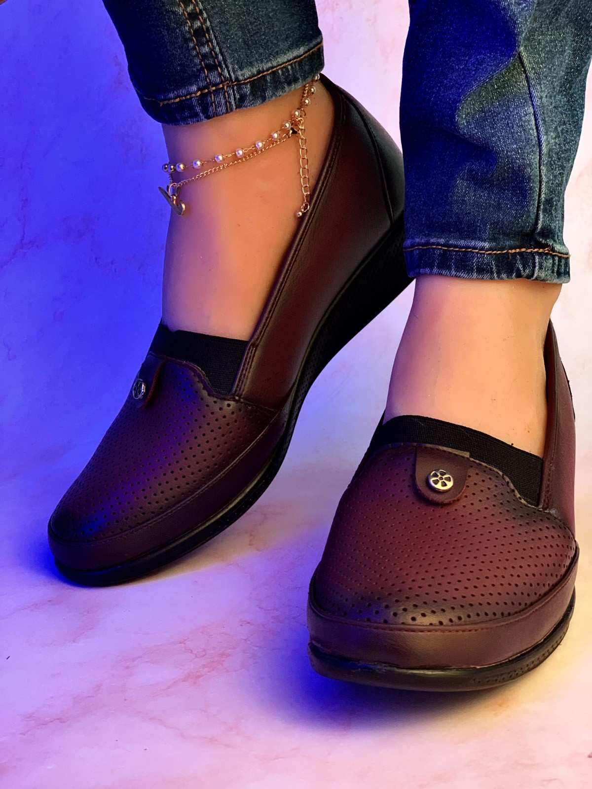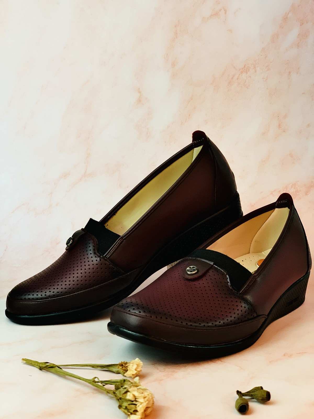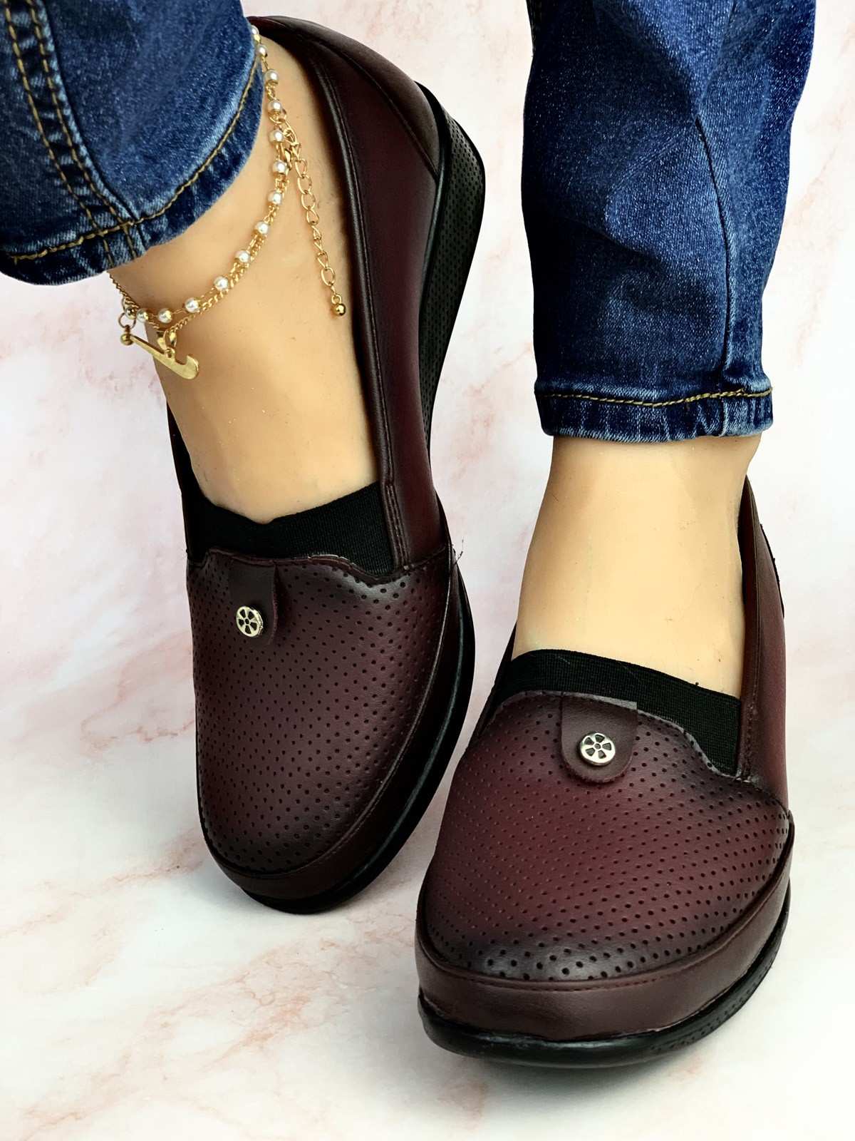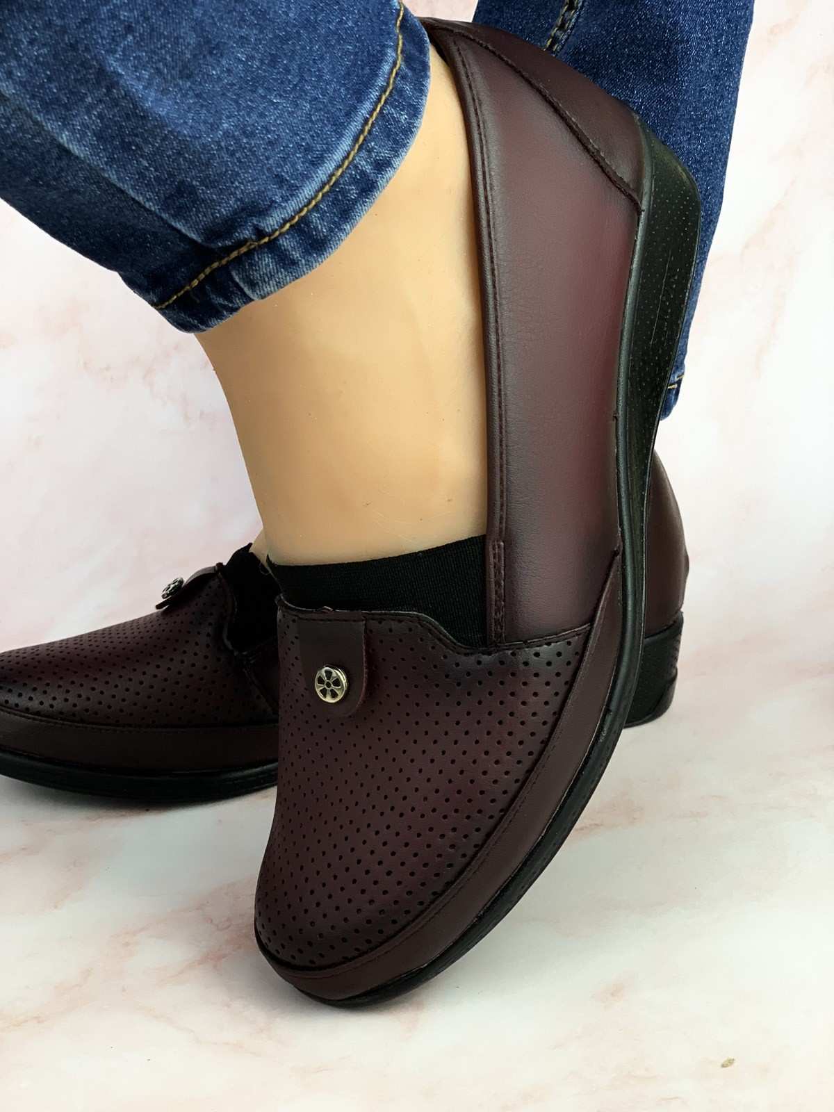Comfortable burgundy women's shoes with decorative eyelets and breathable feet, medical mid-heel