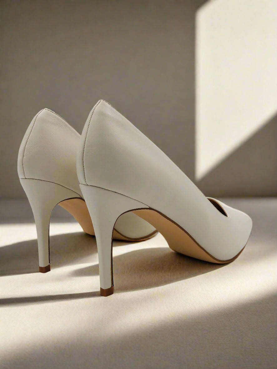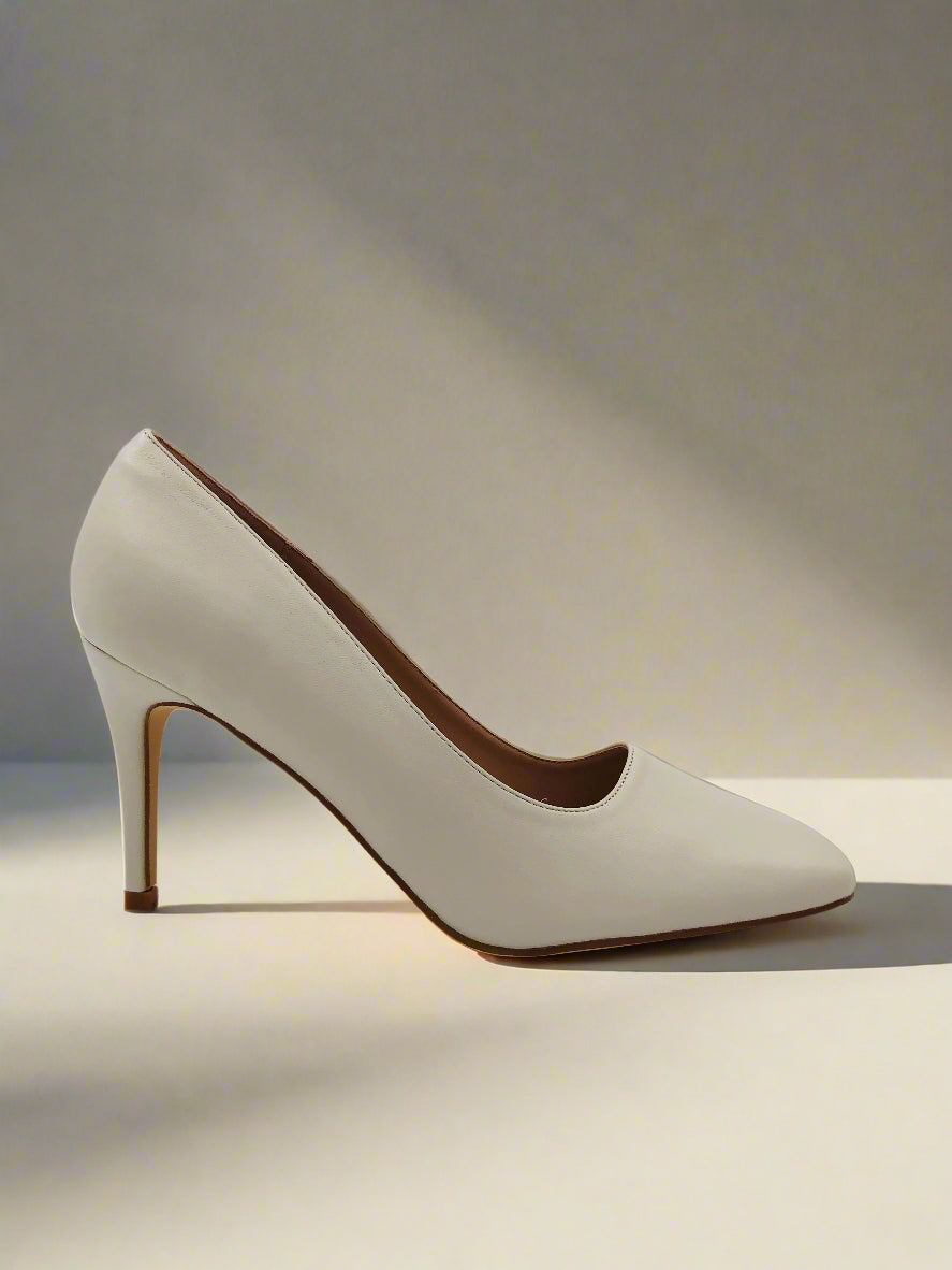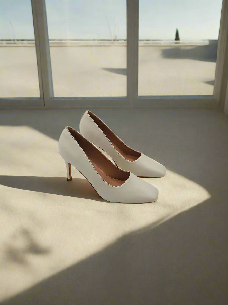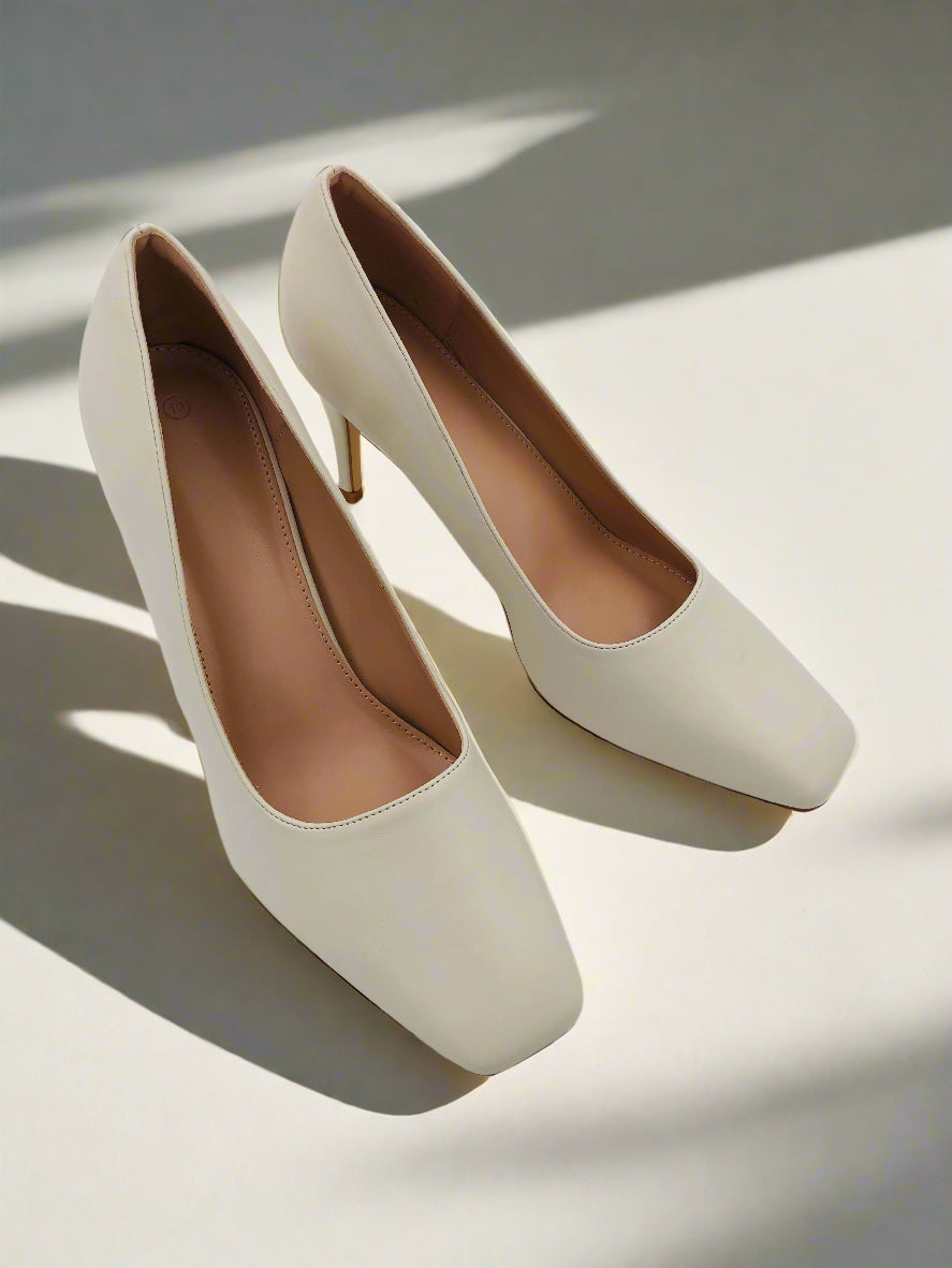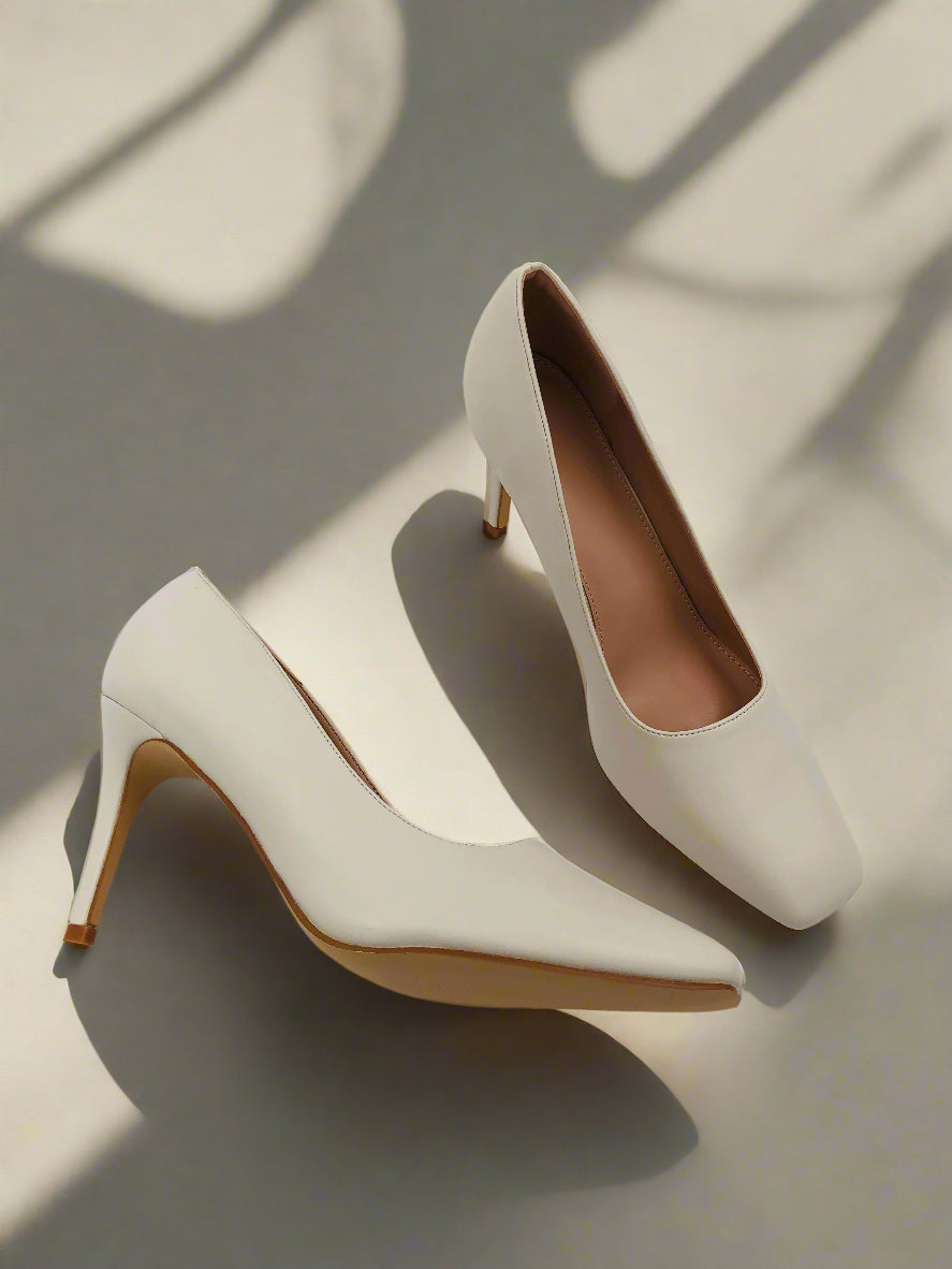 White stiletto heel court shoes with a square toe, featuring a high heel for an elegant look, perfect for both formal and casual occasions.