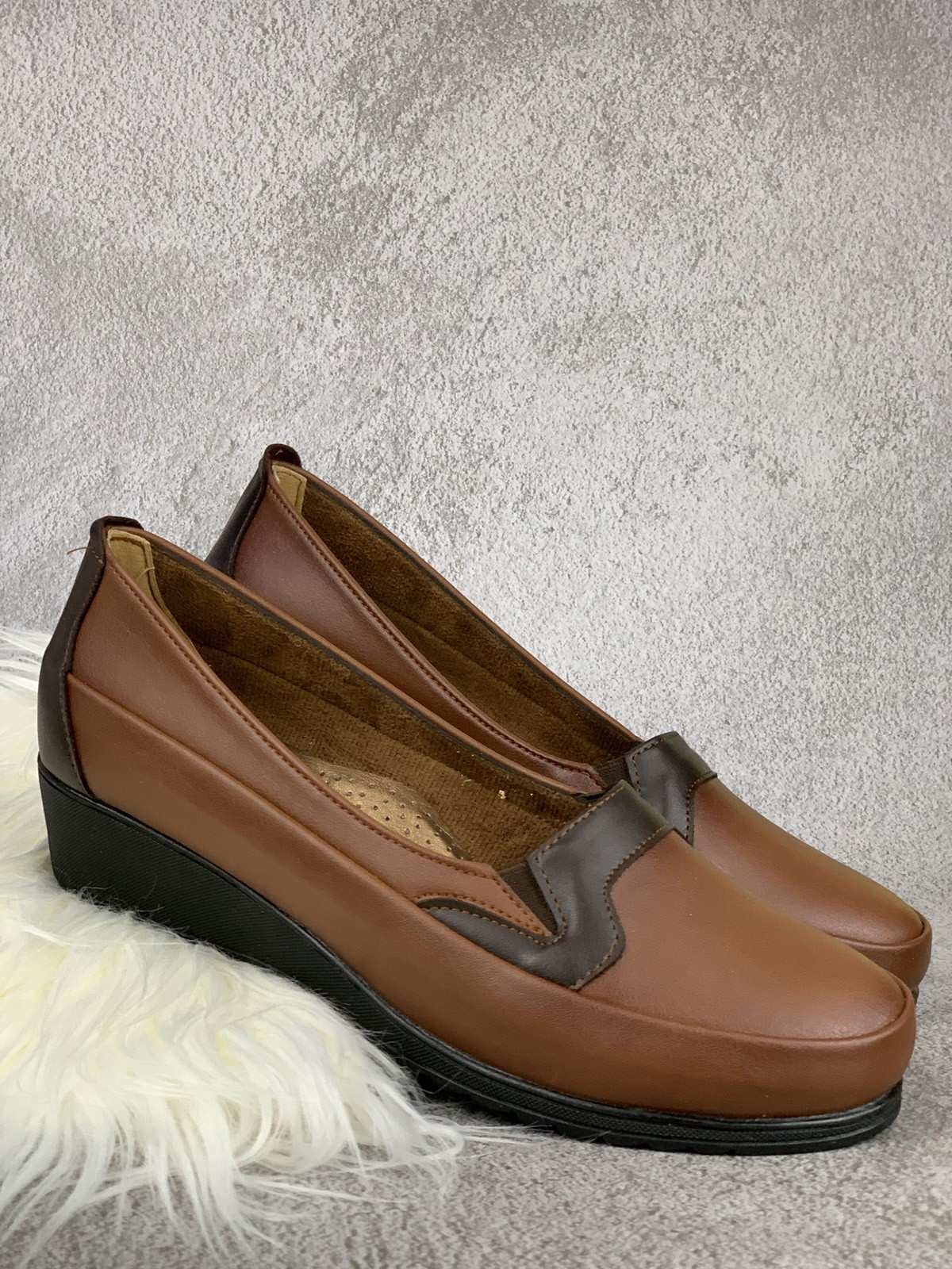 Comfortable light brown women's shoes with a dark leather toe with an elastic band, medical medium heel
