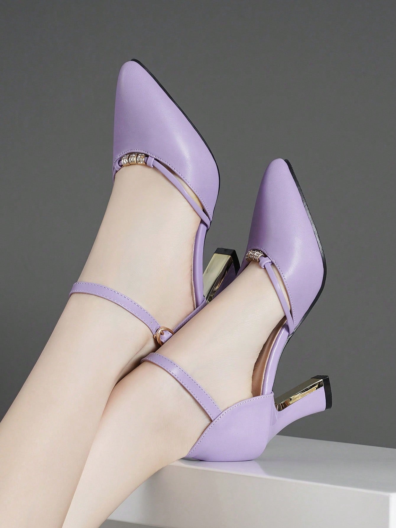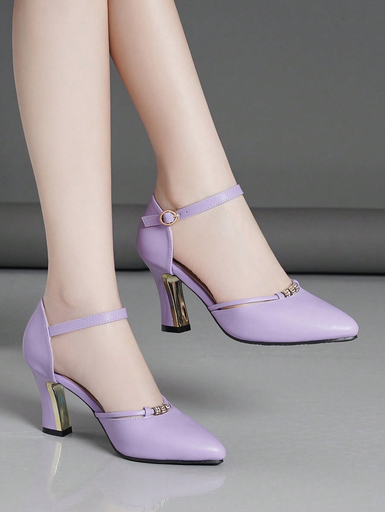 Pointed Toe High Heels Shoes Chunky Heeled Women Hollow Out Buckle Strap Closed Toe With Rhinestone
