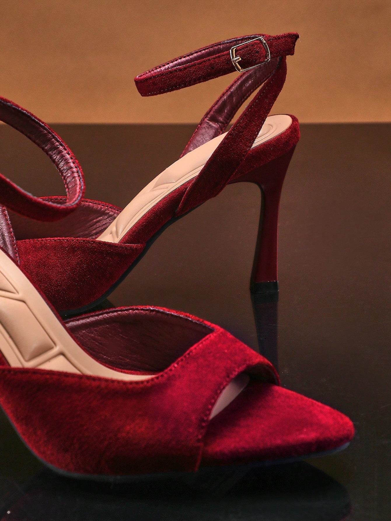SHUZIA Women Comfortable Pointy Toe Burgundy Suede Classic Ankle Strap Heeled Sandals