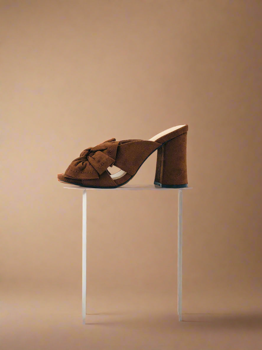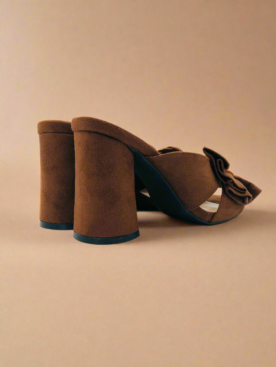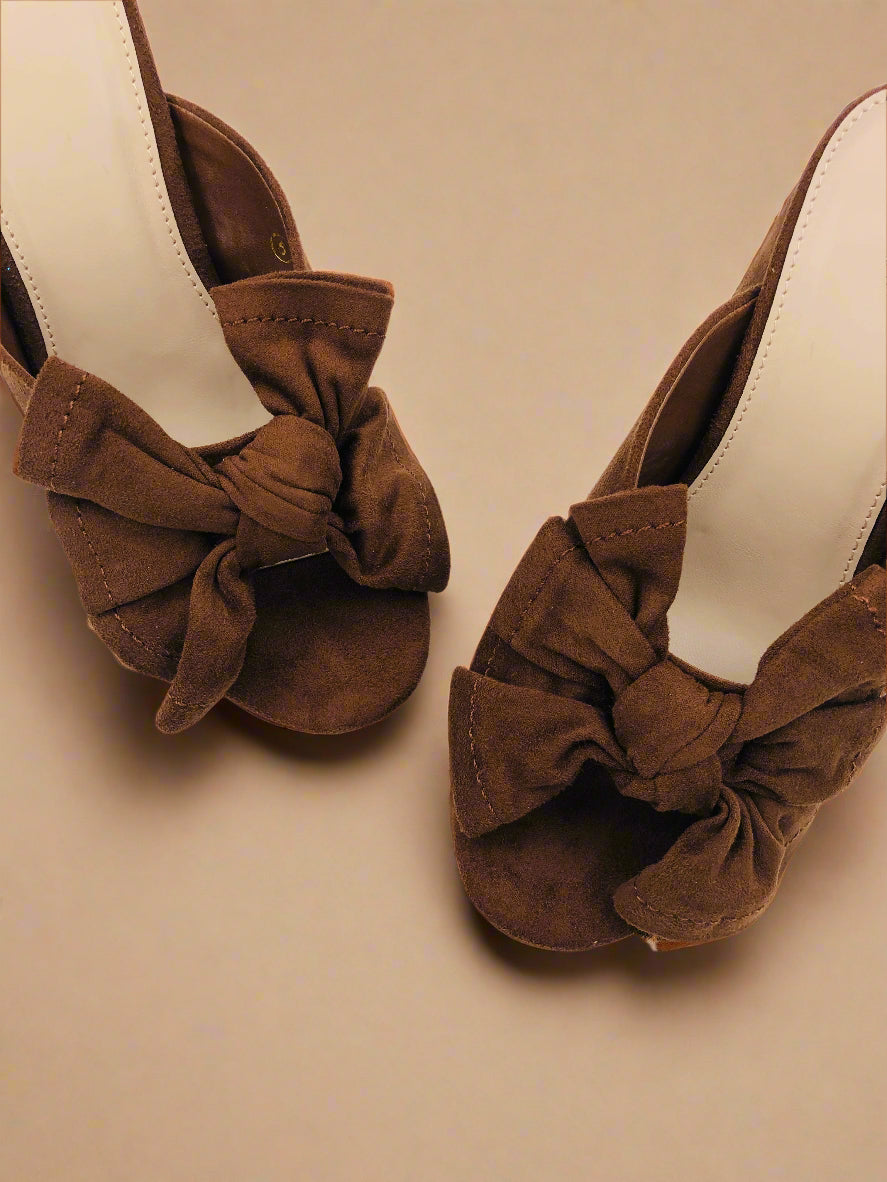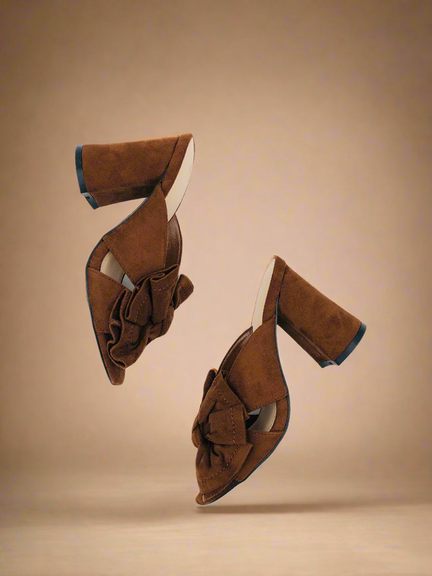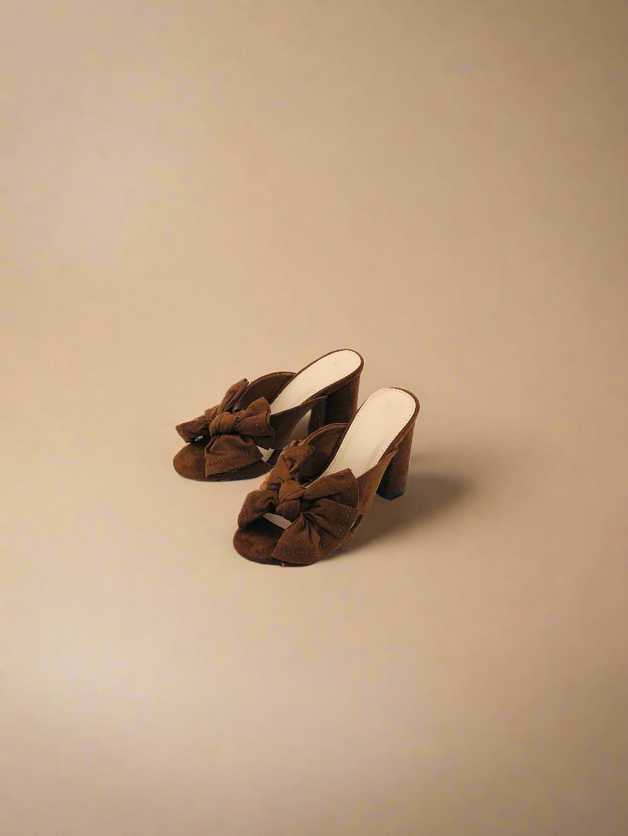Fashionable brown velvet mules with an oversized bow and a thick high-heeled sole, adding a touch of whimsical elegance to any evening ensemble.