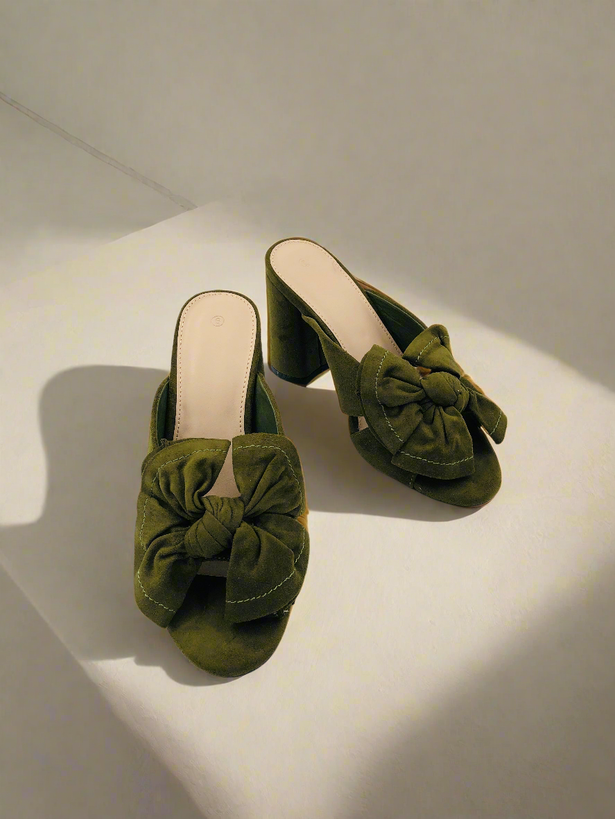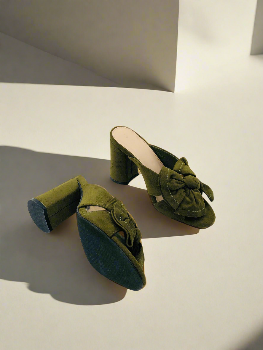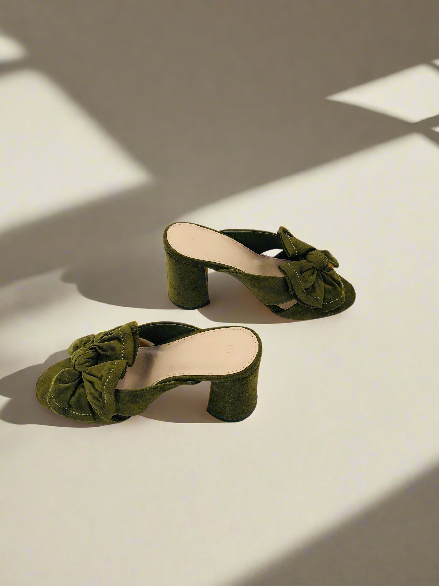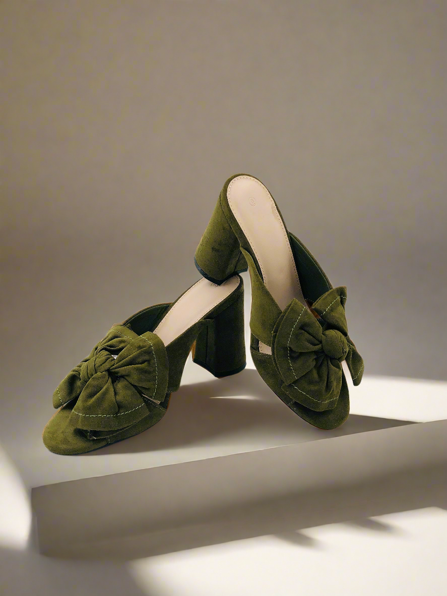 Fashionable Green velvet mules with an oversized bow and a thick high-heeled sole, adding a touch of whimsical elegance to any evening ensemble.