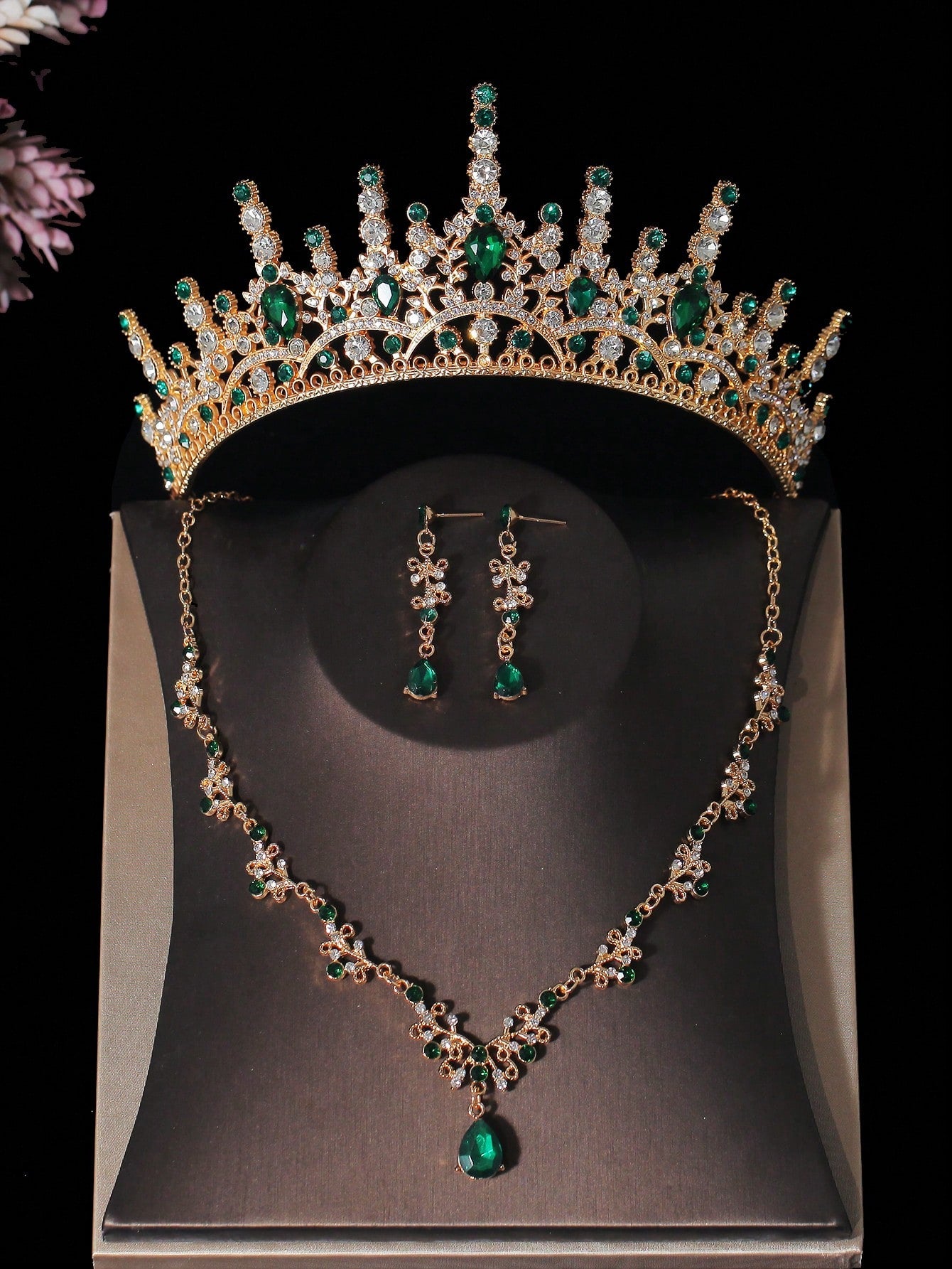 1 Set Golden Bridal Accessories - Green Rhinestone Decorated Crown