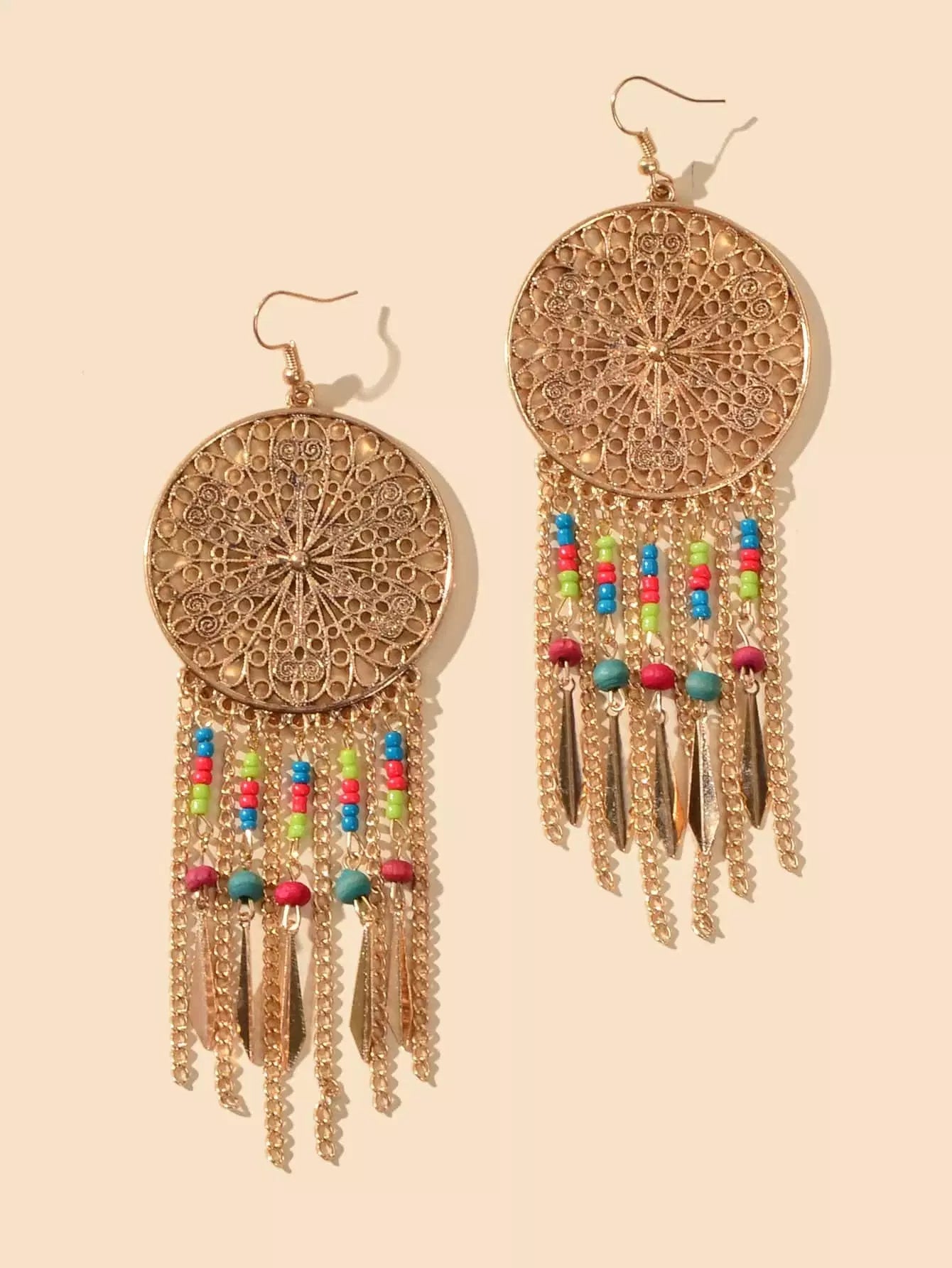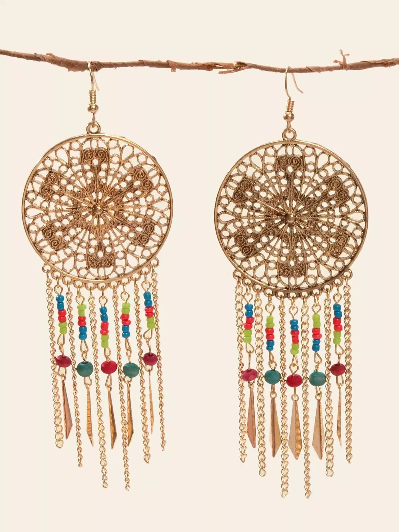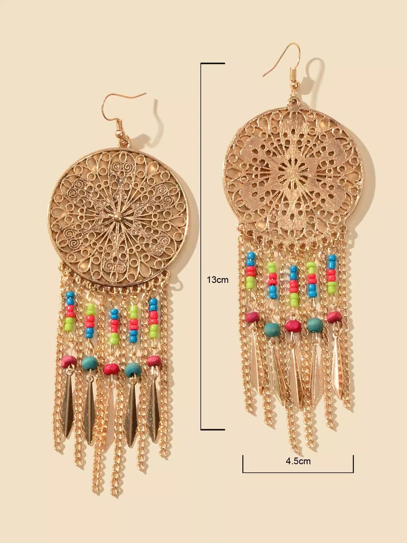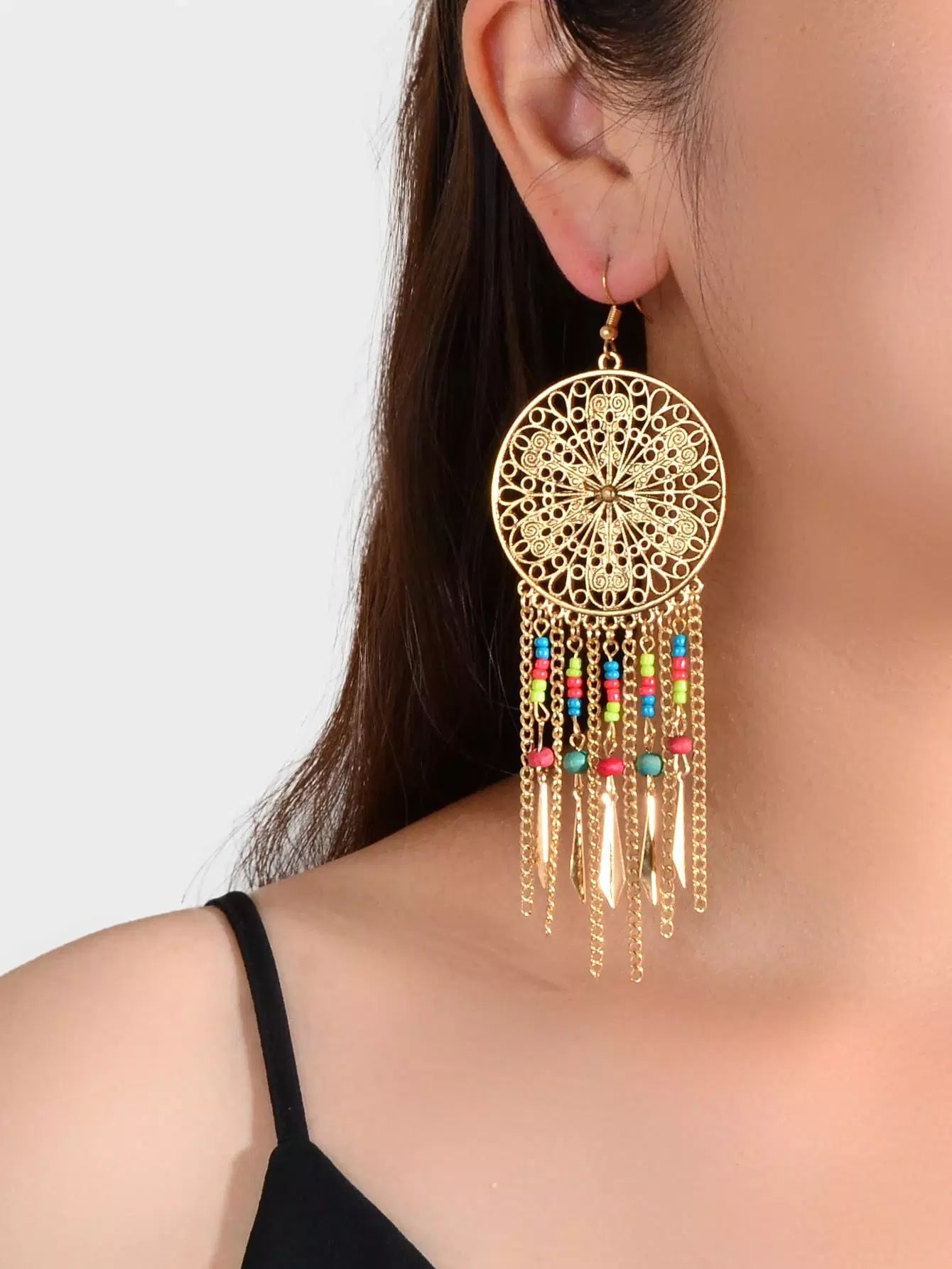 1pair Hollow Out Round Beaded Tassel Drop Earrings