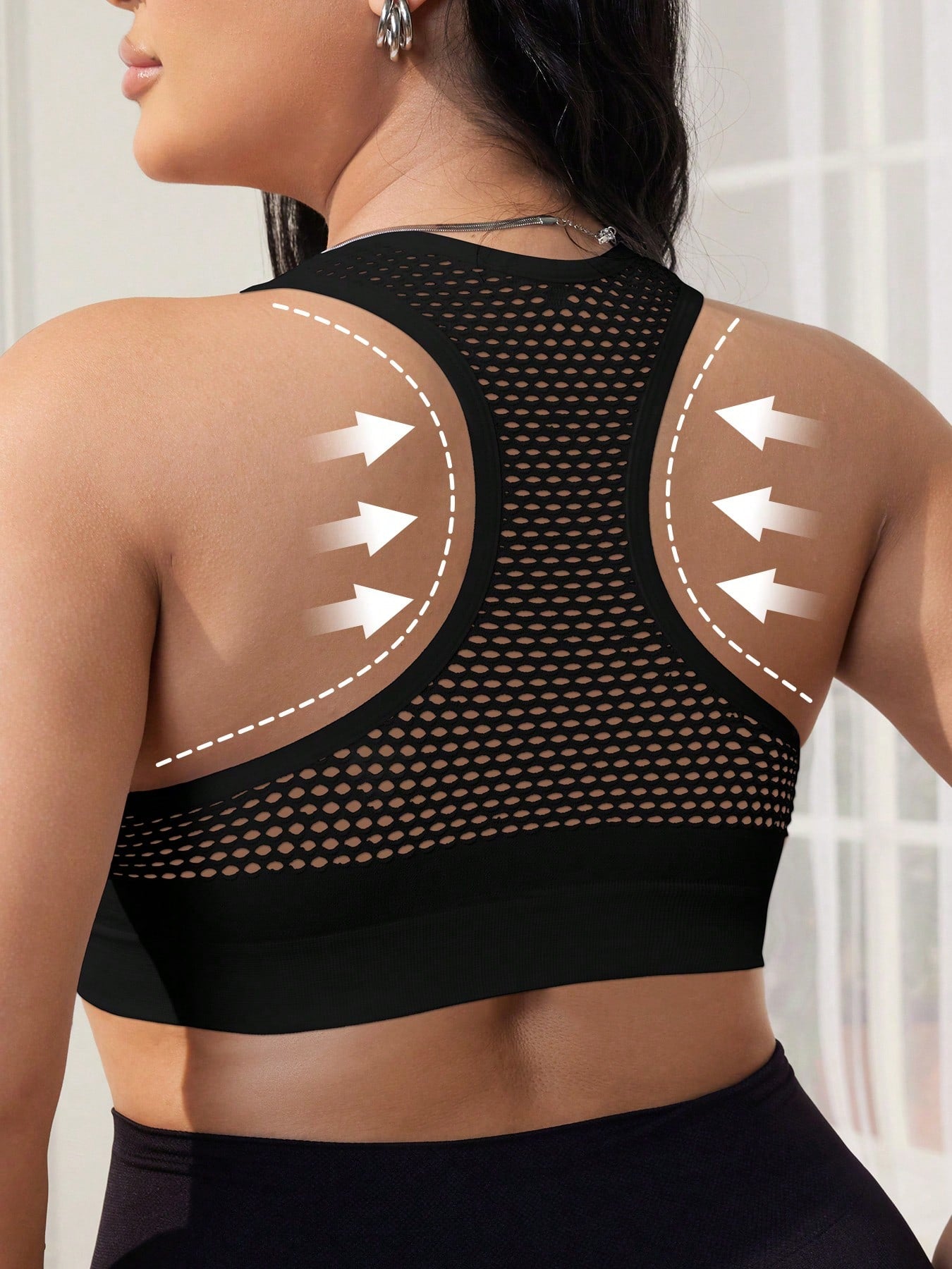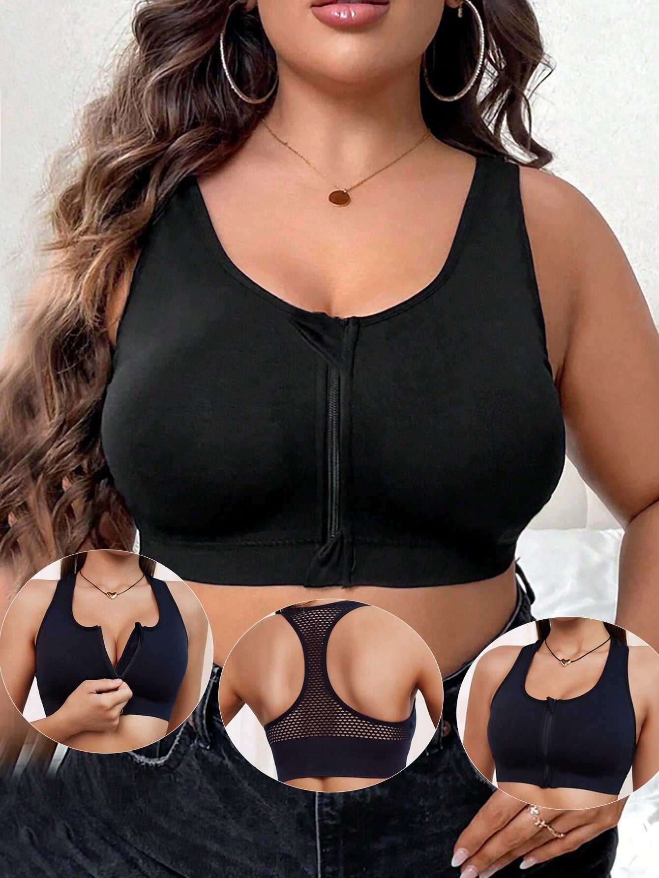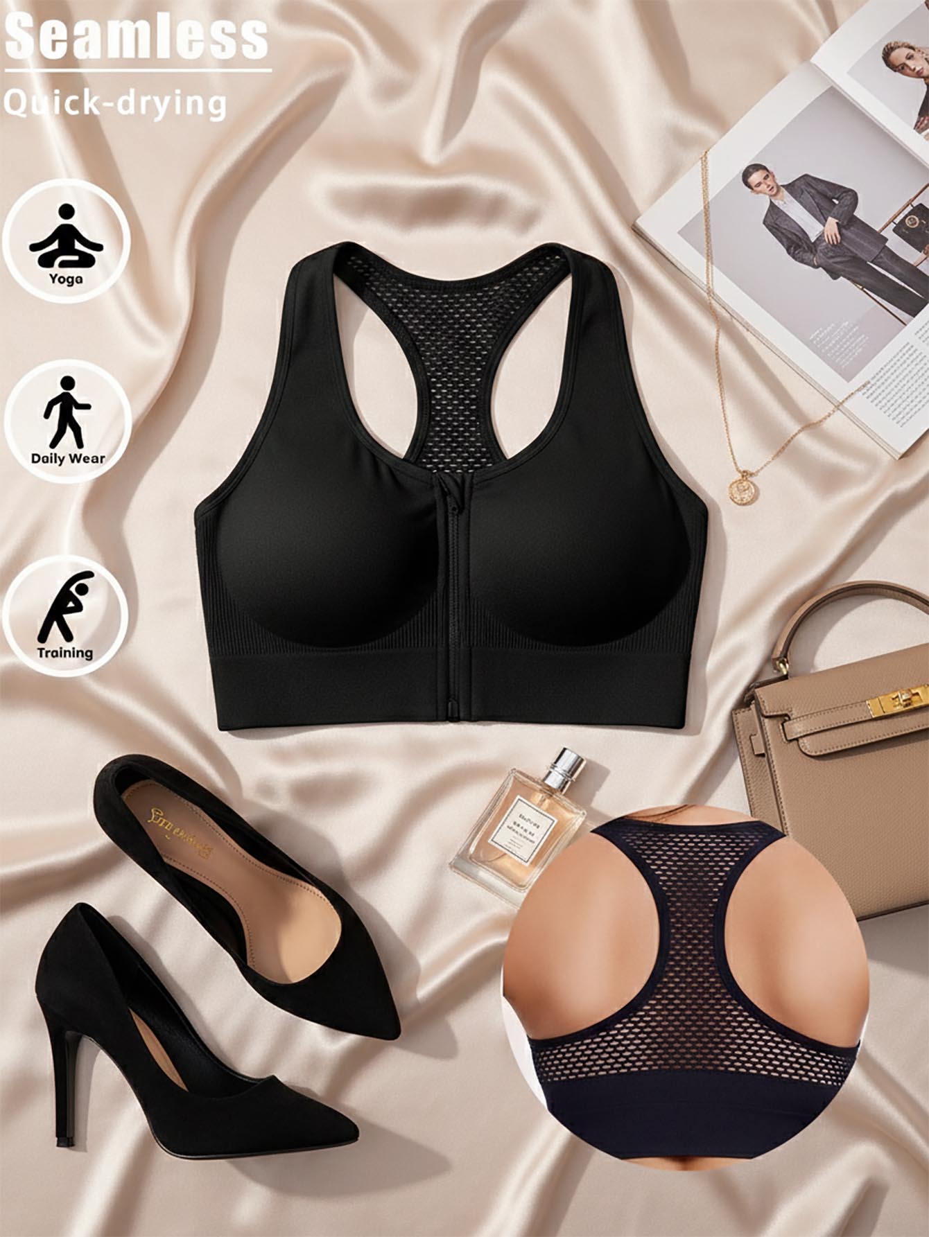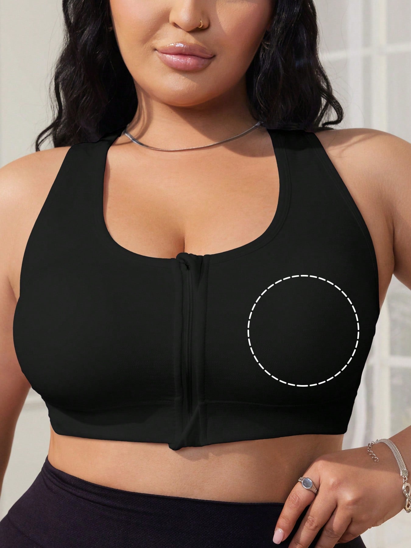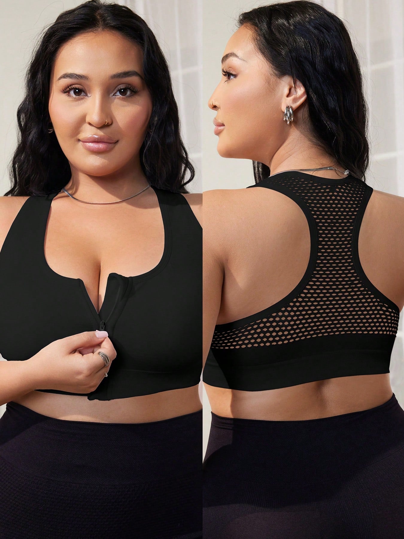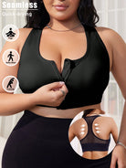 1pc Black Front Zipper Seamless Hollow Out Sports Lingerie Bra