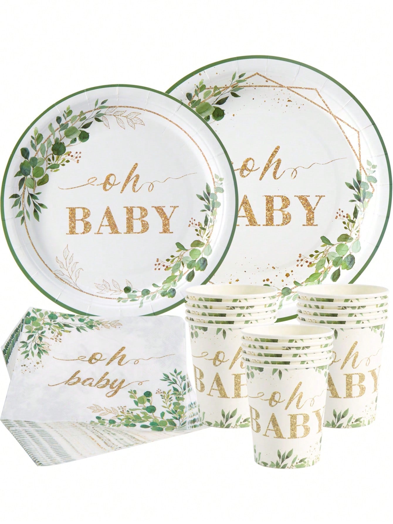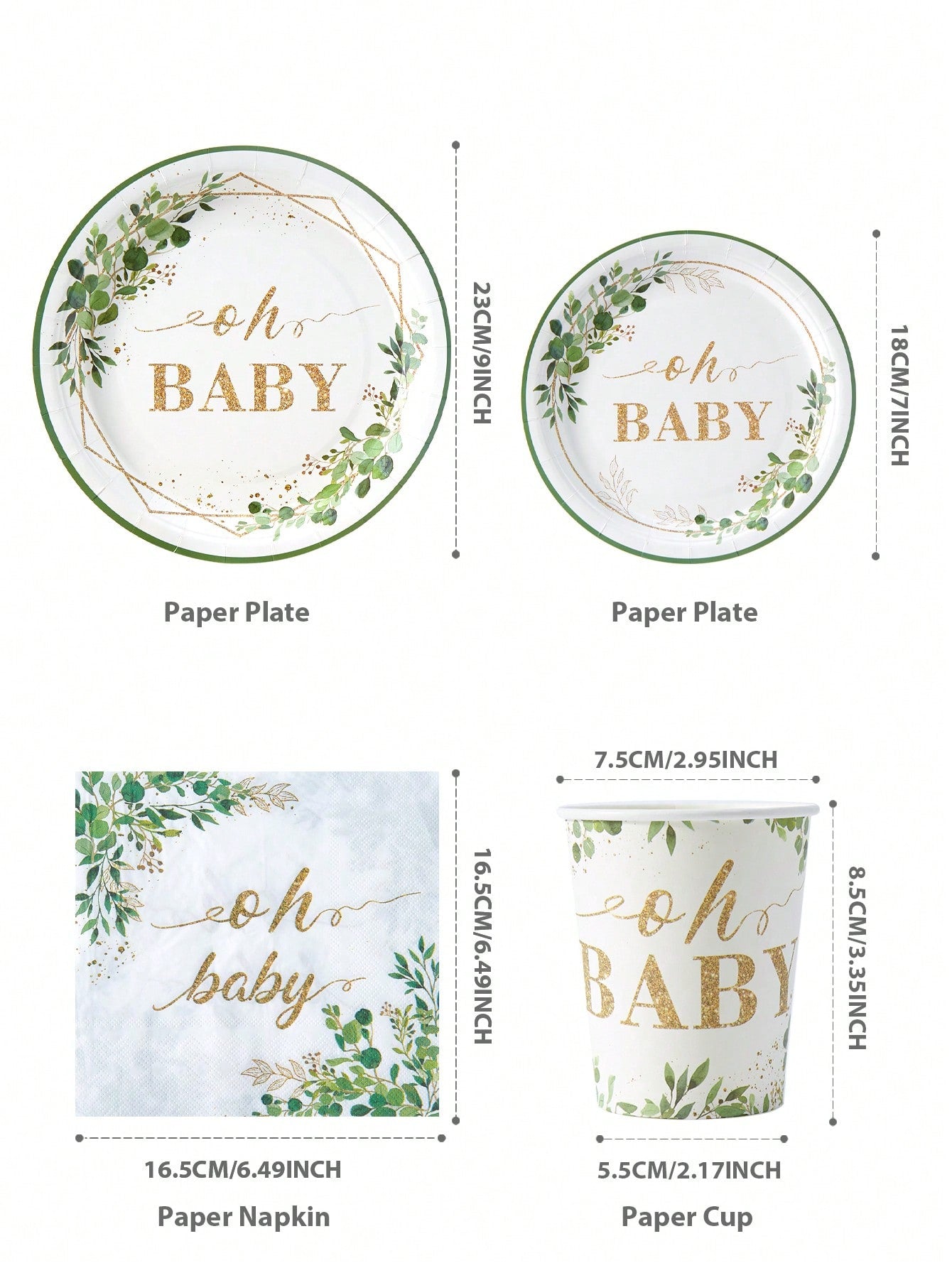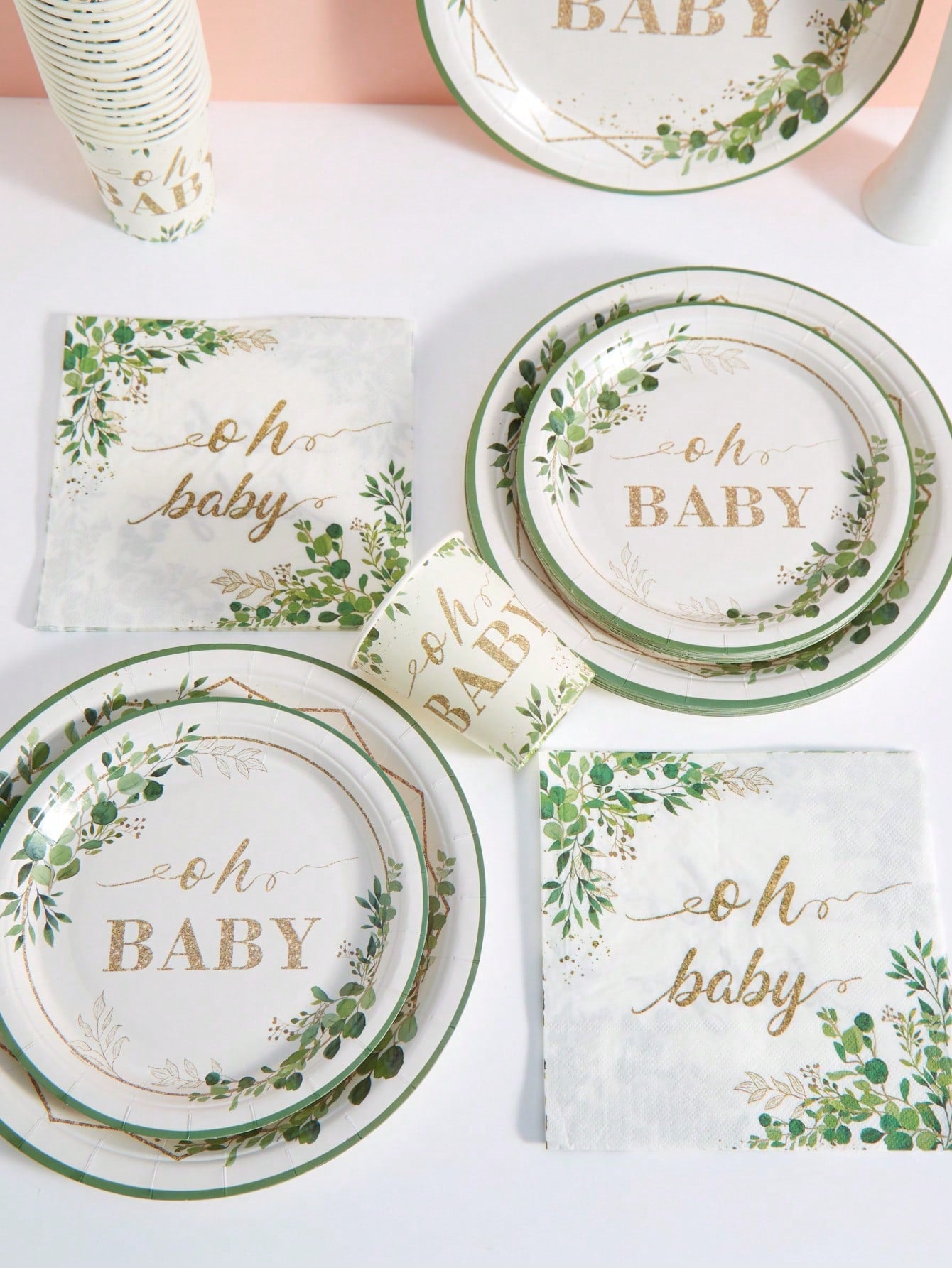 25pcs Green Plant Design Disposable Plate - Napkin & Cup Set