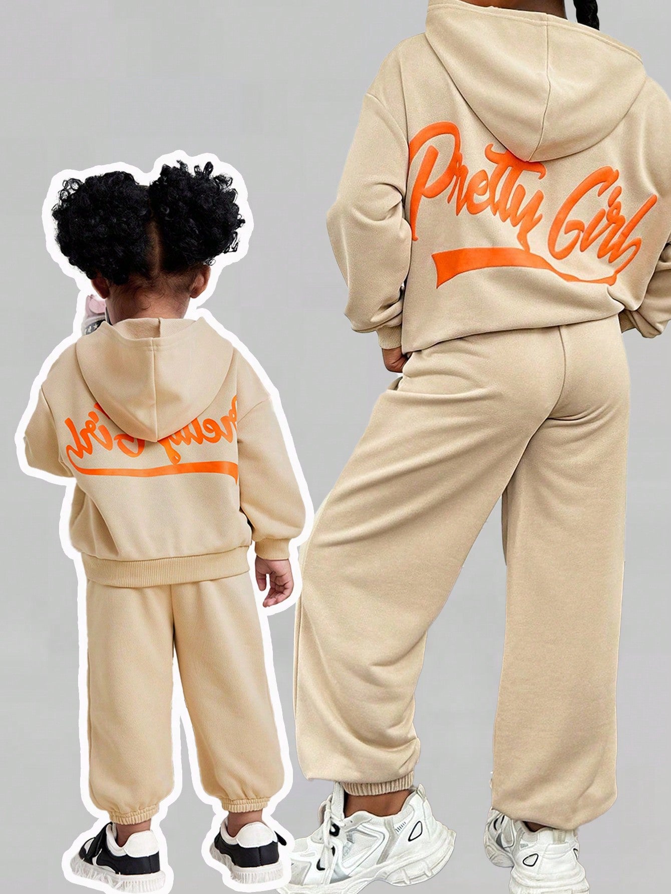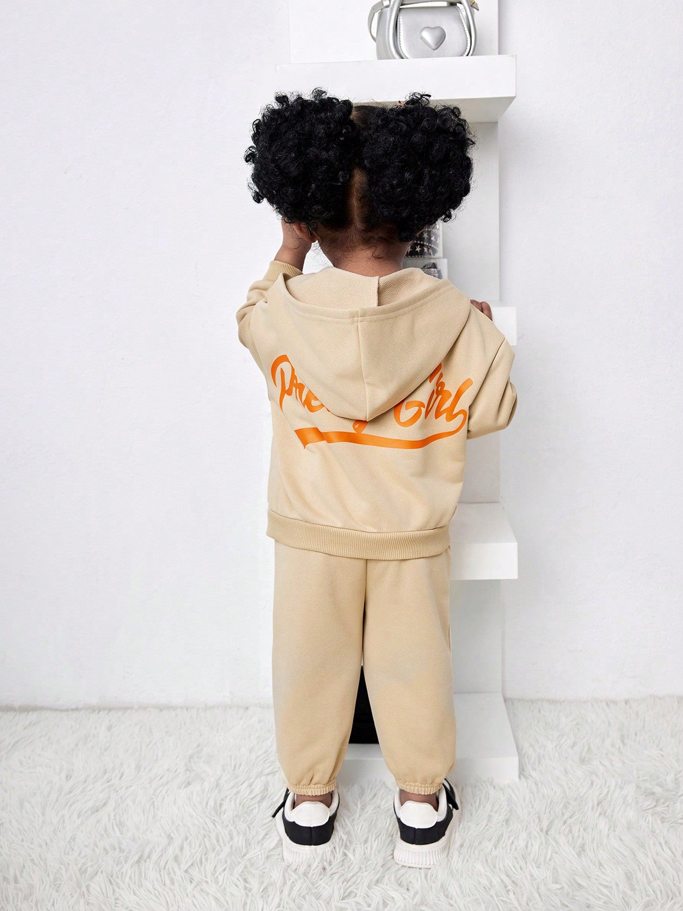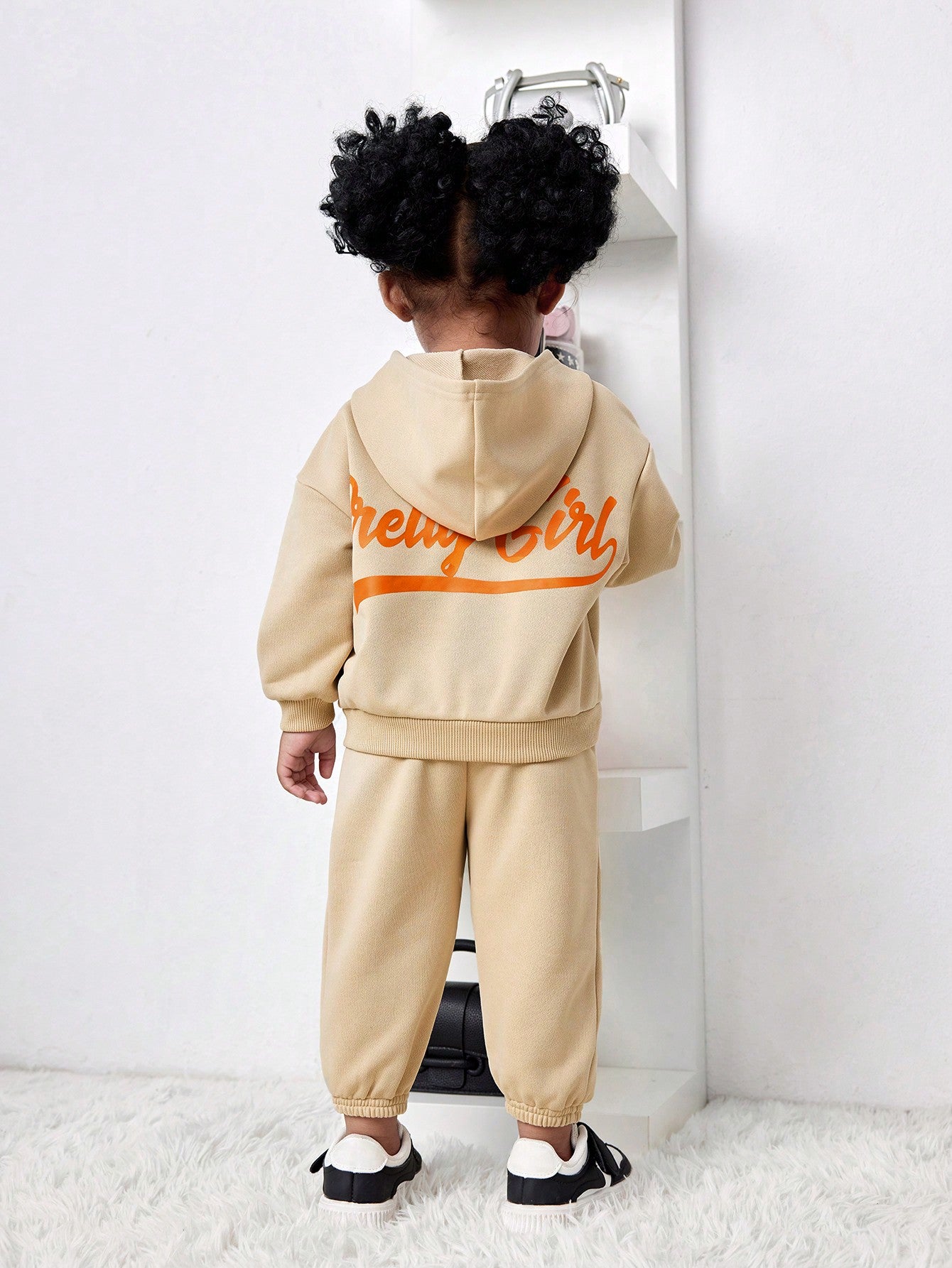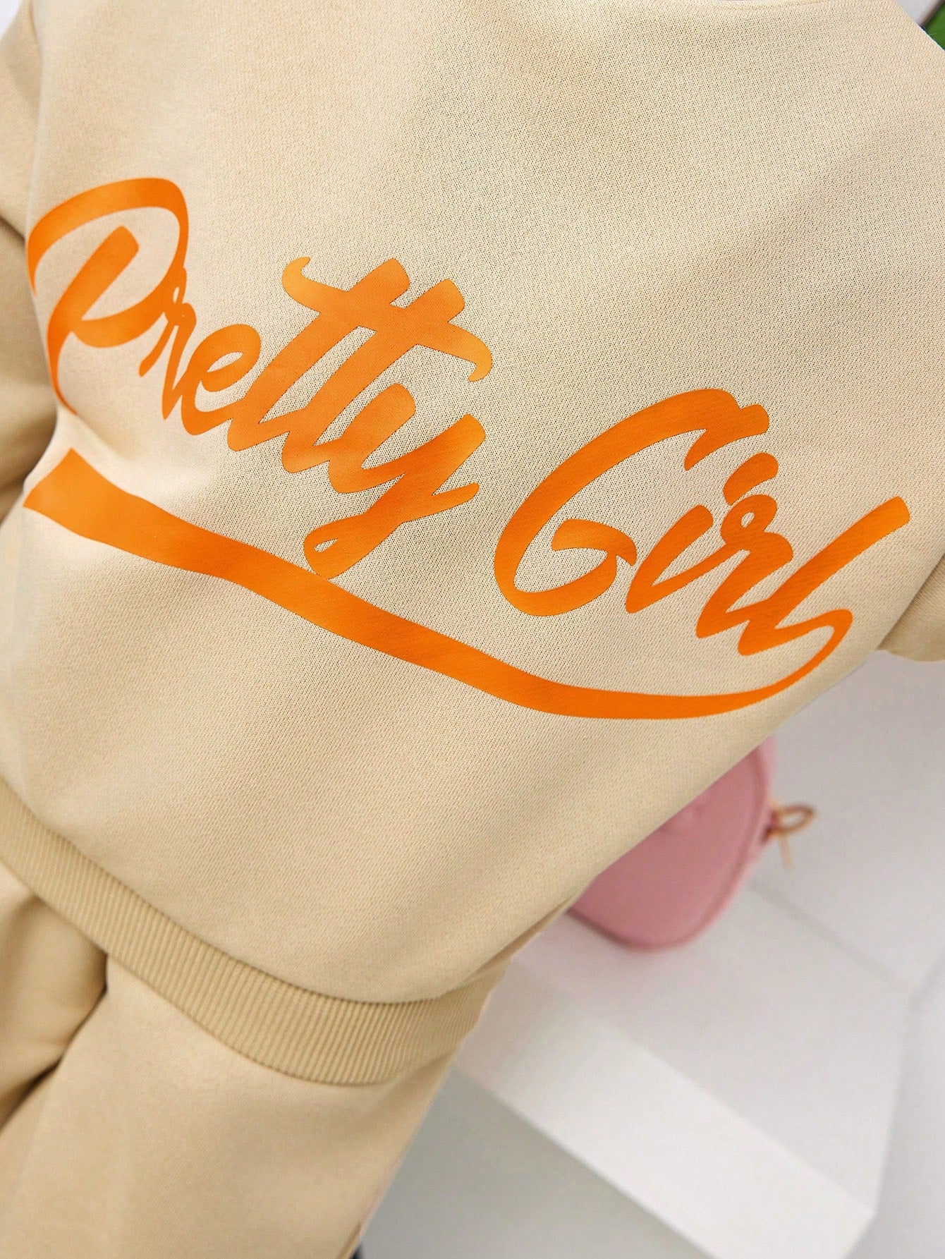 2pcs/Set Baby Girl Fashionable Oversized Slogan Print Sweatshirt And Fleece Pants For Campus, Casual