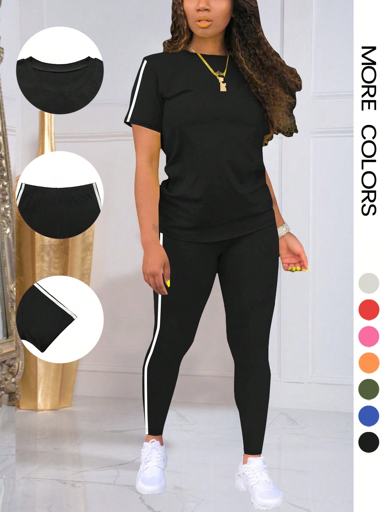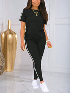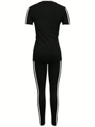 2pcs/Set Fashionable Striped Crew Neck Short Sleeve Activewear Top & Pants Set
