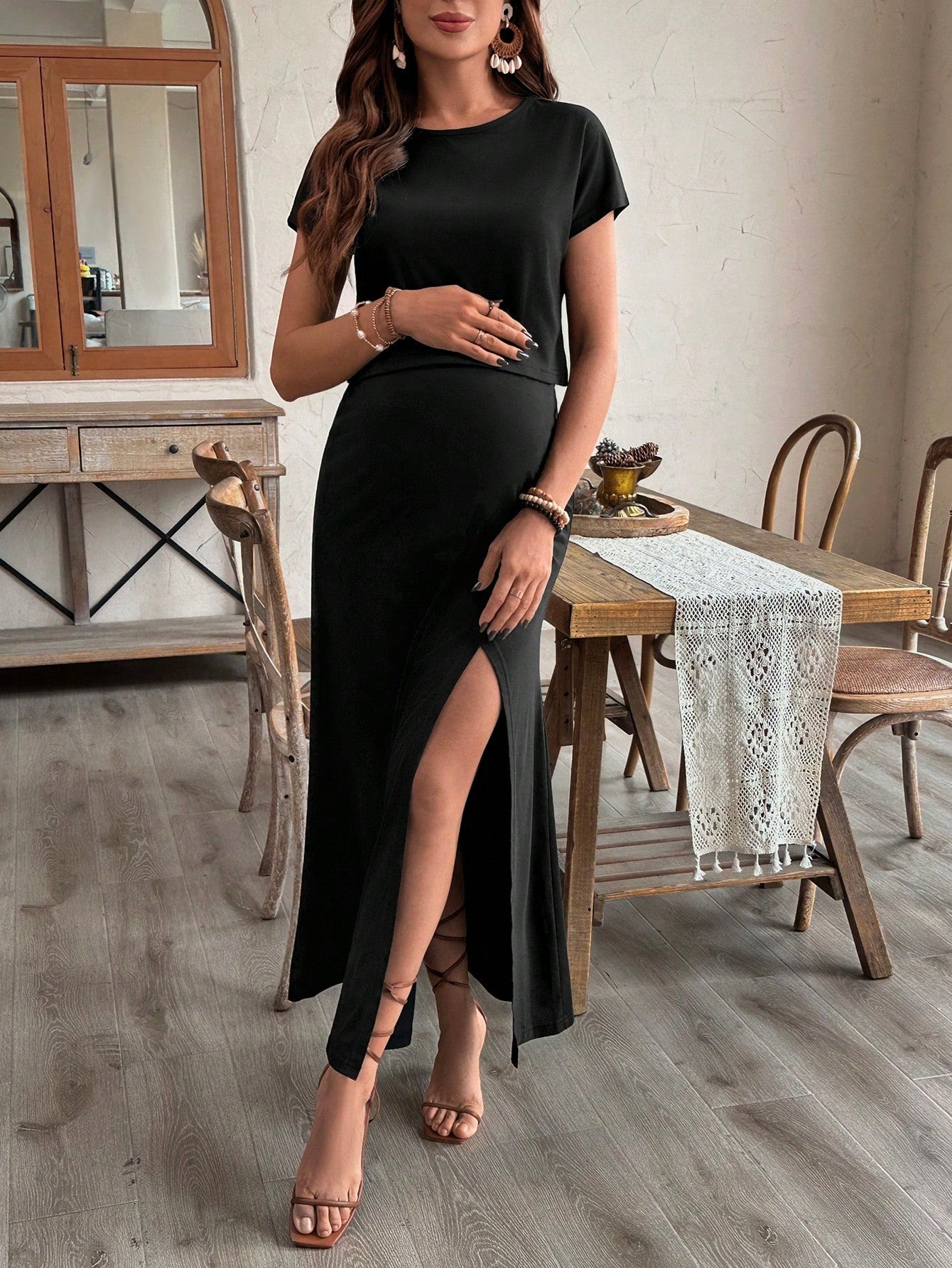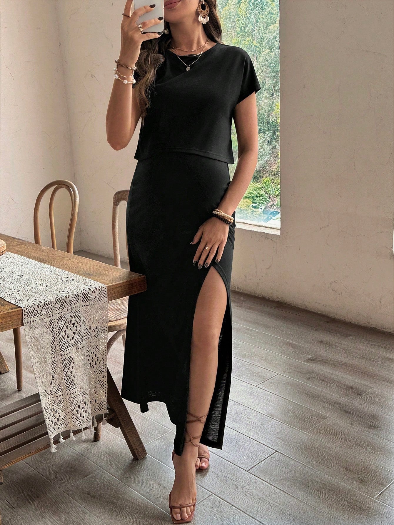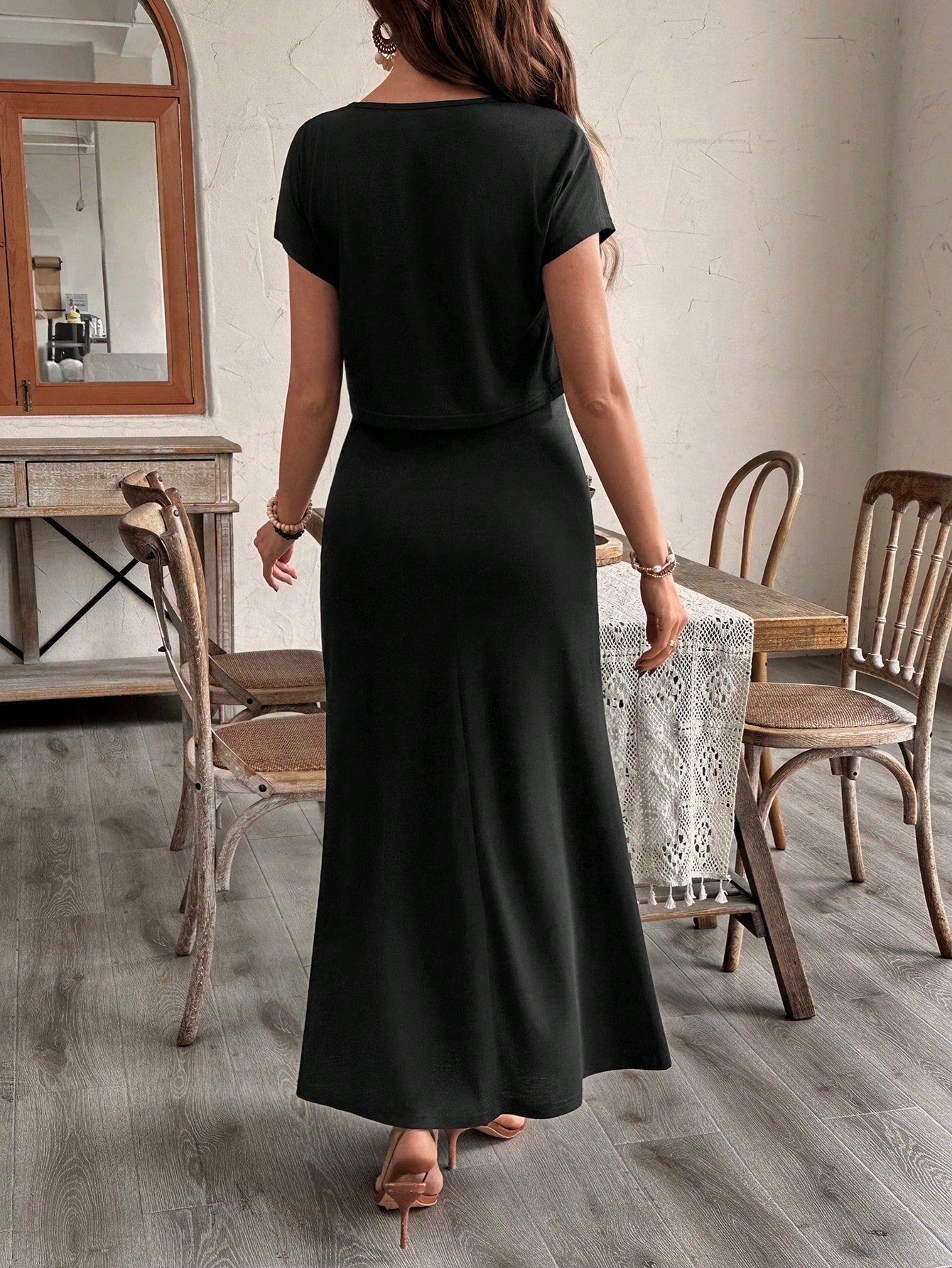 2pcs Solid Color Casual Maxi Dress With Asymmetrical Split Hem And Short Sleeves
