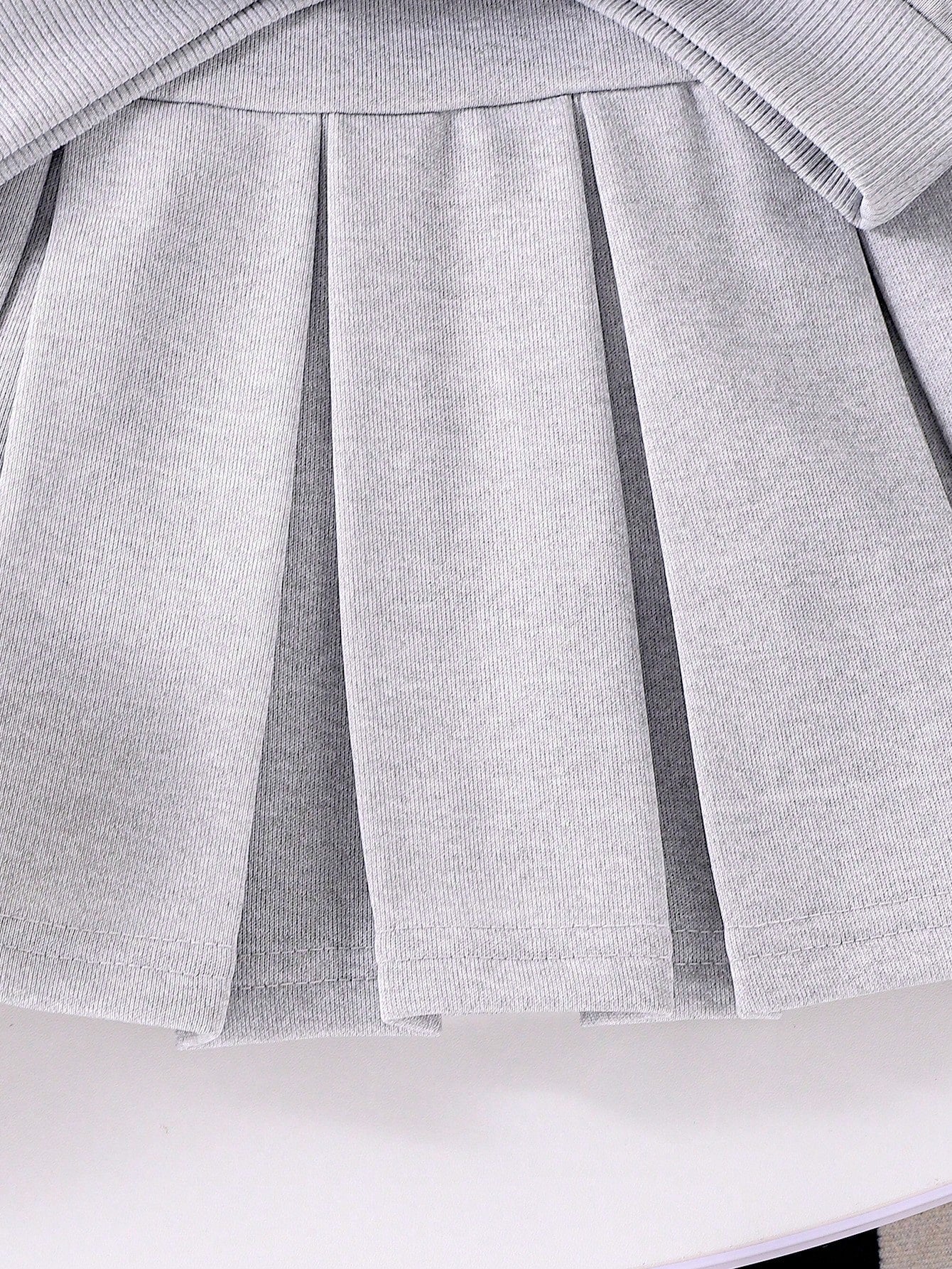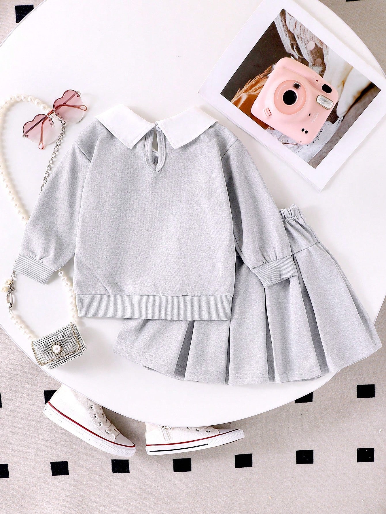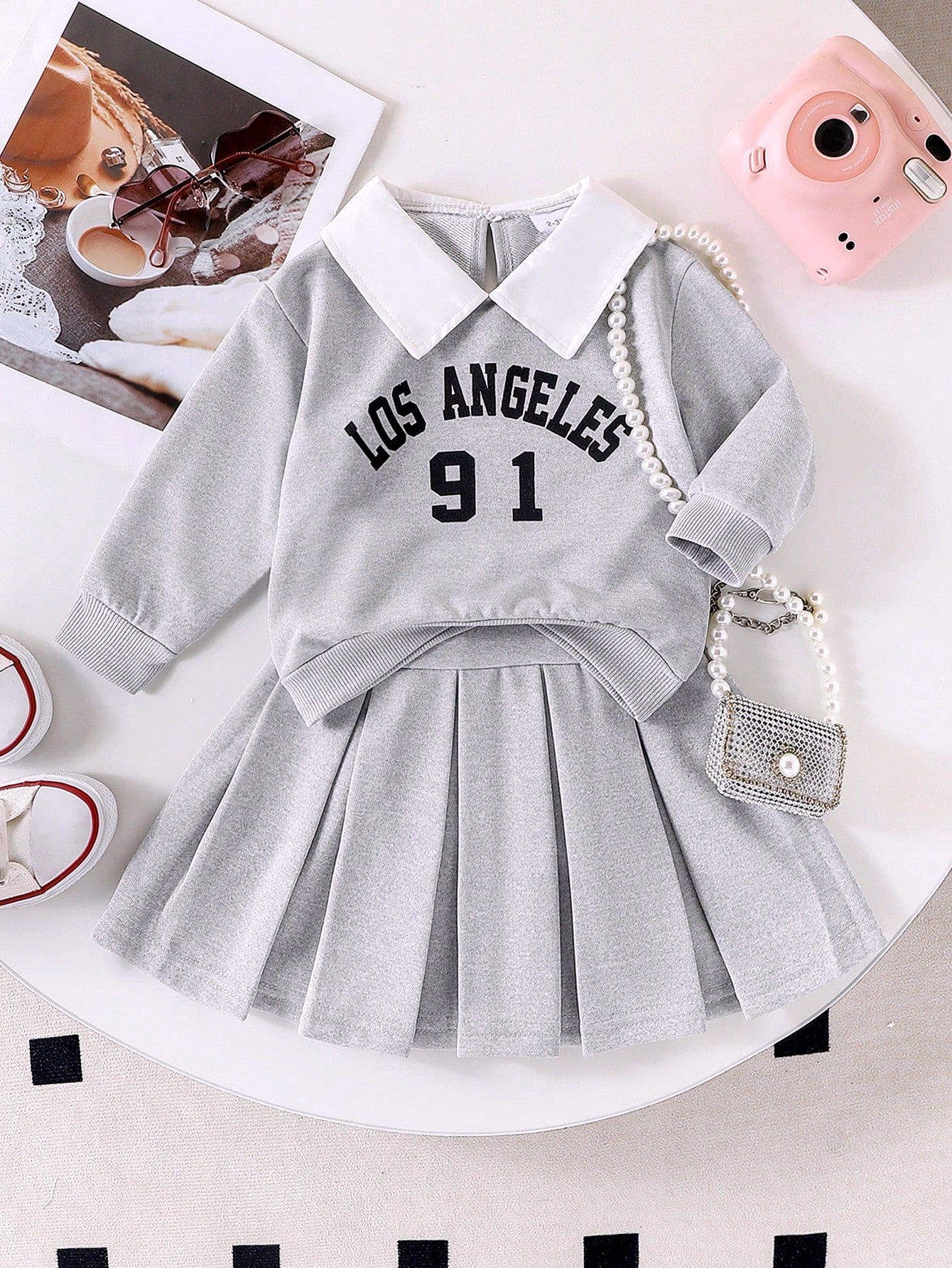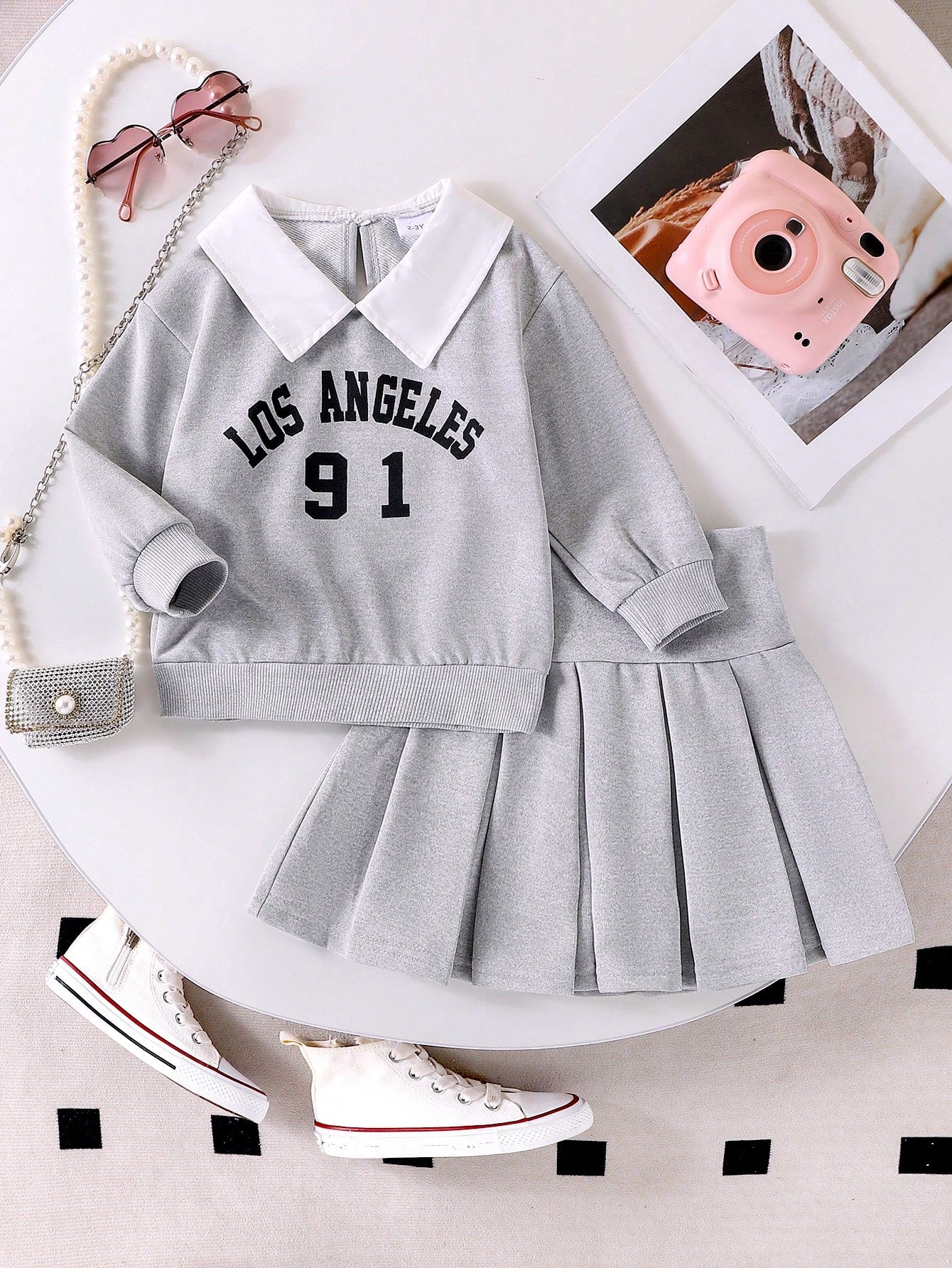 2pcs Young Girl Casual School Style Letter Print Collar Sweatshirt And Pleated Skirt Set