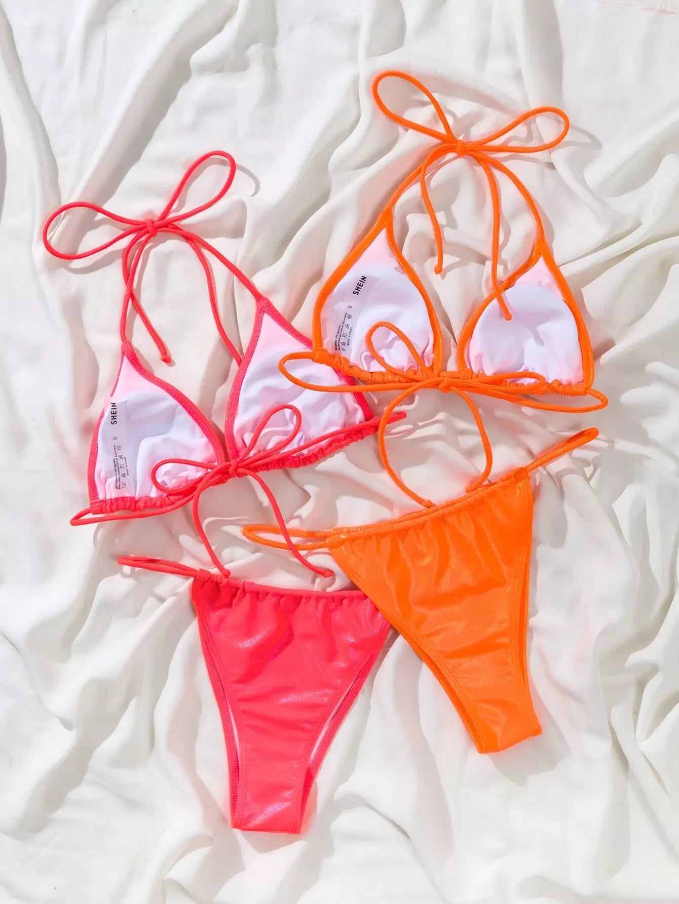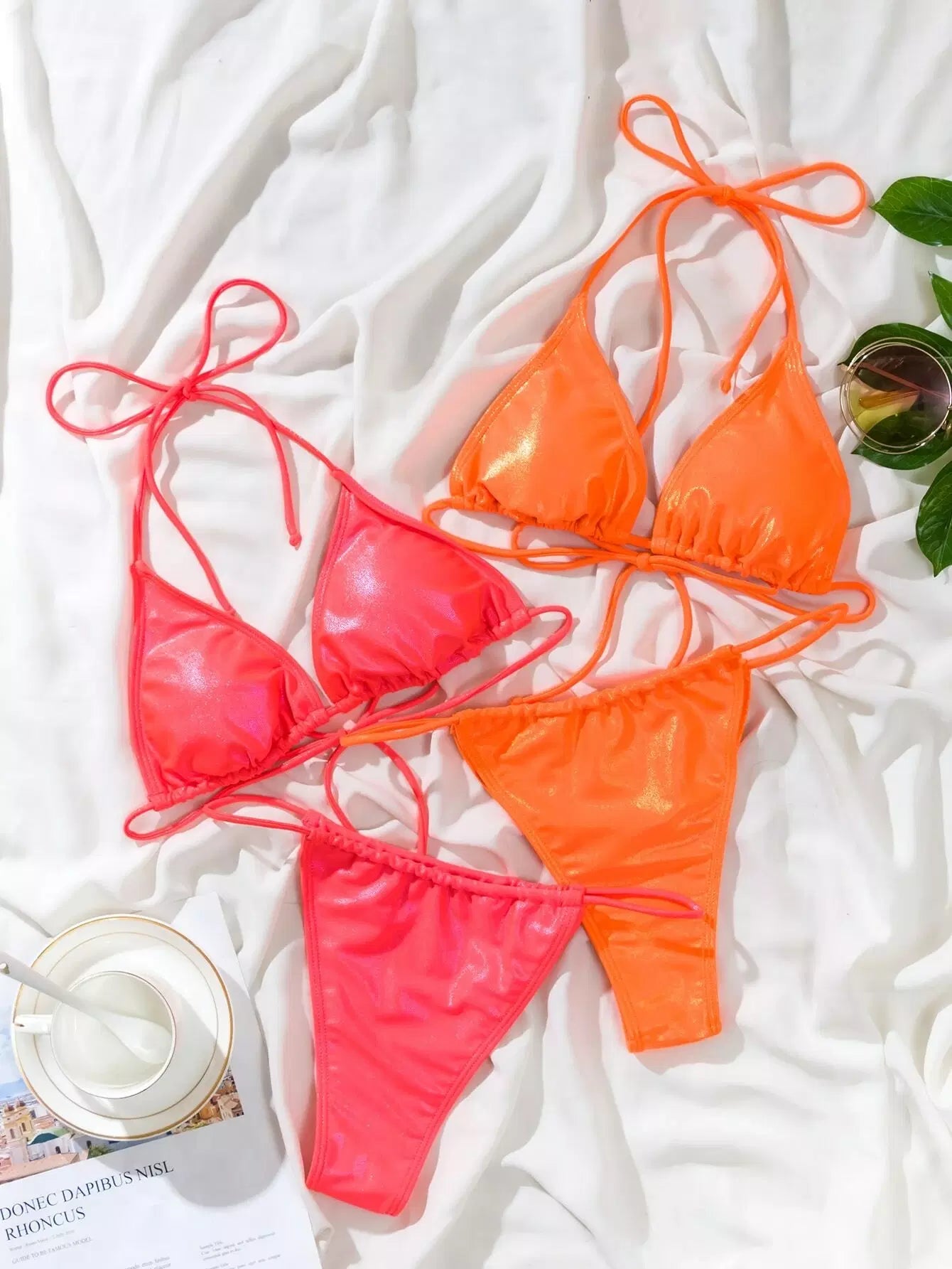 2sets Metallic Triangle Thong Bikini Swimsuit