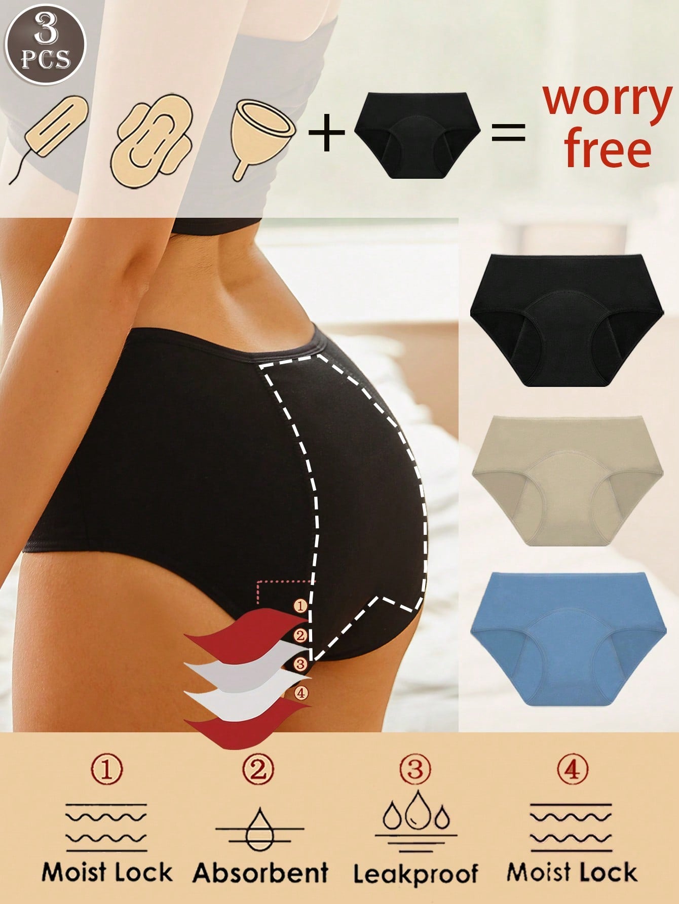 3pcs/Set Women Anti-Leakage Period Underwear - Comfortable Breathable Low-Waist Menstrual Panties