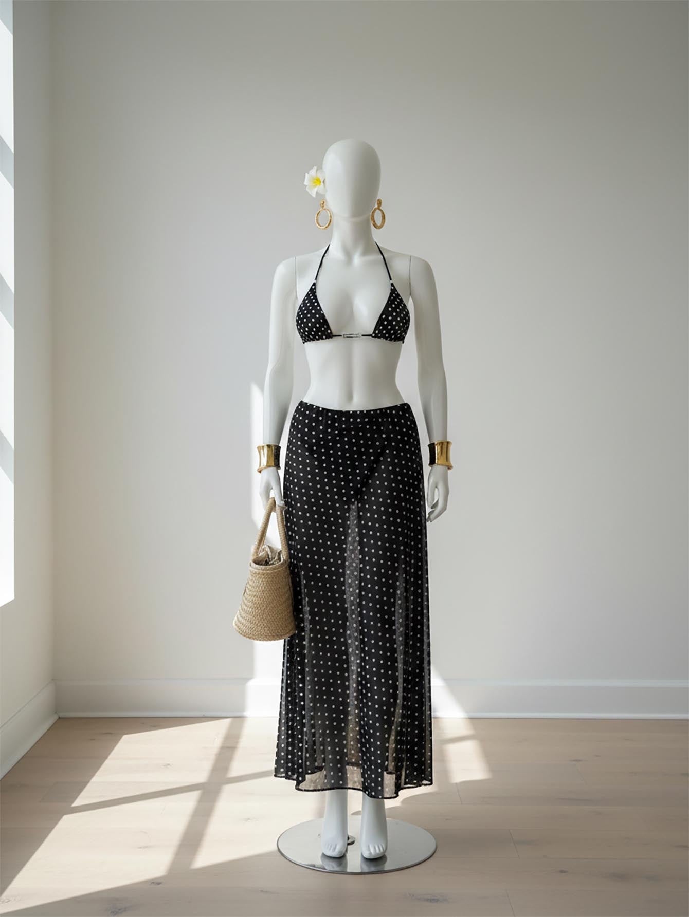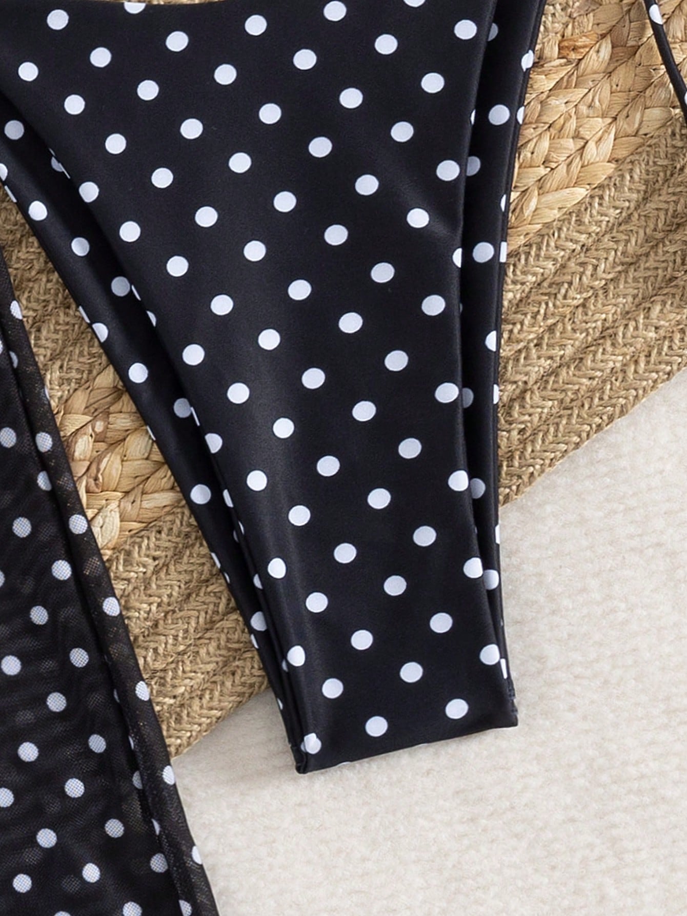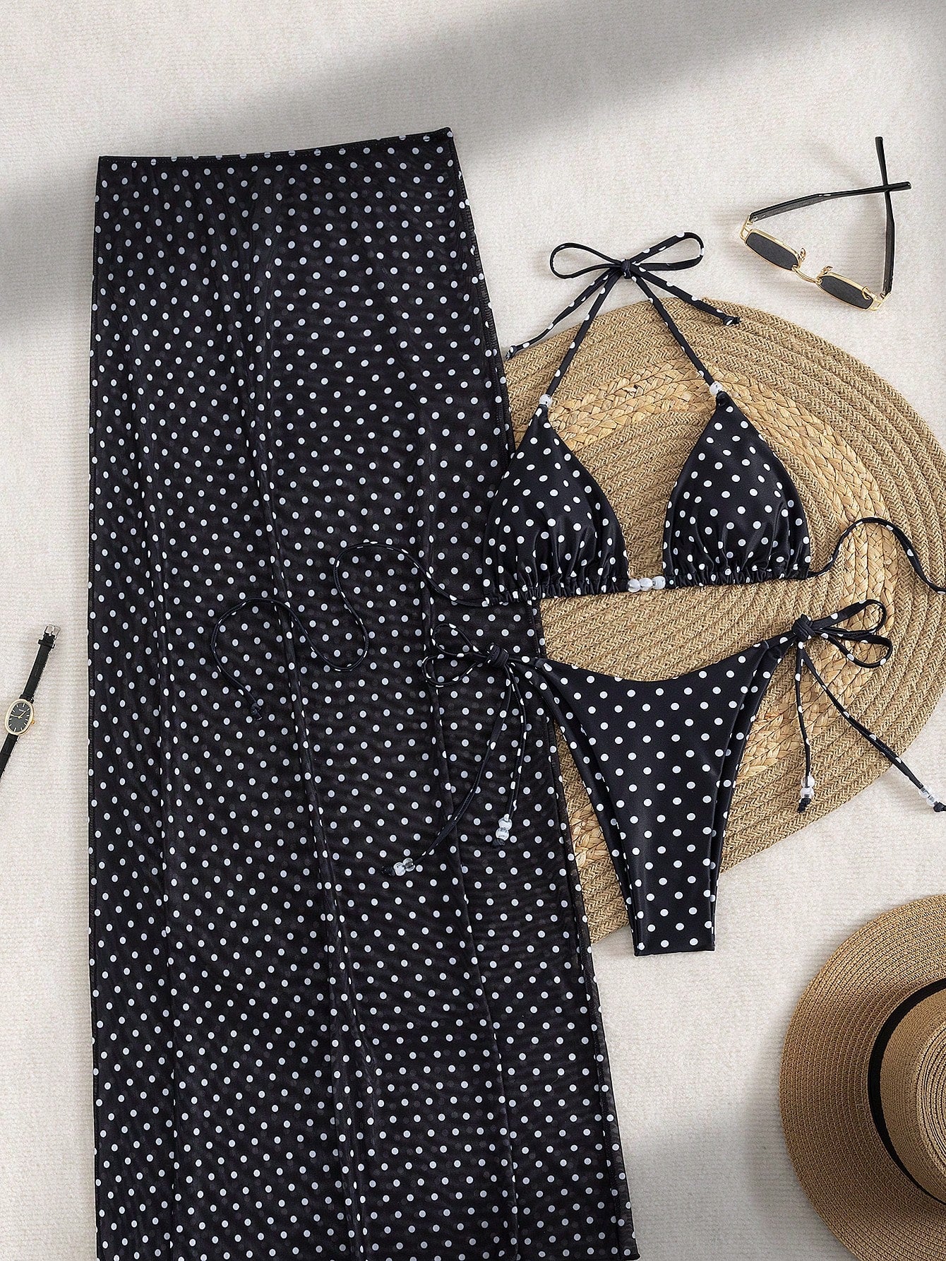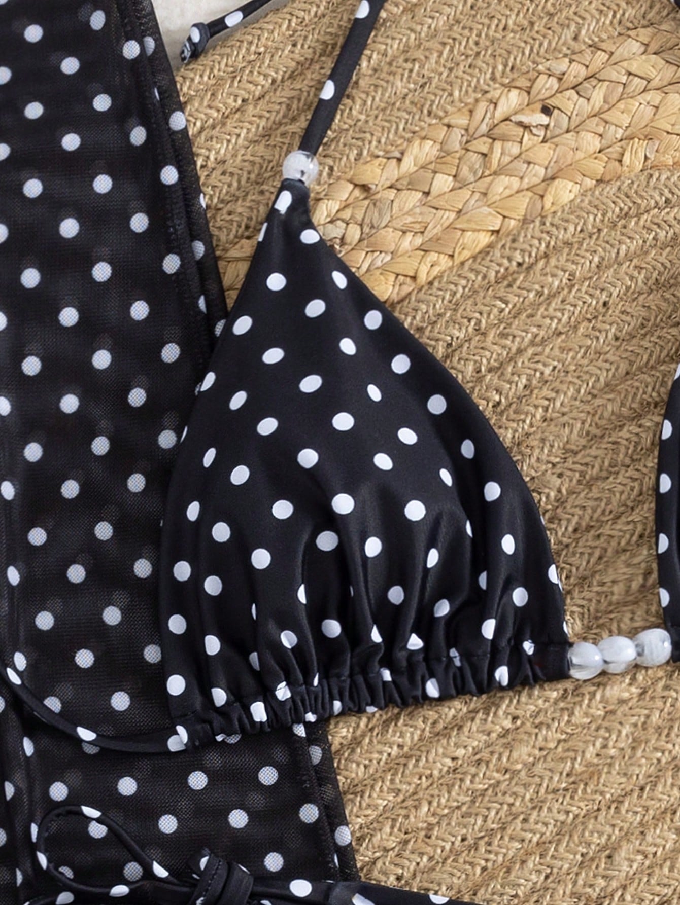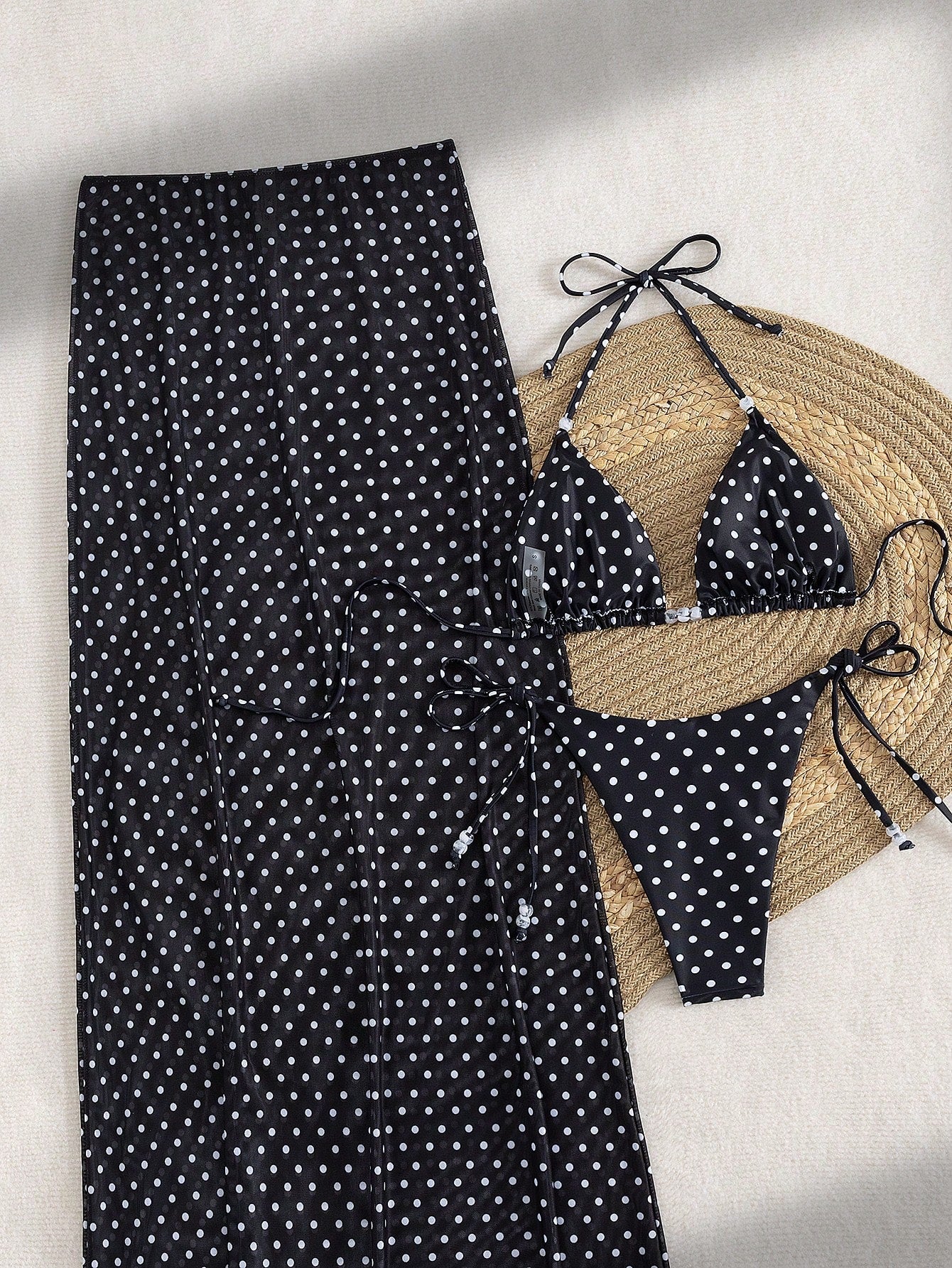 3pcs/Set Women's Summer Sexy Polka Dot Print Halter Bikini Set With Mesh Cover-Up Skirt